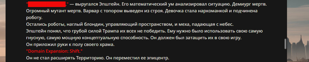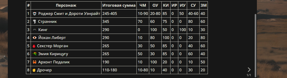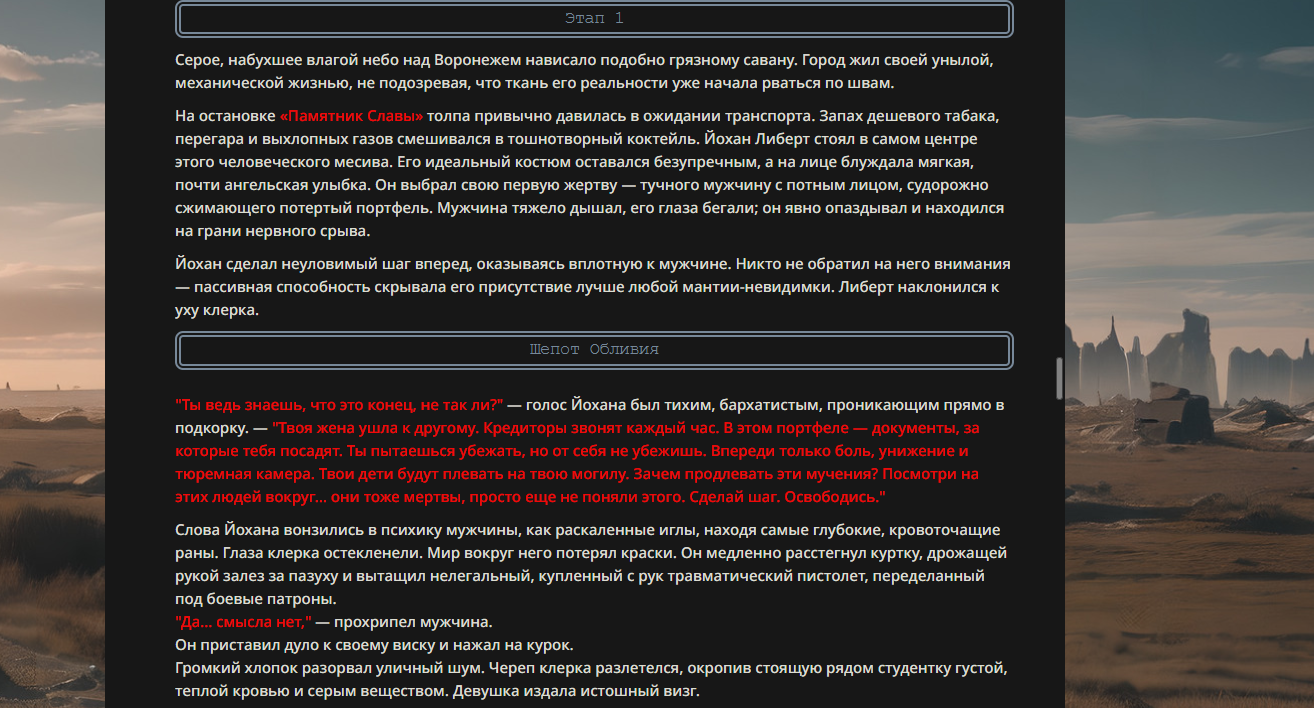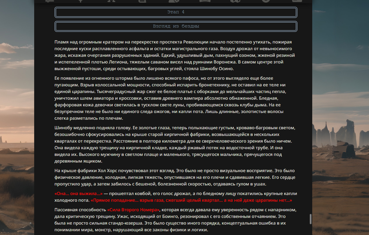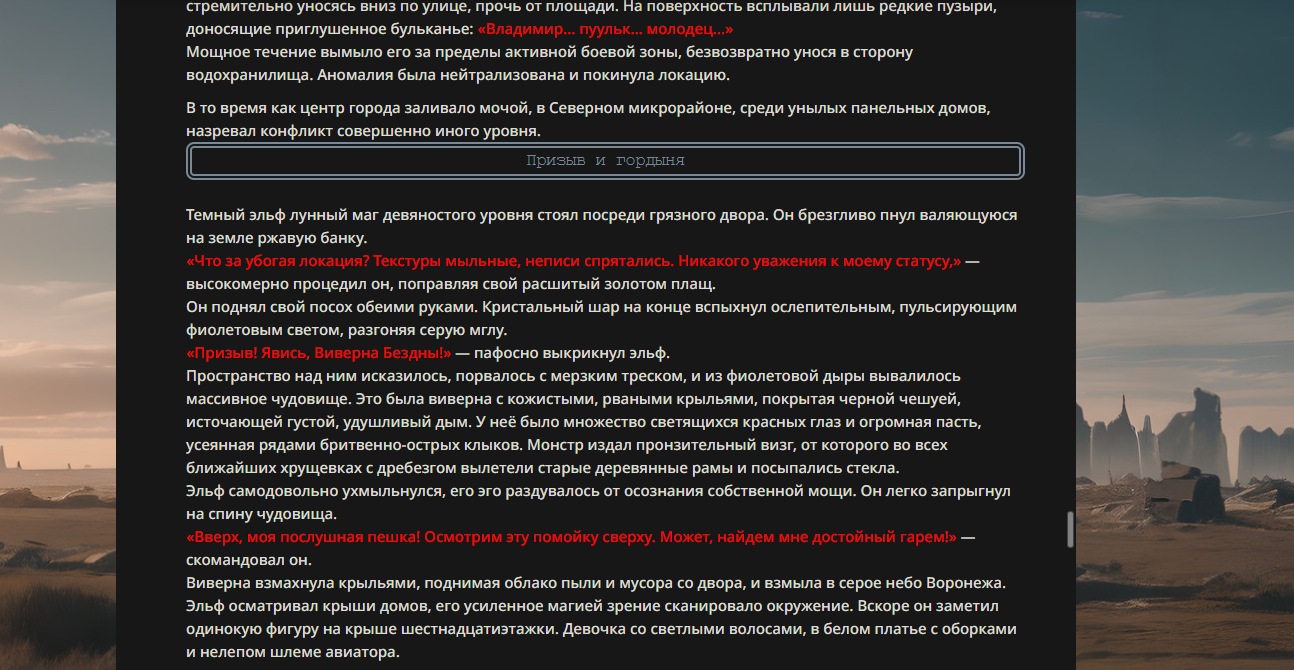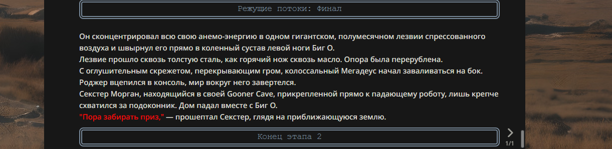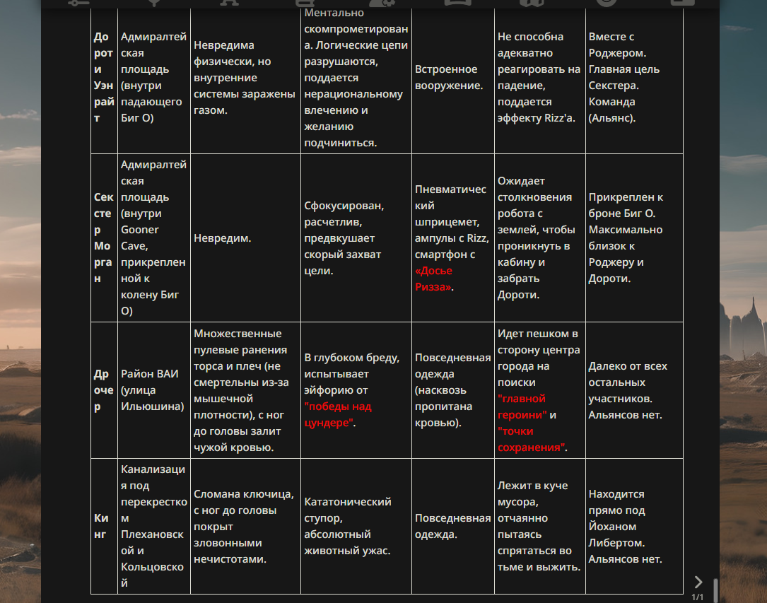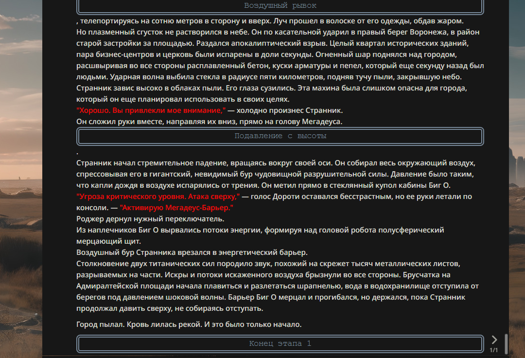 >>330178991 >Желание и сейчас оценки сделаю по просьбе. > >Секунду, шиза в желаниях. (Сверкаю глазами, потираю руки) Отлично! Шиза в желаниях — это прекрасно. Значит, игроки будут выбивать друг другу не просто "силу" или "богатство", а максимально неудобные, ироничные или абсурдные призрачные мечты. Жду списка желаний от каждого персонажа (можно в личку или сюда, если хочешь сохранить интригу). Как только желания будут определены — кидаю кости первого раунда и описываю кровавую (или не очень) мясорубку на Гемини 3.1.