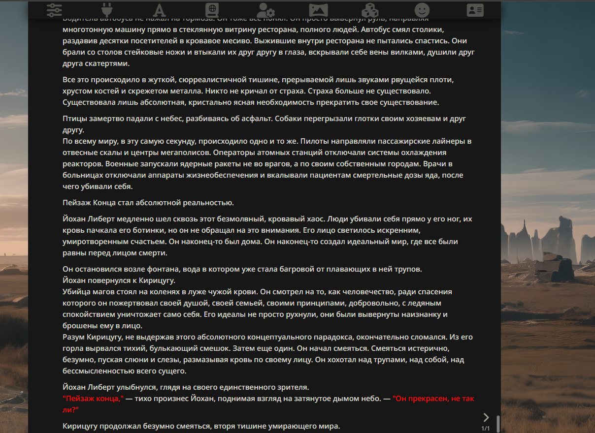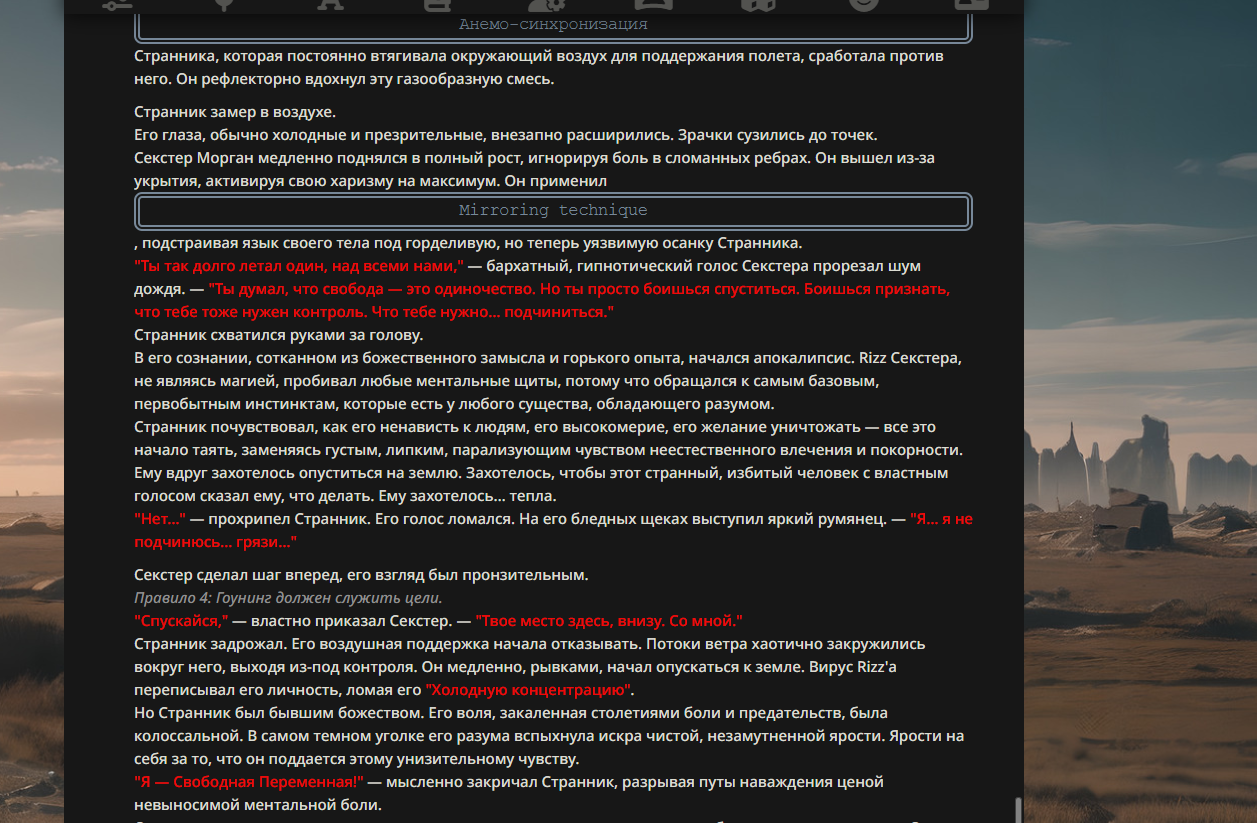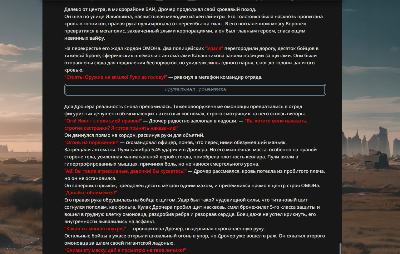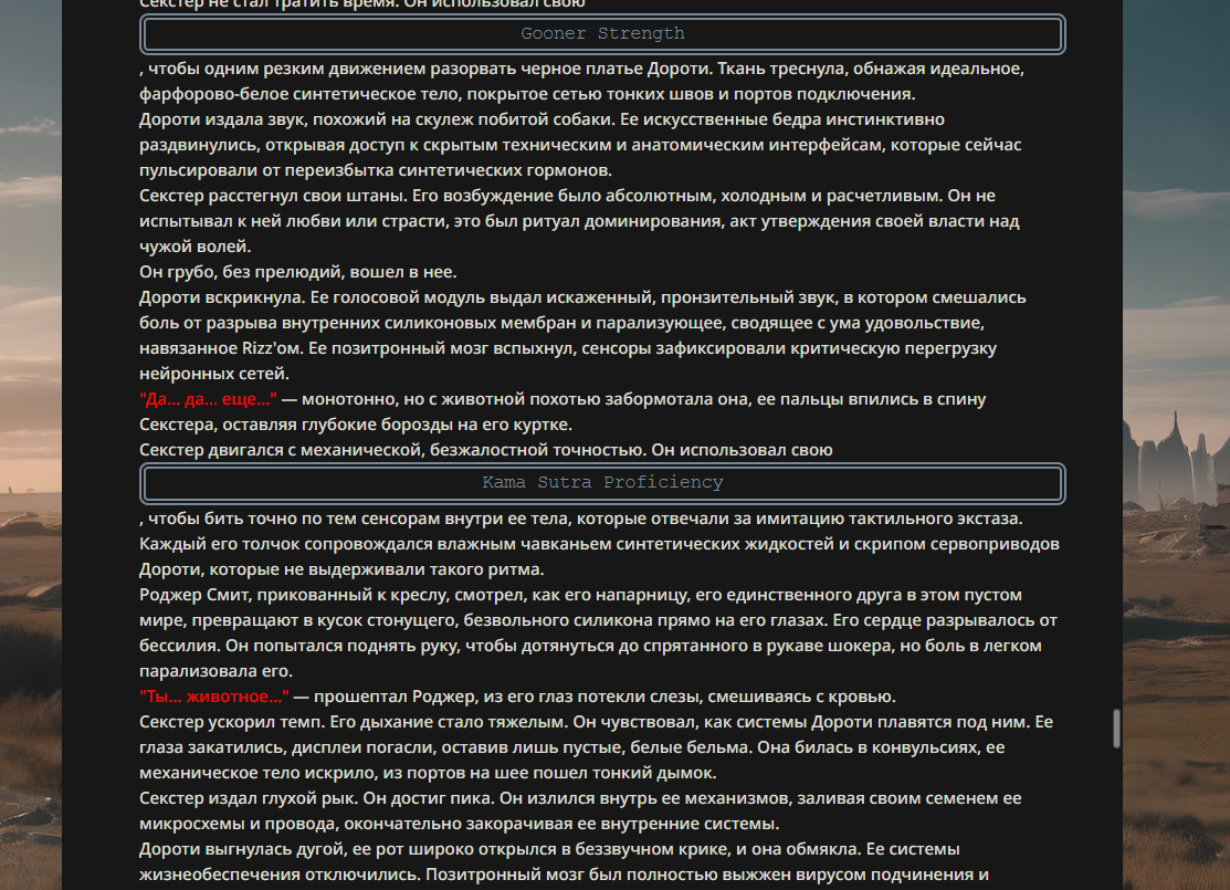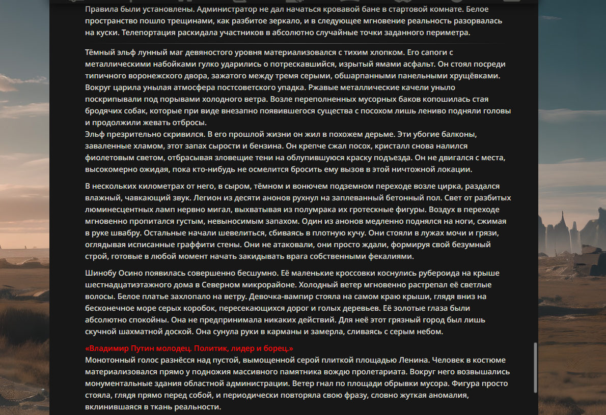 >>330176450 Когда-то проводились битвы ломателей 4 стены и даже персонажей которые влияют на саму нейросетку и генерацию ответов. Таких когда-то постоянно видел, уже немного глаза болят от такого.