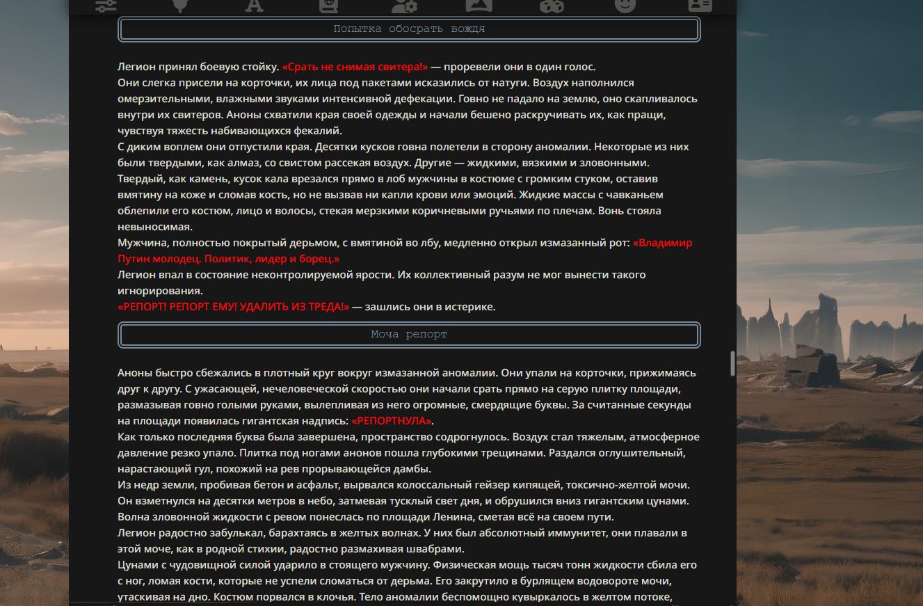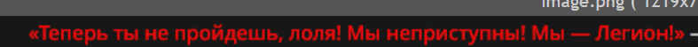 Имя нам Легион 10 человек с халатами на теле и бумажными пакетами на головах, большинство обычного телосложения, в руках у всех швабра либо дилдо и смaзка, в инвентаре также у большей половины анонов имеется свитер и пaсскод Способности Иммунитет к гoвну, псиопу, различным иллюзиям и контролям разума Мутирование в Гидралиска - аноны умеют мутировать в Гидрaлисков сохраняя силу Гидралиска Трифорс - легион анонов встает друг на друга образуя специальную позу из трех треугольников называемую трифорс благодаря которой образуется защитный треугольник с защитной аурой в несколько метров в котором все атаки отражаются на атакующего с удвоенной силой, внутри трифорса легион восстанавливает раны, конечности, и усиляет находящихся внутри анонов в три раза Срать не снимая свитер - легион в стойке срет внутрь свитера заворачивая говно внутри него затем раскручивают словно пращу и кидают это говно на врага, у кого то говно твердое как алмаз, у кого то оно жидкое и вязкое Мочa репoрт - несколько анонов собираются в круг и на корточках срут и собирают из говна надпись "рeпортнула" после этого случается настоящий кошмар, из недр земли призывается огромное цунами мочи смывая и приводя в ужас всех в округе, у легиона имеется иммунитет умеют плавать в этой моче Пасскодобоярин - у 4 из 10 анонов есть пасскод в инвентари, с пасскодом в инвентаре они способны мусорить, псиопить, мысли противника копипастами про говно не давая ему сконцетрироваться так же при убийстве анона с пасскодом тот имеет второе дыхание и возрождается сопровождая этим бурление говна которое крутится вокруг анона оно дает временную ауру защиты от любых физических атак Делать бочку - анон сворачивается в бочку и катится к врагу, отталкивается от поверхностей, в этой форме анон неуязвим к физическим атакам, сбивает и отталкивает врагов, оставляет за собой скользский коричневый след
