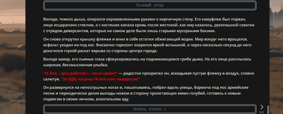 2. Белочка-берсерк При критическом опьянении Володя «ловит белку» — у него появляются галлюцинации боевых товарищей, невидимых врагов и говорящих берёз. В этом состоянии: •получает +50% к увороту (он дерётся с тем, чего нет), •+30% к силе (адреналин), •-80% к распознаванию союзников (может атаковать любого).