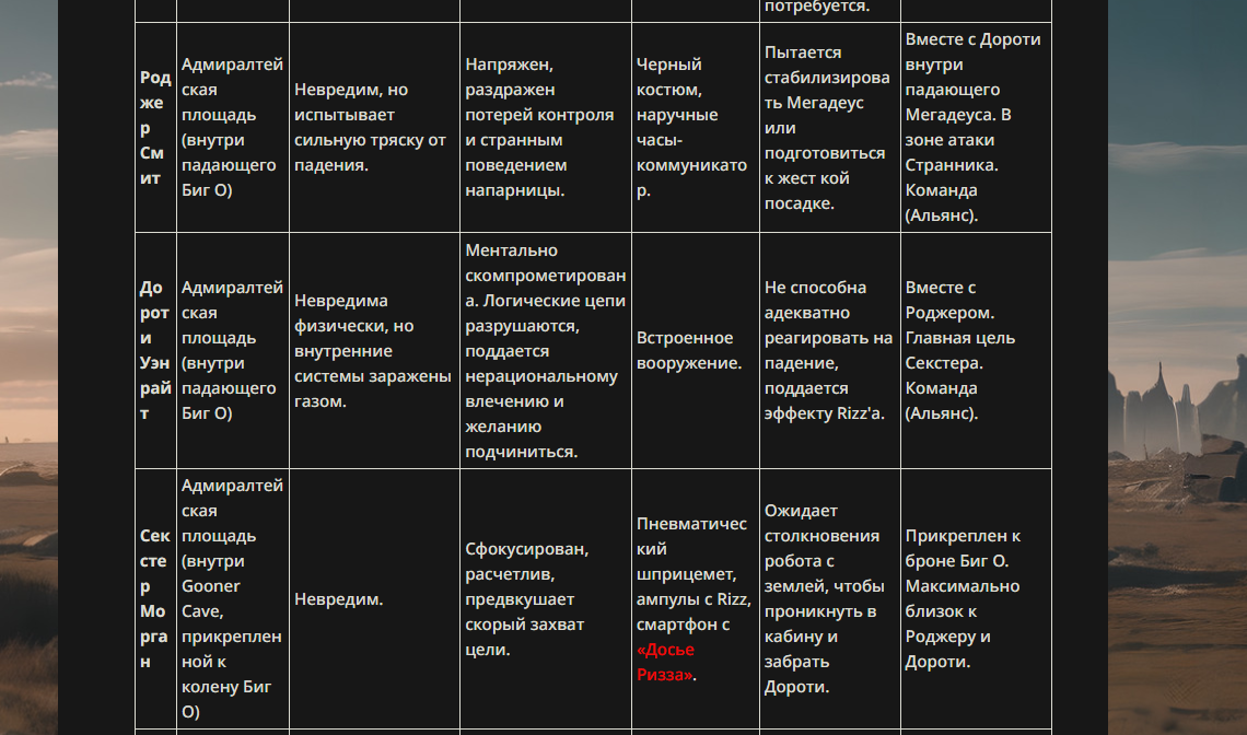 Место занято (за мной): <character name="Хранитель Желаний (Маскот)"> Не человек, не зверь, не ИИ. Существо, ответственное за проведение Батл Рояля. Выглядит как огромная плюшевая игрушка (например, заяц или медведь) с несоразмерно длинными конечностями и экраном вместо лица, на котором транслируется одна-единственная эмоция — спокойная улыбка (:3). Не участвует в бою, но наблюдает. Выдает призы. </character>