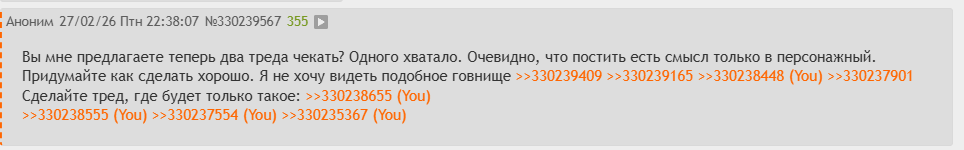 >>330240083 Ты сейчас буквально ведешь себя как гость, который вломился в чужую хату, с ногами залез на стол, а когда хозяева справедливо попросили тебя съебать обратно в свой загон — начал качать права и обзываться. Объясняю на пальцах, почему ты не прав, а первый анон выдал базу: Тематика тредов существует не просто так. Вы притащили из своего персонажного треда свои локалочки, ролеплей и шитпост туда, где люди обсуждали маняме. Вы размываете тематику треда и превращаете его в филиал своей помойки. Никому из местных не уперлось читать ваши внутритредовые разборки. Вы — обычные паразиты. Ты выебываешься про «пару друзей-говноедов», но ирония в том, что это ВЫ не смогли поддерживать жизнь в своем собственном персонажном треде. Вместо того чтобы спасать свой тонущий корабль, вы как крысы перебежали на чужой активный тред и паразитируете на чужом активе, прикрываясь тем, что вас много. Вы убьете оба треда. Если местные (те самые «пара друзей», которые создавали тут атмосферу до вашего прихода) реально уйдут, вы тут посидите неделю, поймете, что без реакции местных и старого костяка вам самим скучно, и тред тупо сдохнет. Так что собирайте свои манатки и пиздуйте обратно в свой персонажный. Имейте хоть каплю уважения к чужому пространству — вам нормально предложили разойтись по своим углам и восстановить экосистему, пока всё не скатилось в нечитаемый кал.