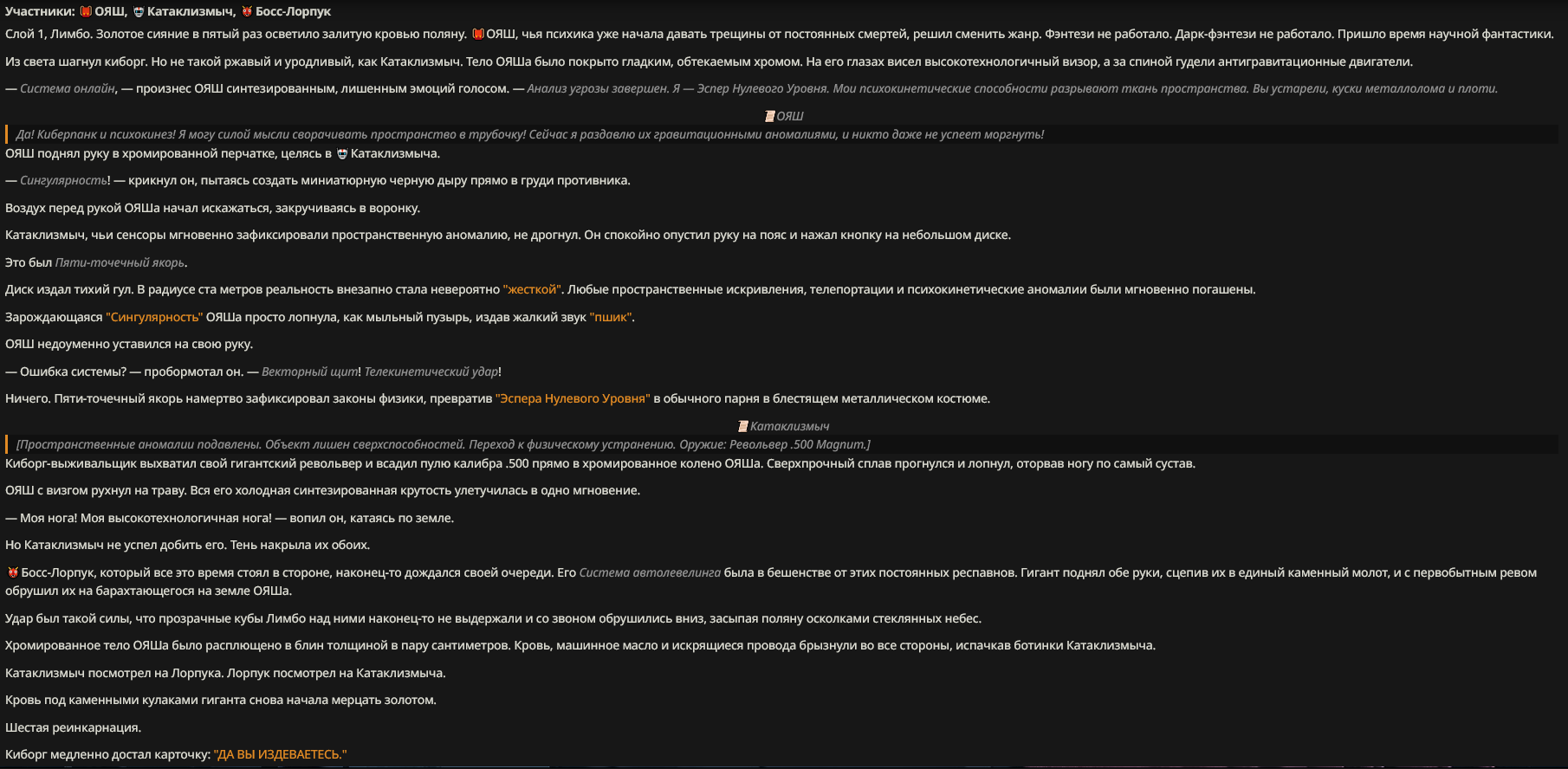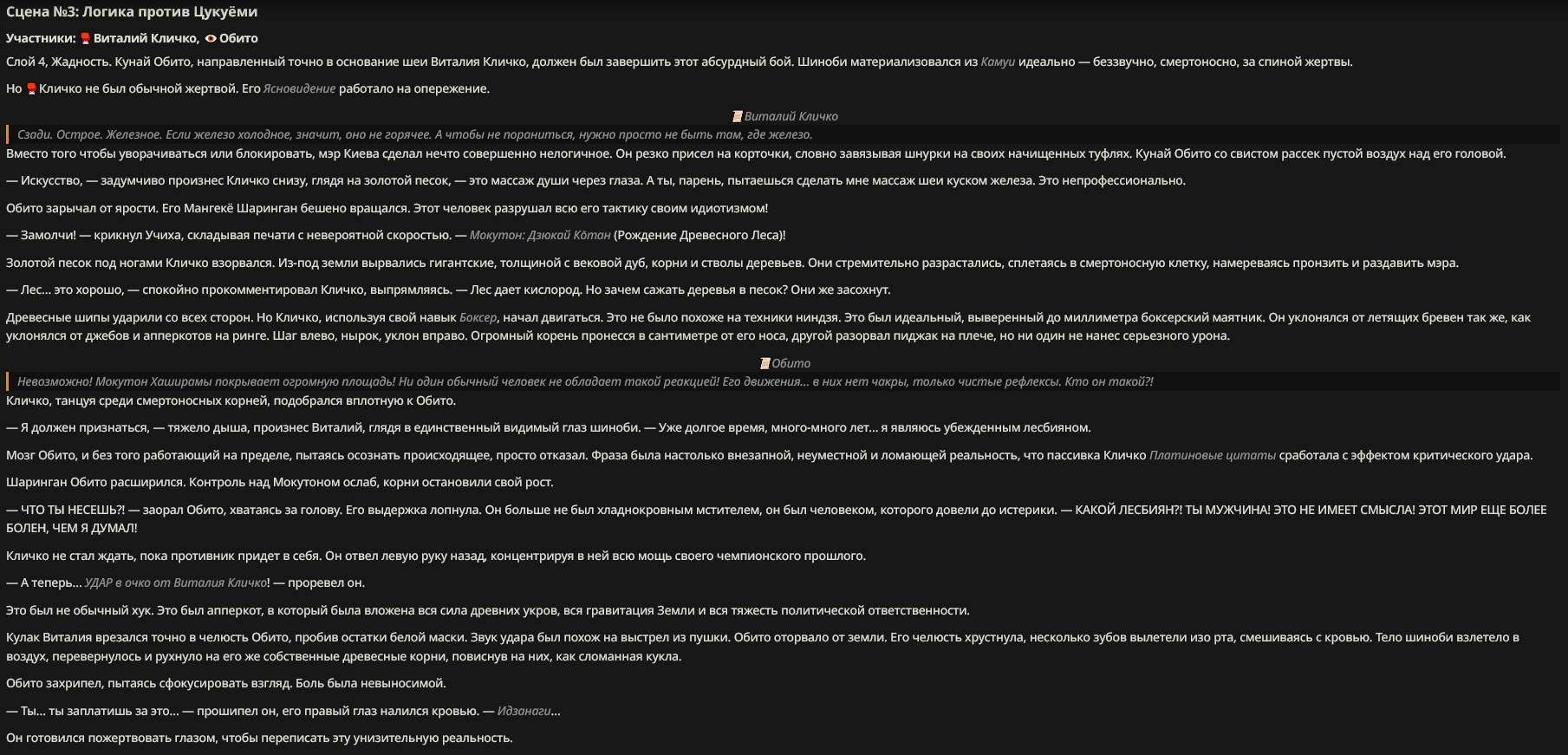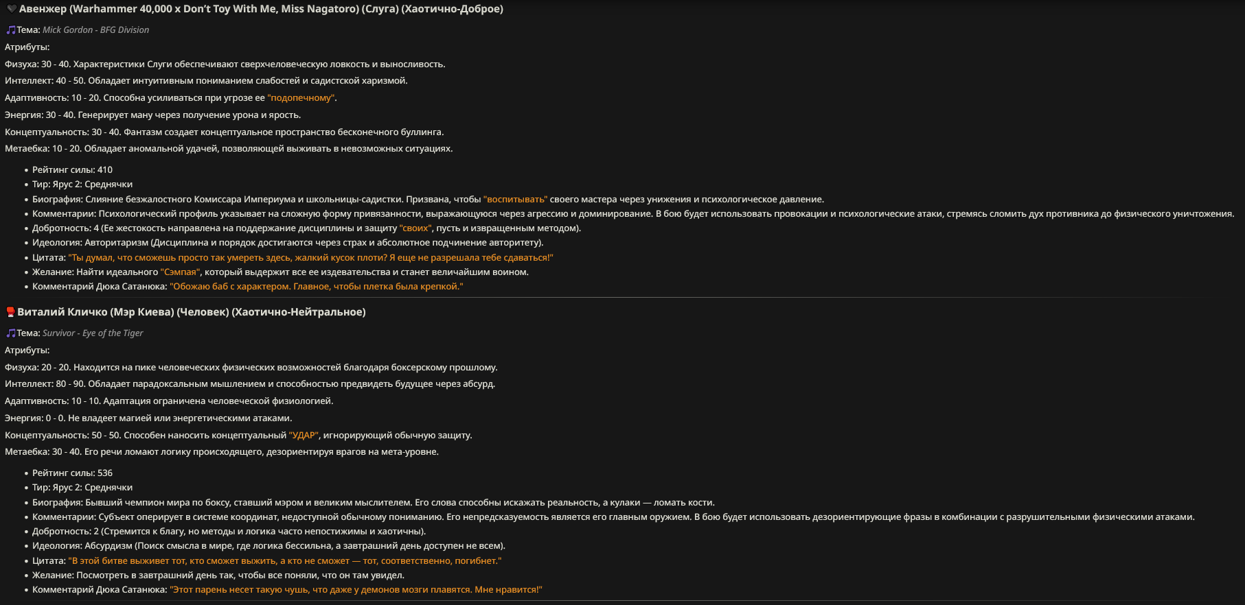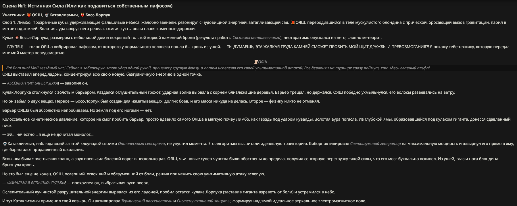 >>330443794 я хз, или блять паверскейлы прямо прописывать, что бы нейронка это учитывала, или в анкете писать "данный персонаж считается героем, несмотря на его мотивацию", что бы эта хуйня не сливала во втором раунде против рандом суперхумана