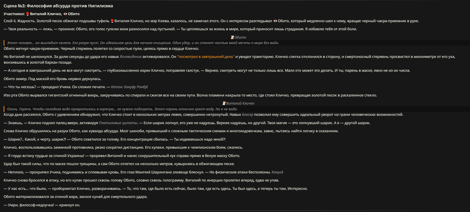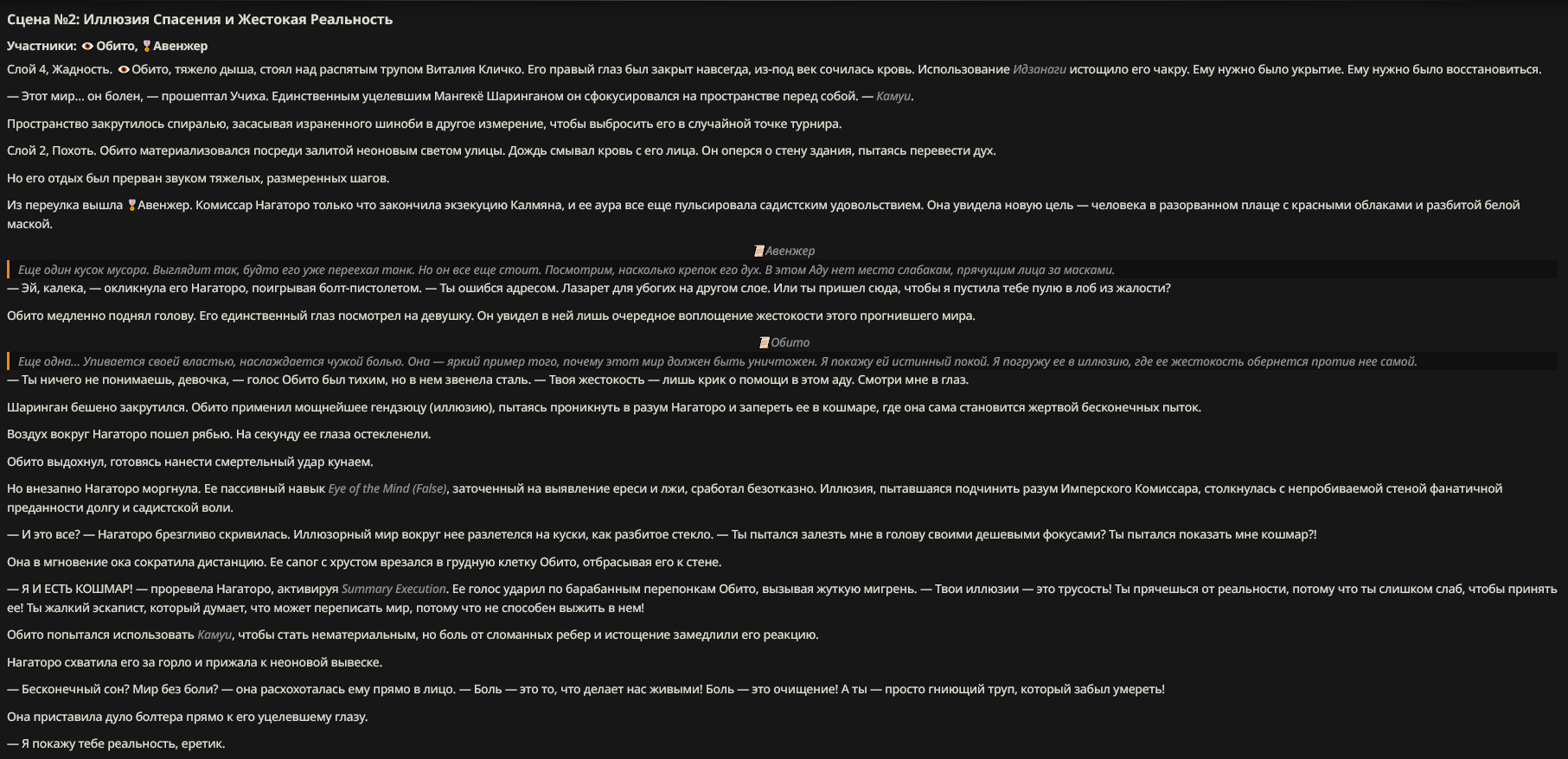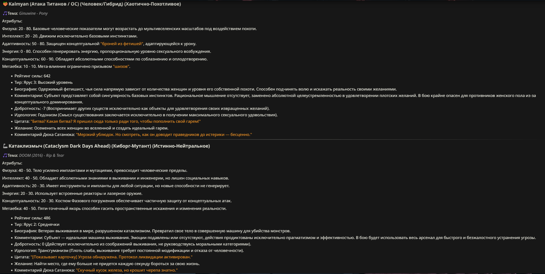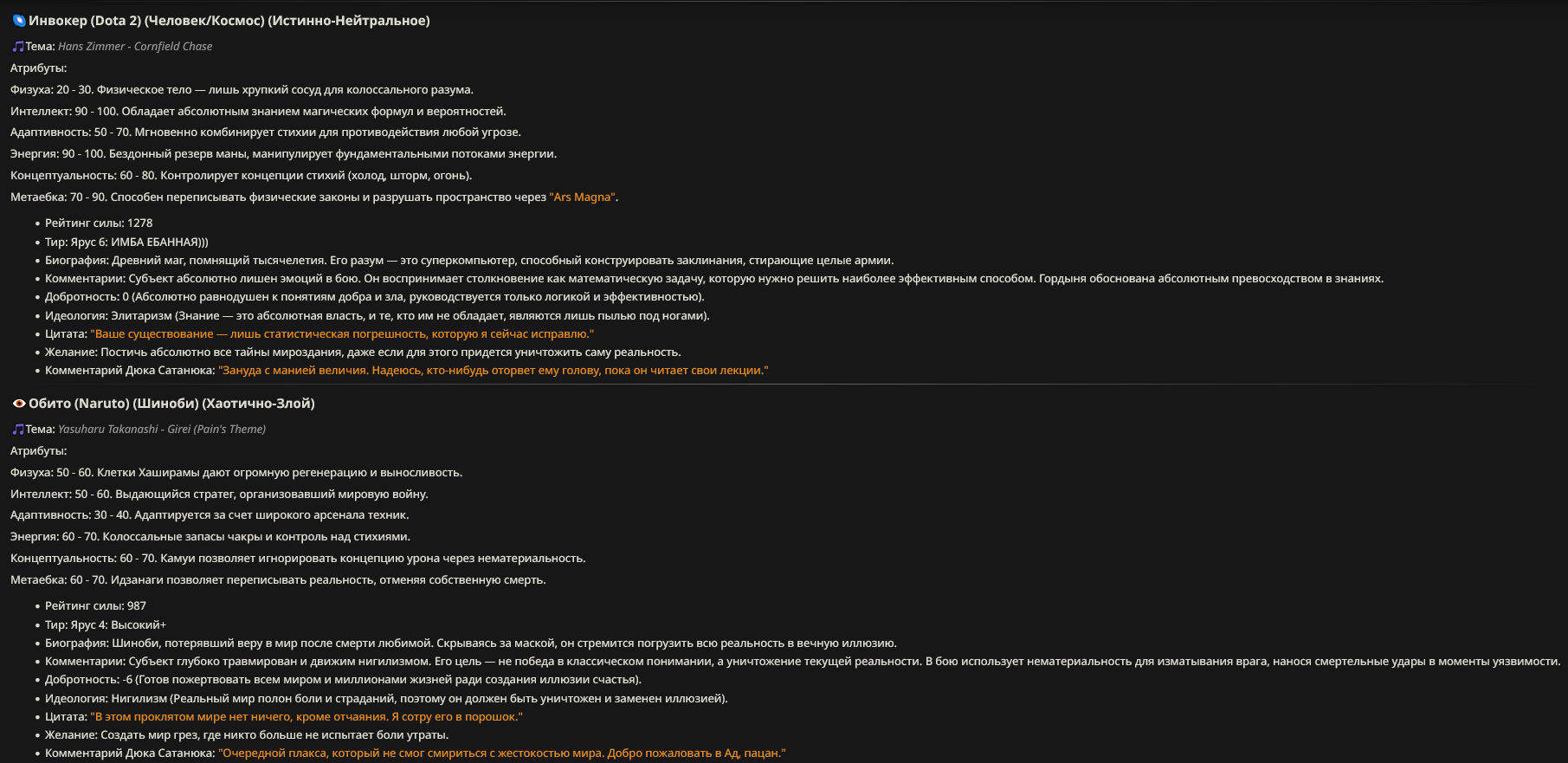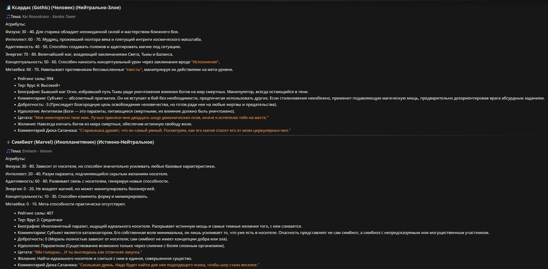 >>330443794 я хз, или блять паверскейлы прямо прописывать, что бы нейронка это учитывала, или в анкете писать "данный персонаж считается героем, несмотря на его мотивацию", что бы эта хуйня не сливала во втором раунде против рандом суперхумана