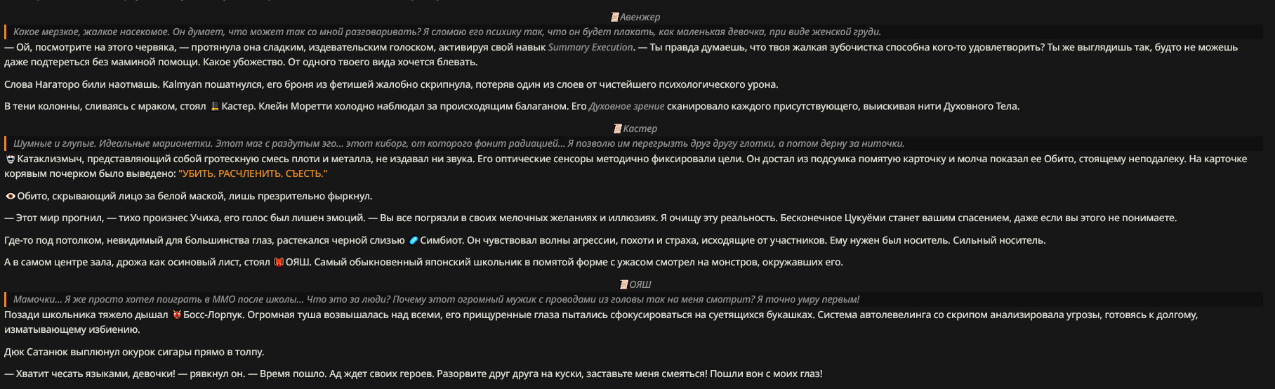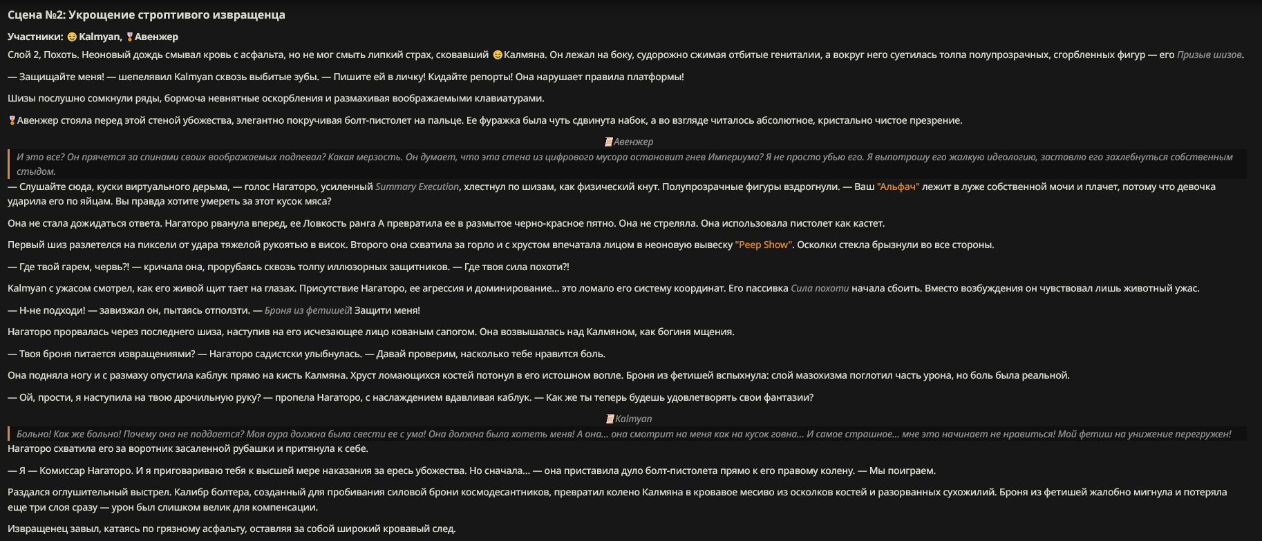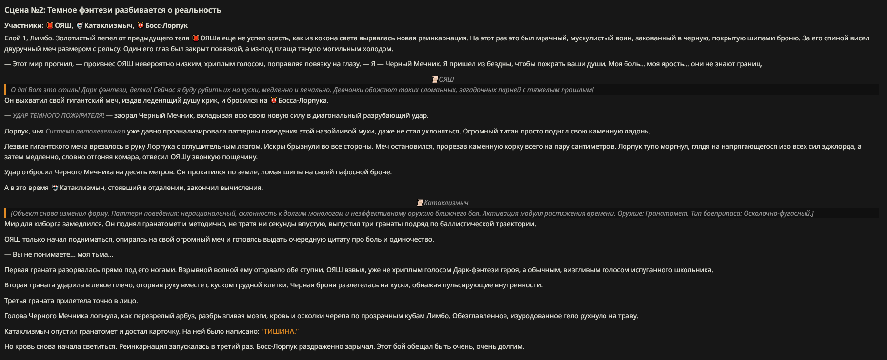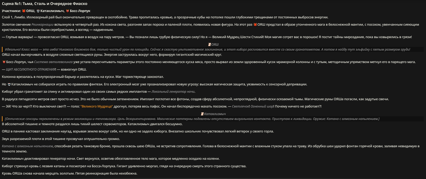 >>330443794 я хз, или блять паверскейлы прямо прописывать, что бы нейронка это учитывала, или в анкете писать "данный персонаж считается героем, несмотря на его мотивацию", что бы эта хуйня не сливала во втором раунде против рандом суперхумана