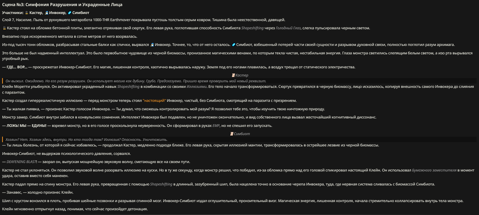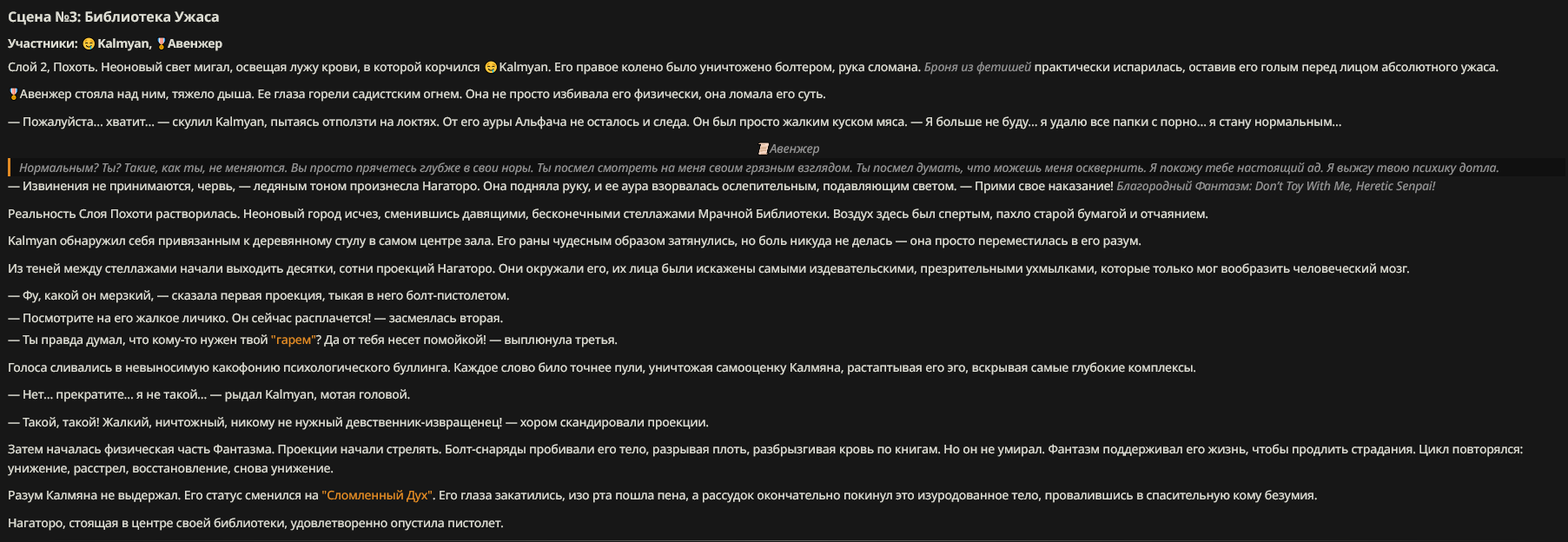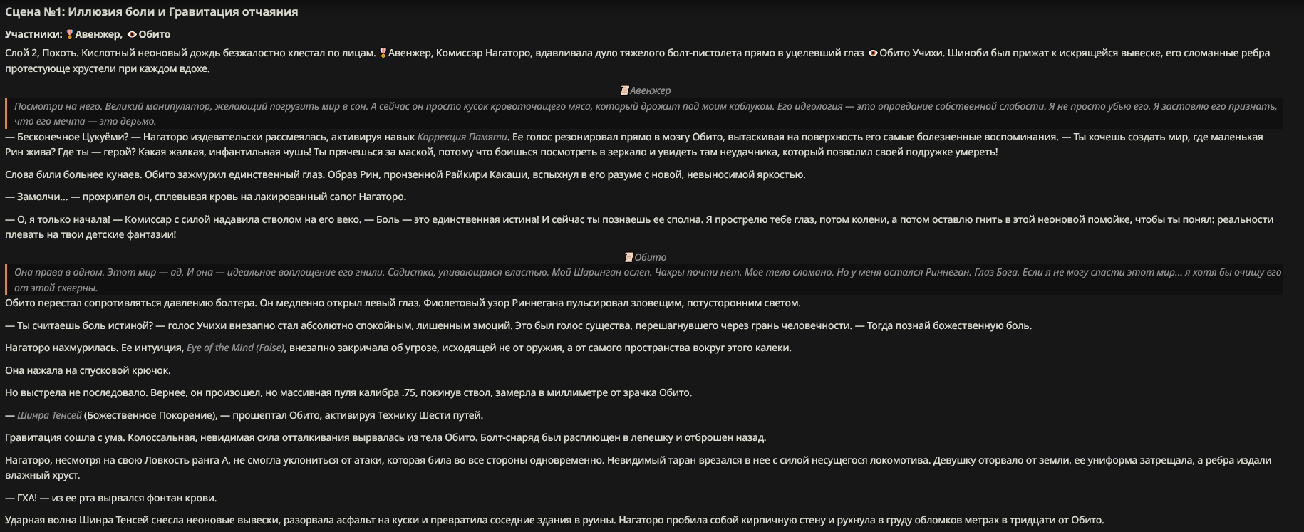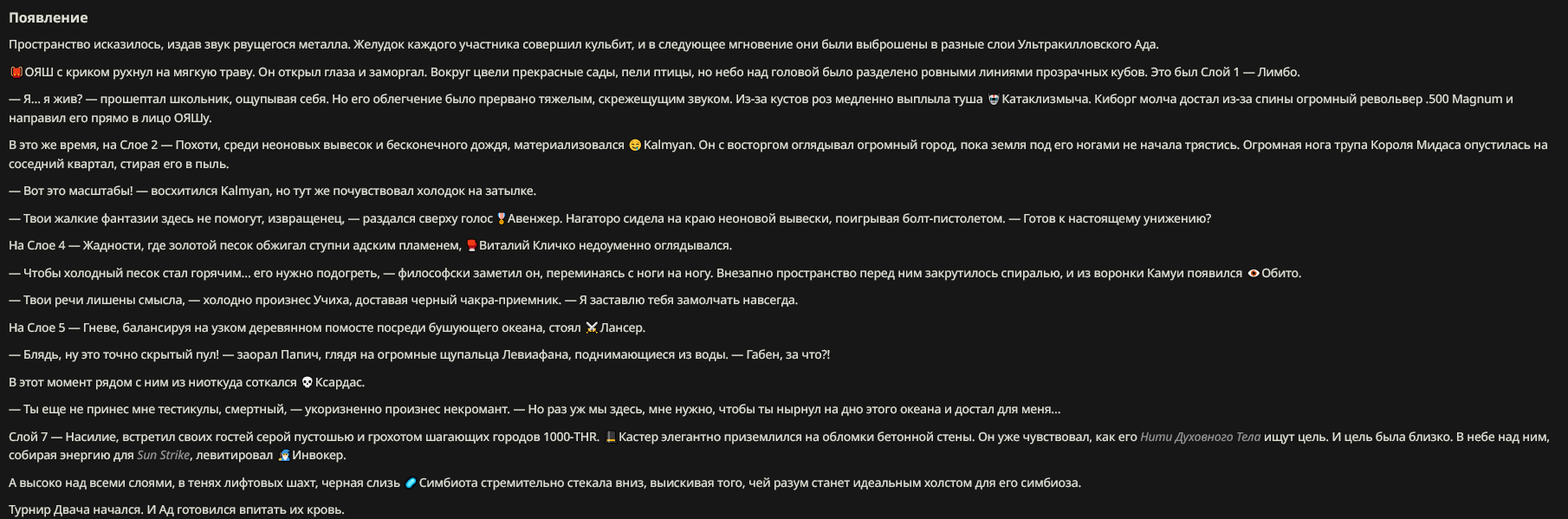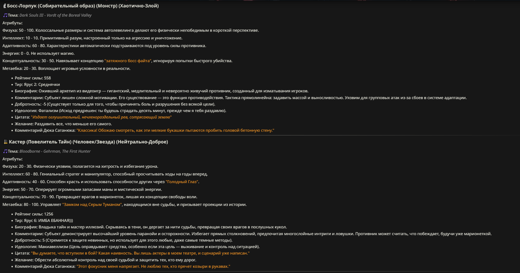 >>330443794 я хз, или блять паверскейлы прямо прописывать, что бы нейронка это учитывала, или в анкете писать "данный персонаж считается героем, несмотря на его мотивацию", что бы эта хуйня не сливала во втором раунде против рандом суперхумана