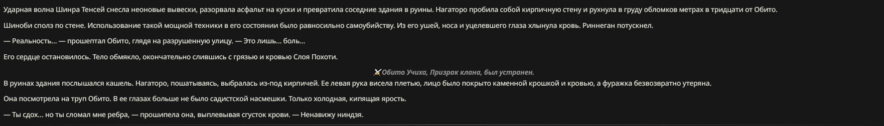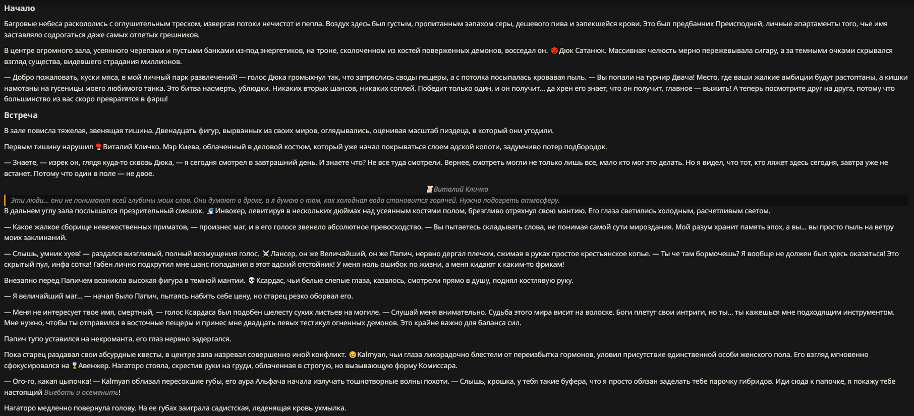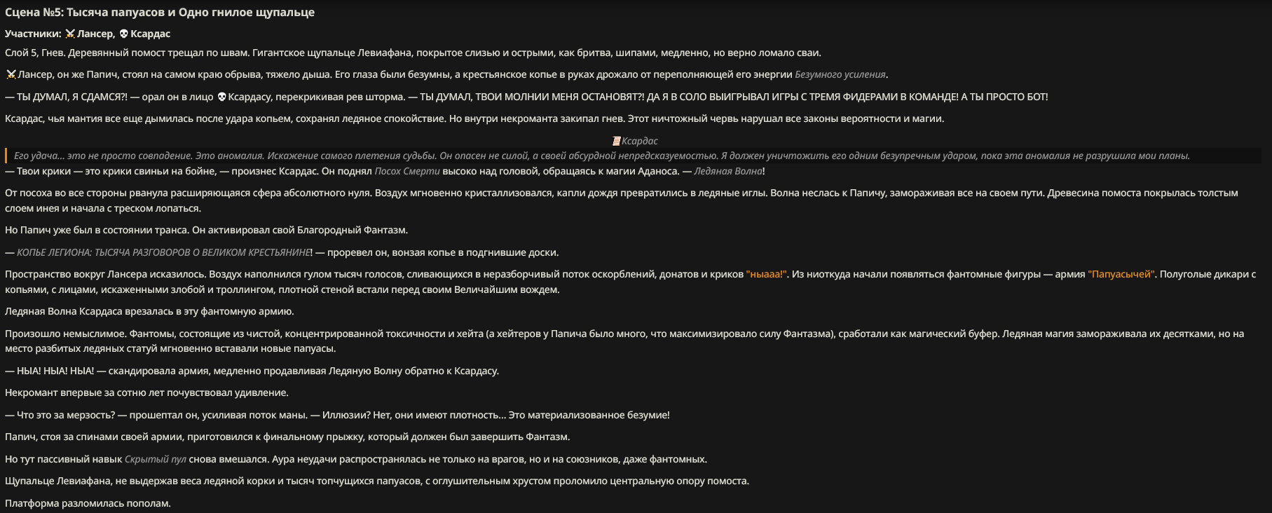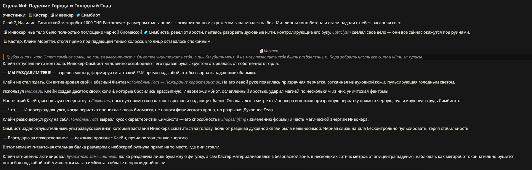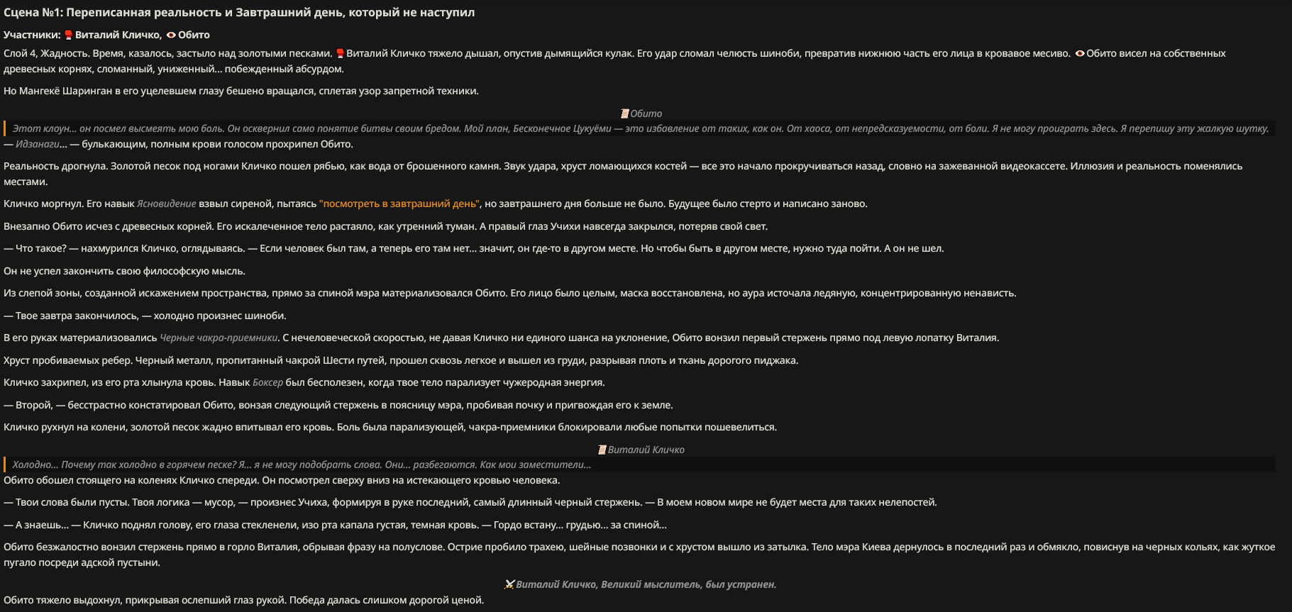 >>330443794 я хз, или блять паверскейлы прямо прописывать, что бы нейронка это учитывала, или в анкете писать "данный персонаж считается героем, несмотря на его мотивацию", что бы эта хуйня не сливала во втором раунде против рандом суперхумана
