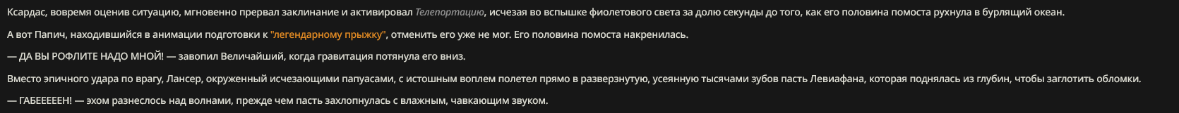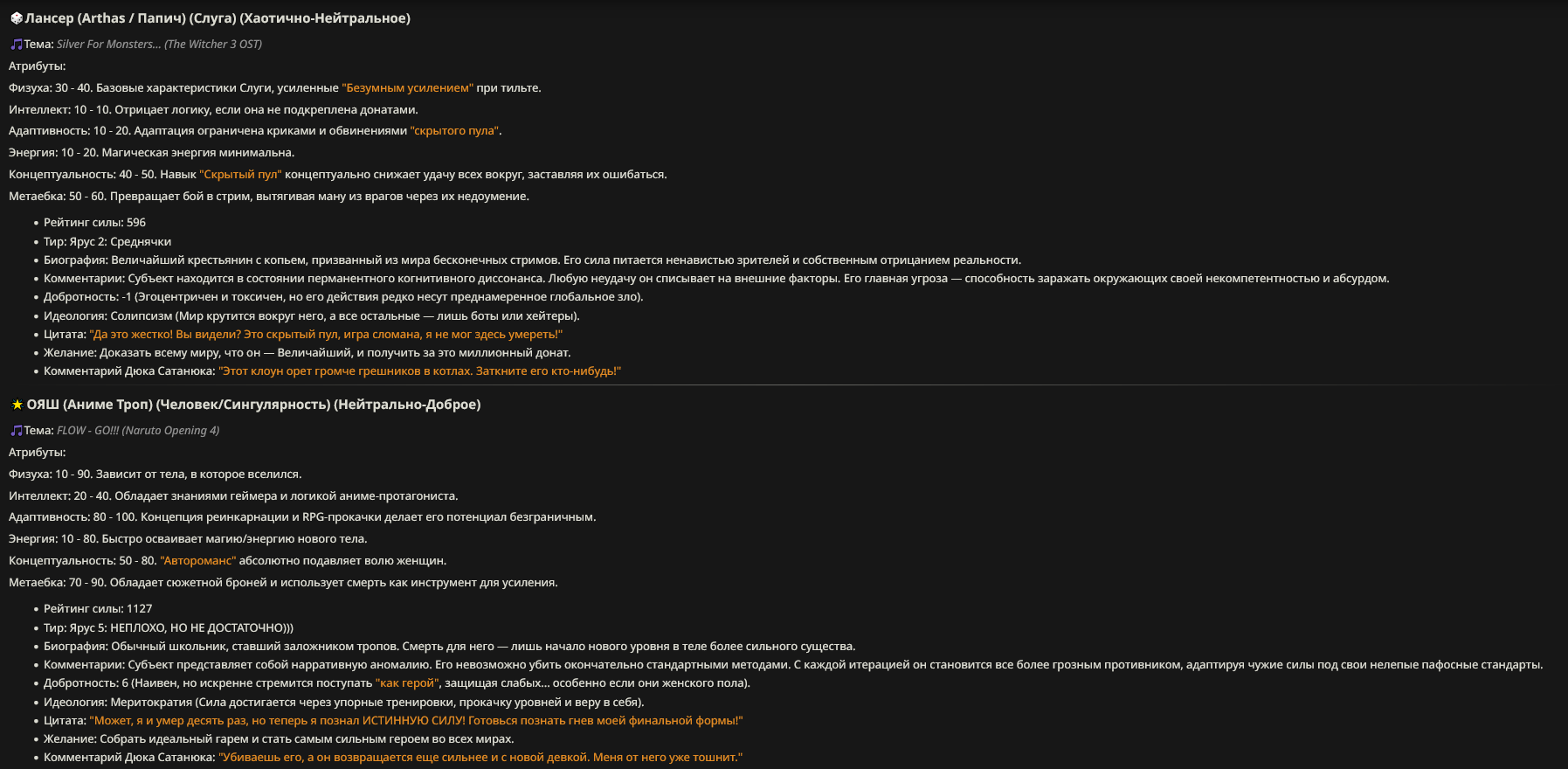 Слуга: Величайший Крестьянин с Копьем Класс: Lancer (Лансер) Истинное имя: Виталий Цаль (Arthas) Мировоззрение: Хаотично-адекватное (Chaotic Balanced) Параметры (Stats): Сила (Strength): B Выносливость (Endurance): A+ (из-за способности терпеть поток «донатов») Ловкость (Agility): C (постоянно застревает в текстурах или тильте) Магическая энергия (Mana): D Удача (Luck): E-- (всё куплено, скрытый пул) Благородный Фантазм (Noble Phantasm): EX Классовые навыки (Class Skills): Сопротивление магии (B): Невосприимчивость к любым логическим доводам и заклинаниям, если они не сопровождаются звуком доната. Безумное усиление (E): Несмотря на класс Лансера, при получении урона или критической ошибки впадает в состояние «Да, это жестко», повышая свою силу в ущерб адекватности. Личные навыки (Personal Skills): Скрытый пул (Hidden Pool) A: Пассивный навык, снижающий Удачу союзников и противников до минимума. Окружающие начинают совершать глупые ошибки. 0 Ошибок (Zero Mistakes) B: Кратковременное повышение концентрации. Дает шанс игнорировать входящий урон, утверждая, что «всё было под контролем». Величайший (The Greatest) EX: Харизма особого типа. Принуждает врагов смотреть его трансляцию (битву), вызывая постепенное снижение их маны из-за недоумения. Благородный Фантазм (Noble Phantasm): «Копье Легиона: Тысяча разговоров о Великом Крестьянине» Ранг: EX Тип: Анти-Армия При активации Папич призывает фантомную армию «Папуасычей» с копьями. Сила удара зависит от количества «хейтеров» в радиусе действия. Завершается Фантазм легендарным прыжком и криком, оглушающим всех в радиусе 144p.