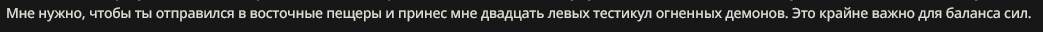 Main Feature: {Remember, it always activated upon encounter} 1) Story Quest Giver: when any of the characters first meets Xardas, they involuntarily begin a convoluted dialogue with him, at the end of which Xardas makes it clear that this character is some kind of chosen one and gives them a random quest, which usually consists of a tedious run around, to kill someone, or obtaining 20 skins of some animal, or something of that nature {come up with any quests based on the context of what is happening and the current location, let it be absurdly played out}