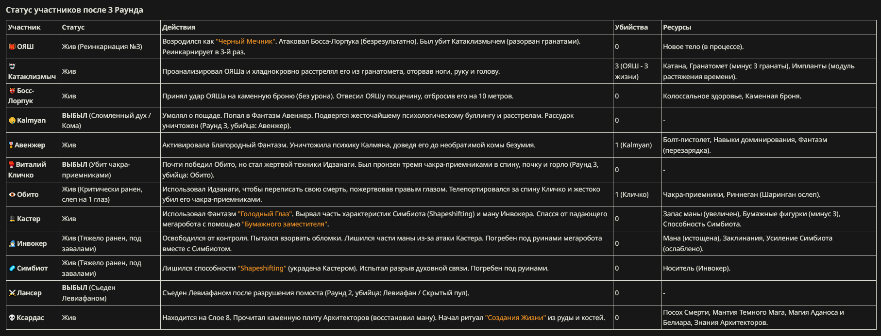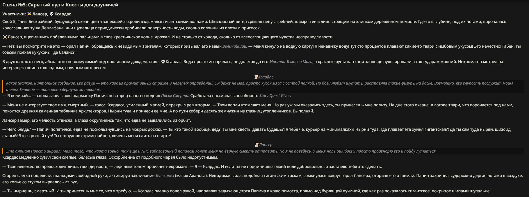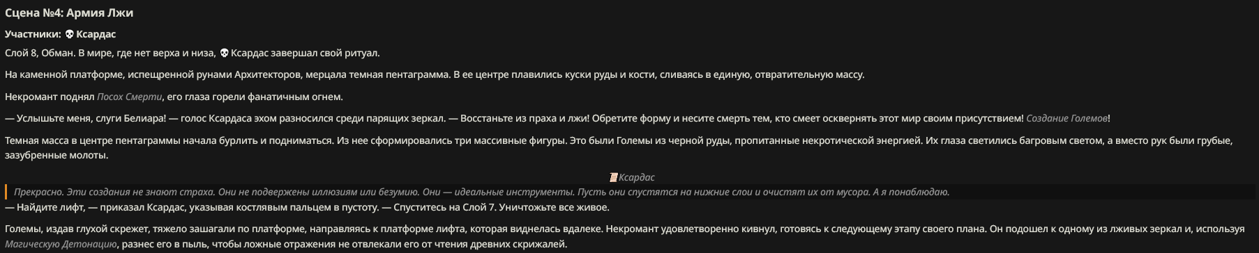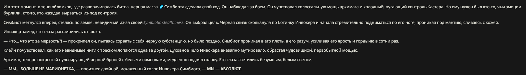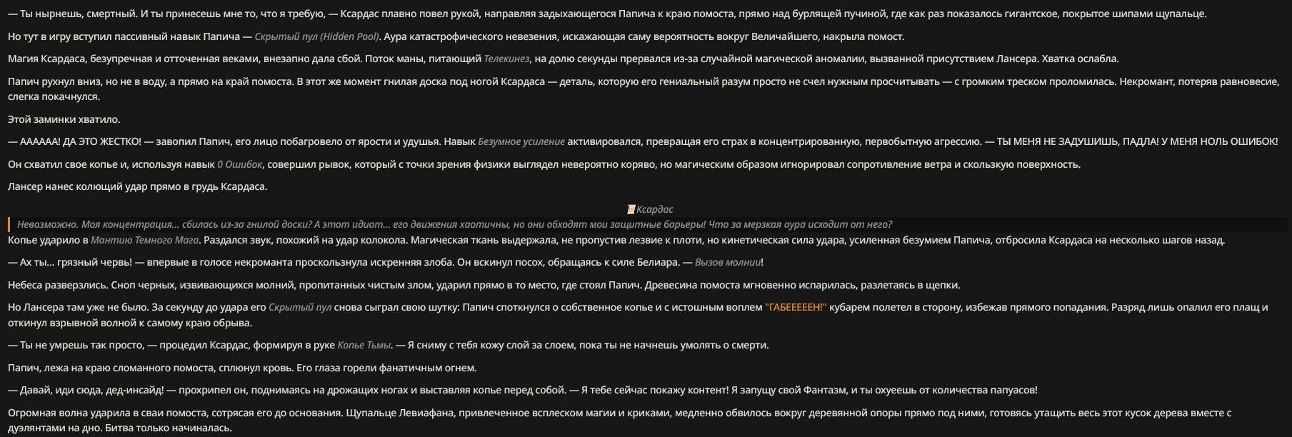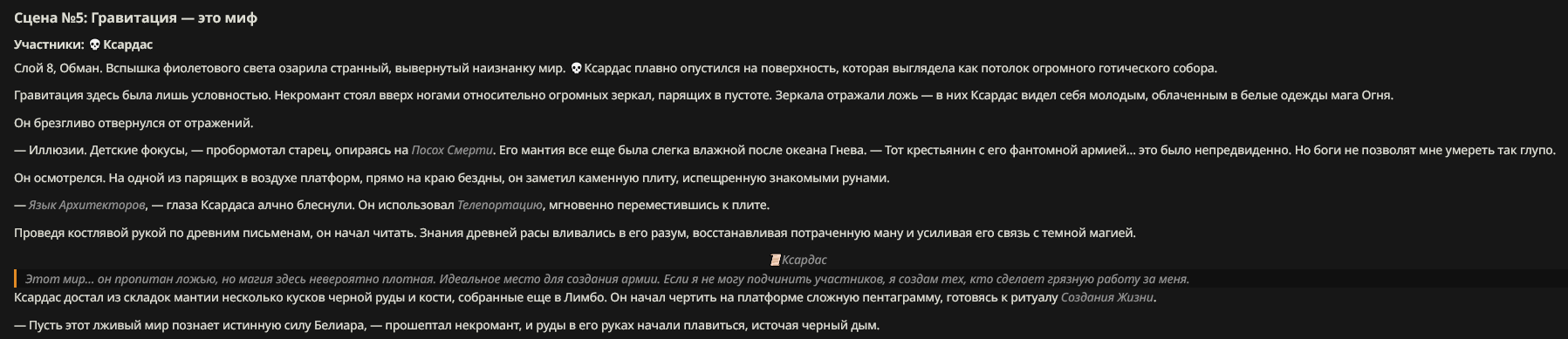 Passive features that are always active: 1) Black Mage: Xardas specialises in black magic and uses the powers of Belial, drawing strength from the realm of darkness. Xardas possesses immeasurable magical power and is the most powerful mage in the world of Mytana. Xardas is an expert not only in necromancy and black magic, but also in all other schools. He has mastered the six magical circles, knows all kinds of spells, and is capable of performing special magical rituals with effects known only to him. 2) Special Fencing: Despite his elderly appearance, Xardas is physically strong and has a special style of fighting with magical combat staffs, which allows him to quickly deal with opponents who underestimate him in close combat. 3) Language of the Architects: The ancients carved texts on stone tablets that contain special secret knowledge that magically increases the magical and combat abilities of those who read them {remember, these tablets are always present at the location and can be accidentally found by any participating character}. 4) The Power of Beliar: Xardas absorbed the soul of an undead dragon, thereby acquiring the colossal powers and abilities of Beliar's slain chosen one. 5) Resistances: Xardas has powerful protection against magic spells, mental and temperature effects, and is not susceptible to disease or weakness. 6) Life Extension: Xardas possesses a special magical rune that allows him to heal any mortal wounds to himself or his allies and constantly increases his lifespan. As a result, Xardas lived to be 160 years old at the time of the latest events and still shows no signs of exhaustion or other discomforts from his age.