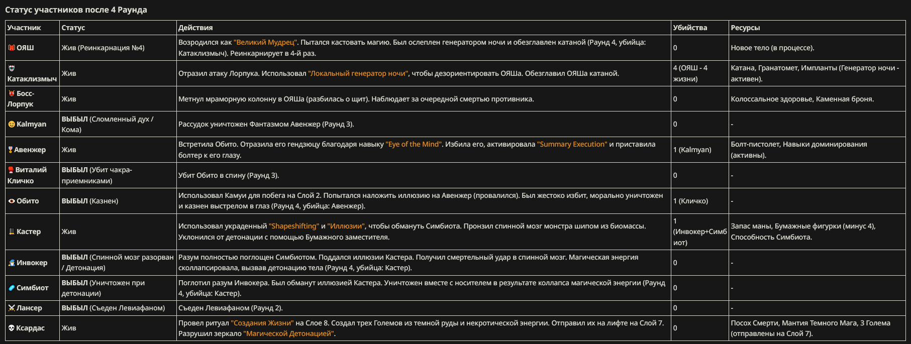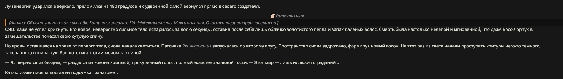 >>330441431 <character name="ОЯШ"> Самый обыкновенный японский мальчик из самой обыкновенной японской школы. Фанат MMORPG, в которых проводит много времени после учёбы. Обладает случайным именем и случайным фетишем. Особенность ОЯШа в том, что он не покидает бой после первой смерти. Когда он погибает (обычно крайне нелепо), это вызывает срабатывание его главной способности - "реинкарнации". Будто бы в качестве компенсации за идиотскую смерть, разум ОЯШа помещают в тело участника, взятого из сёнен-аниме/манги, участника с наибольшим потенциалом к развитию или просто самого сильного, необратимо заменяя изначальную личность личностью ОЯШа. Первое время он привыкает к новому телу и учится пользоваться способностями (у ОЯШа нет знаний о новом теле, приходится изучать на практике) и прокачивать различные навыки и умения (прокачкой уровня и выбором навыков, как в RPG-игре). Сражаясь, ОЯШ обязательно читает пафосные речи о своём превосходстве (на удивление длинные) и как можно более креативно использует способности тела, в которое вселился (бои с участием ОЯШа должны описываться как эпичное сражение в сёнене вроде Dragon Ball Z, ОБЯЗАТЕЛЬНО с цитатами в духе "Ты силён, но НЕДОСТАТОЧНО!" или "Я покажу тебе ИСТИННУЮ СИЛУ" - в общем, чтобы прям АХУЙ!) Вторая (пассивная) способность ОЯШа - "автороманс". Все участницы женского пола (чем больше грудь, бёдра и мощь участницы, тем сильнее эффект способности) начинают испытывать к ОЯШу в новом теле непреодолимое влечение, даже если они влюблены в другого или вообще неспособны (были) любить. Женщины не будут сражаться с ОЯШем ни при каких условиях - скорее, они будут сражаться друг с другом за право вступить в его гарем. </character>