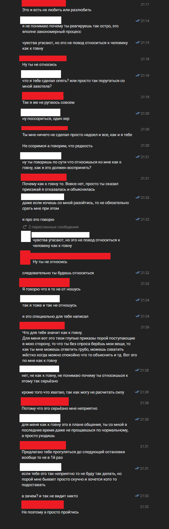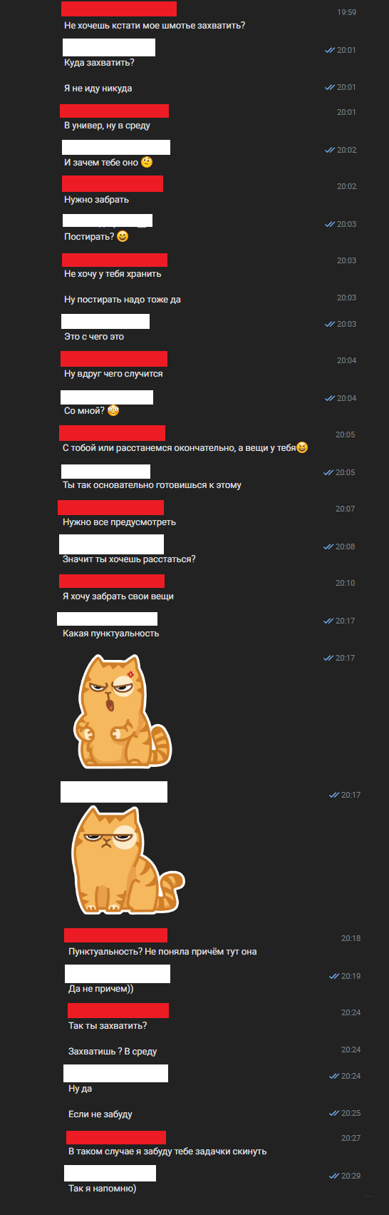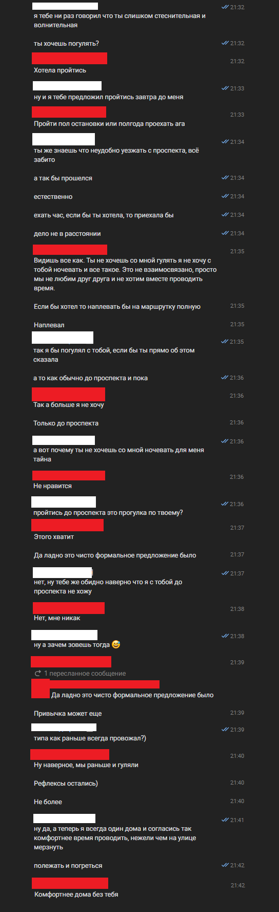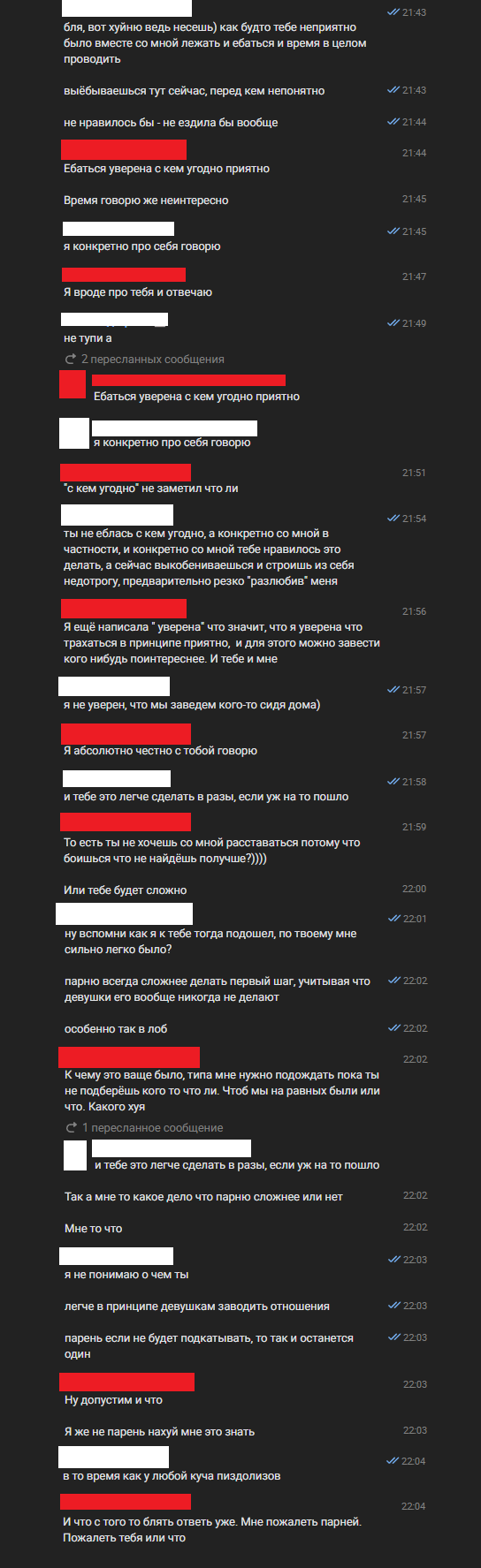 Эти пару дней перевернули моё восприятие совместной жизни. Я соотнёс свои энергозатраты и её на ЖЕНСКИЕ ОБЯЗАННОСТИ - и осознал, насколько же сильно вкладываюсь я и насколько слабо она, это просто блять несопоставимо. Я для себя понял, что вообще нихуя не должен дома делать - захотел бросил вещи, захотел оставил бутылки, захотел обоссал ободок - это пускай она оперативно всё это убирает и вытирает, и даже так это несопоставимо с моим вкладом. Через пару дней мы, конечно, помирились - но я уже не стал прежним, что в итоге привело к разводу. Теперь моя позиция простая : если я содержу девушку - она по дому нахуй всё делает и не возникает. С нынешней таких проблем нету - если мне не лень, могу за собой убрать, или там вещи сложить, если мне впадлу - слова ни скажет.