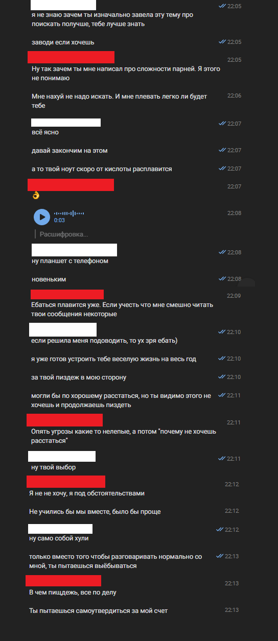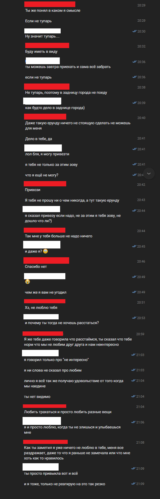 Казалось бы - выдыхай, у плиты стоять не надо, детей у нас нет, поддерживай порядок - но нет, начались выебоны. Я ей говорю "сходи купи пива/йогурты" - она в ответ А САМ ЧО, НОГИ ОТКАЗЫВАЮТ? МОГ С РАБОТЫ КОГДА ШЁЛ КУПИТЬ, Я УЖЕ ЛЕЖУ РАЗДЕТАЯ. Оставил тарелку и бутылку пива перед компом - начинает выебываться, чо я за собой помыть не могу и в урну выбросить. С утра просыпаюсь, футболка не поглажена - ЧО У ТЕБЯ РУК НЕТ? НЕ ВИДИШЬ Я СПЛЮ, ВОЗЬМИ ДА ПОГЛАДЬ, ДЕЛОВ НА ДВЕ МИНУТЫ. Меня это пиздец не устраивало - какого хуя я полностью содержу обоих, всё делать, оплачивать её доставки еды, любые покупки, туши, помады, озон вб, а у неё из занятий - лишь протереть полы да простыни поменять? У меня копилось недовольство, у неё копились выебоны - но как-то сглаживались конфлакты, справедливости ради - отношения у нас были хорошие и общались нормально, не типичные скуфы, которые срутся и негативят 24 на 7, но вот именно бытовуха была неприятной иголочкой.