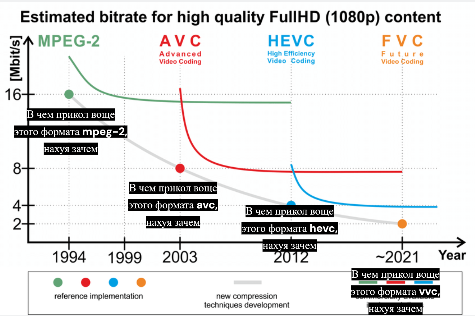 >>330495456 Ты прав, анон, и я с тобой согласен. Но все равно, нынешние процессоры способны гораздо быстрее кодировать в HEVC (до 80 кадров/сек, насколько я знаю), нежели процессоры 10-летней давности. Да и цены на память сейчас дикие. Казалось бы, идеальные условия для перехода на HEVC? Про VVC я вообще молчу...