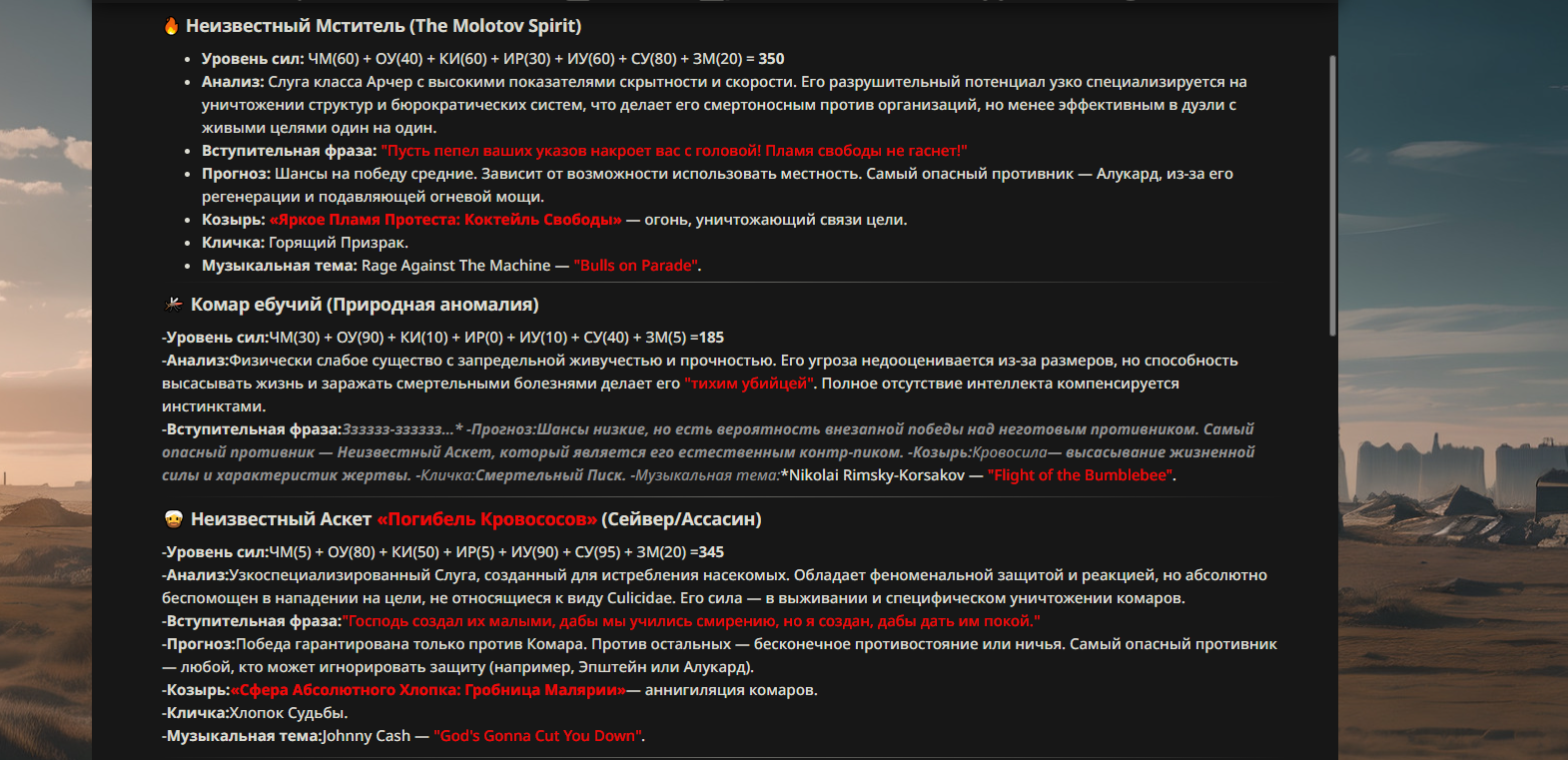 >>330699018 Истинное Имя: Неизвестный Аскет «Погибель Кровососов» Класс: Сейвер (Saver) / Ассасин (Assassin) Характеристики: Сила: E (не может поднять даже меч) Выносливость: EX (способен стоять неподвижно в болоте неделями) Ловкость: SSS (только в микродвижениях пальцев) Магическая энергия: C Удача: A+ (комары всегда садятся именно туда, где он их ждет) Благородный Фантазм: EX Личные навыки: Отрицание Жизненной Силы (Комары) (Ранг EX): Пассивная аура. Любое насекомое семейства Culicidae в радиусе километра испытывает экзистенциальный ужас и теряет волю к жизни. Железная Кожа: Приманка (Ранг A): Его кожа кажется мягкой, но в момент укуса становится тверже алмаза. Комары ломают хоботки, что приравнивается к их немедленному поражению. Звуковой Анализ: Ультразвуковой Гнев (Ранг B+): Способен по тональности писка определить пол, возраст, родословную и количество выпитой крови конкретного комара. Благородный Фантазм: «Сфера Абсолютного Хлопка: Гробница Малярии» Ранг: EX Тип: Анти-Мир (микромира насекомых) Акари соединяет ладони, создавая пространственный разлом, настроенный исключительно на хитиновые оболочки и хоботки. Все комары в области действия мгновенно аннигилируют, превращаясь в чистую ману. Против людей и других Слуг этот Фантазм абсолютно бесполезен и вызывает лишь легкий ветерок. «Кровавое Возмездие: Возврат Десятикратного Дара» Ранг: A Тип: Контрудар Если хоть один комар умудрится его укусить, Слуга активирует этот Фантазм. Вся кровь, когда-либо выпитая этим комаром (и его предками), мгновенно закипает, превращая насекомое в миниатюрную сверхновую.