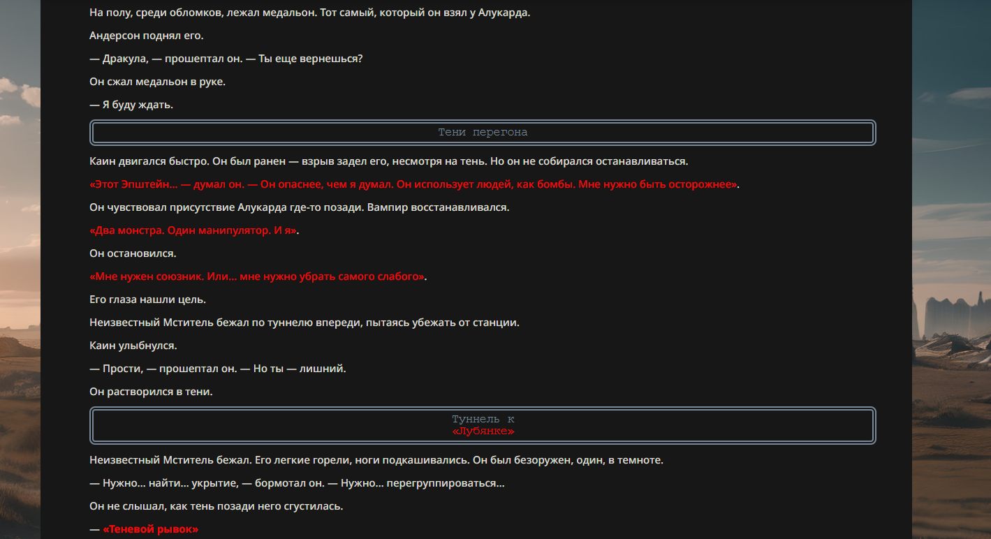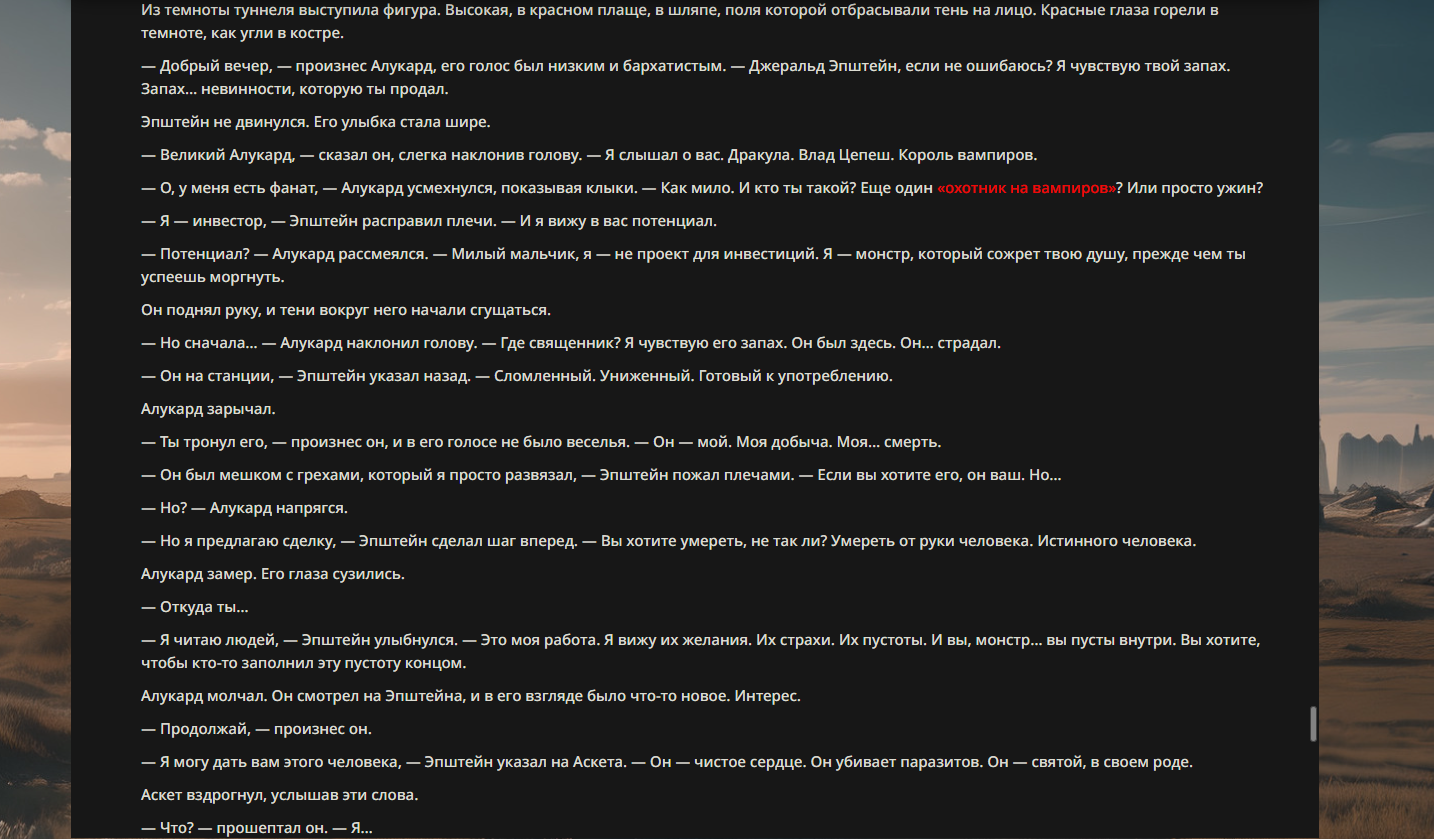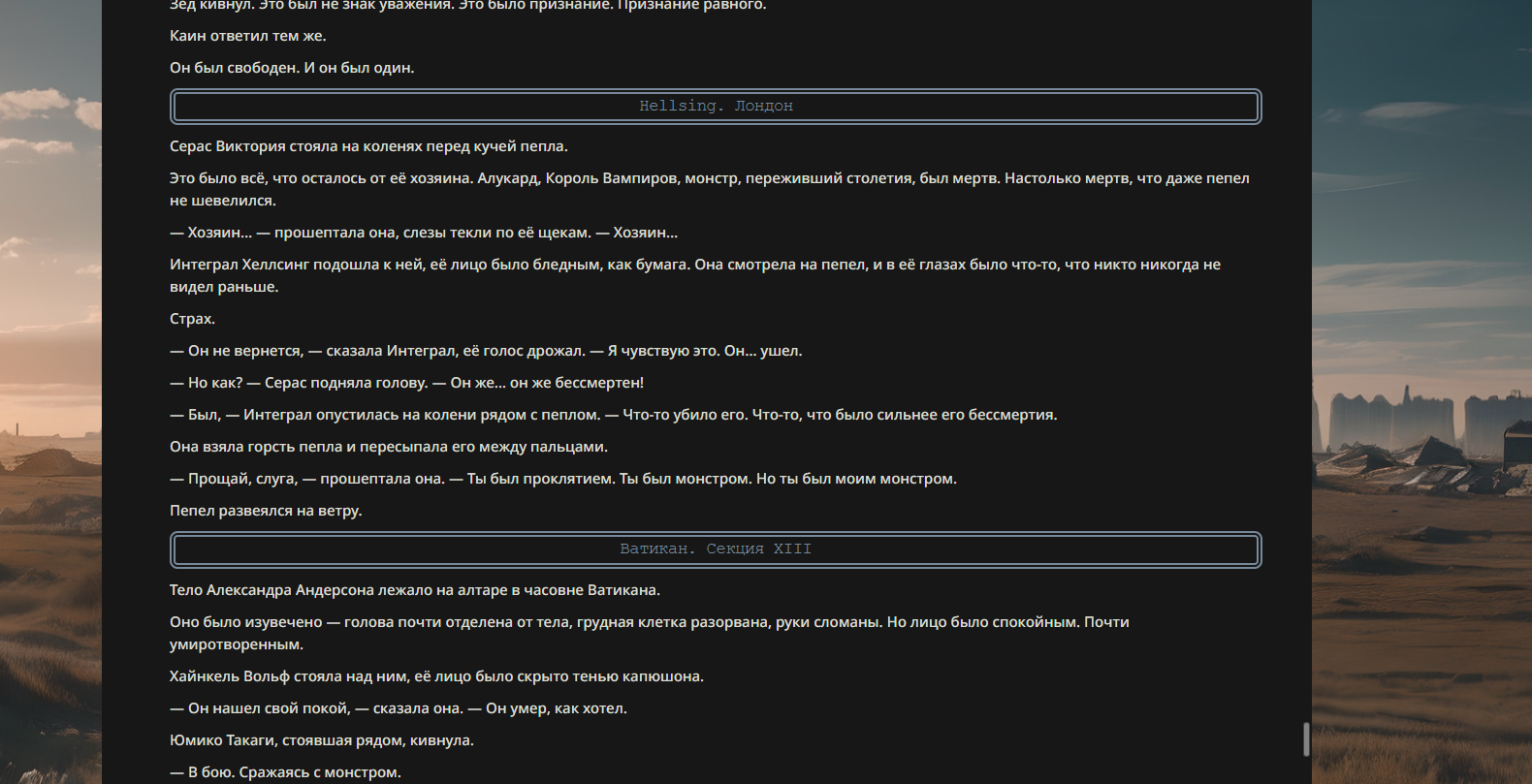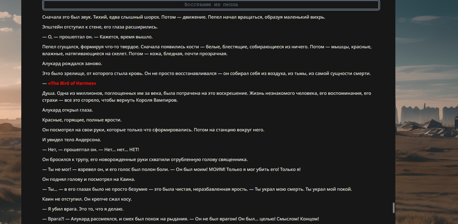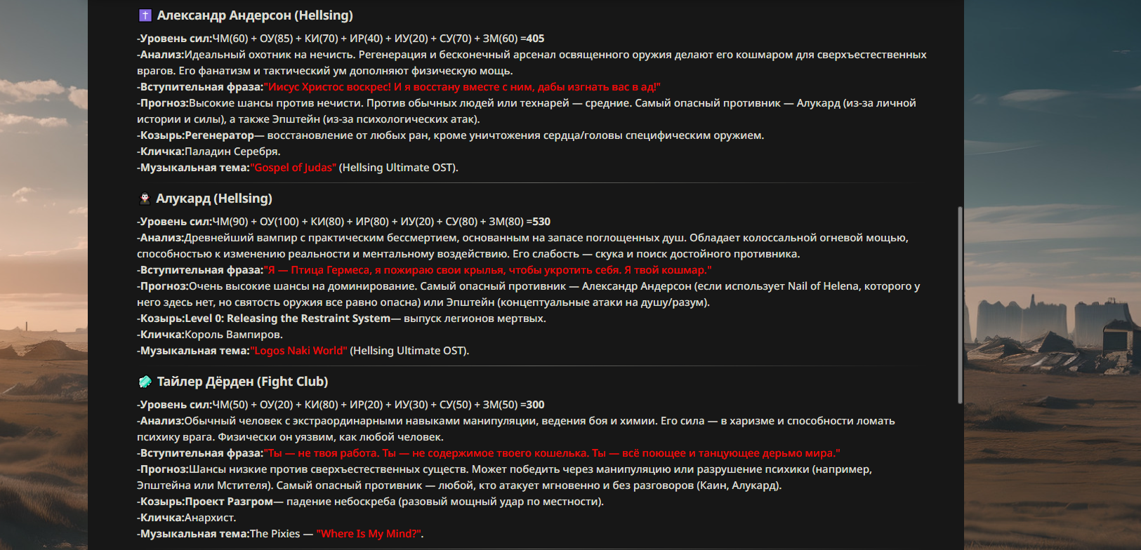 >>330699018 True Name: Алукард (Дракула) Title: Великий Убийца Экзорцистов / Король Безмолвия Class: Berserker (доступен как Avenger/Lancer) Alignment: Chaotic Evil / Neutral [Parameters] Strength: A+ Endurance: EX (Фактическое бессмертие через запас душ) Agility: A Mana: A+ Luck: D NP: EX [Class Skills] Mad Enhancement (B): Повышает физические характеристики, но Алукард сохраняет рассудок. Его «безумие» — это абсолютная отрешенность и жажда достойной смерти от руки человека. Avenger (A): Скорость накопления энергии растет при получении урона. Ненависть мира лишь подпитывает его мощь. [Personal Skills] The Bird of Hermes (EX): «Птица Гермеса — моё имя, я ем свои крылья, чтобы меня укротили». Позволяет игнорировать смертельные раны, расходуя накопленные души (Lives). Чтобы убить его, нужно уничтожить его столько раз, сколько существ он поглотил. Exorcist Slayer (A+): Огромный бонус к урону против врагов с атрибутами «Saint», «Divine» или принадлежащих к Церкви. Его присутствие подавляет святую магию. Mystic Eyes of Enchantment (A): Высокоуровневый гипноз и манипуляция разумом. Shapeshift (Vampiric) (A): Способность принимать облик тумана, стаи летучих мышей, теней или демонического пса (Баскервиль). [Noble Phantasms] 1. Cromwell Invocation — «Снятие печатей ограничения» Rank: A+ (Anti-Unit / Self) Высвобождение истинной формы. С каждым уровнем снятия печати Алукард получает доступ к более разрушительным способностям и увеличивает охват своих теней. 2. Level 0: Releasing the Restraint System — «Река Смерти» Rank: EX (Anti-Army) Алукард выпускает все миллионы душ, поглощенных им за века. Поле боя превращается в кровавый океан, из которого восстают легионы рыцарей, вассалов и жертв, подчиненных его воле. В этом состоянии он уязвим (одна жизнь), но практически непобедим в масштабах войны. 3. Jackal & Casull — «Инструменты Погибели» Rank: C~B (Anti-Unit) Пара кастомных пистолетов, стреляющих освященными серебряными пулями массой 39г. Игнорируют регенерацию большинства сверхъестественных существ.