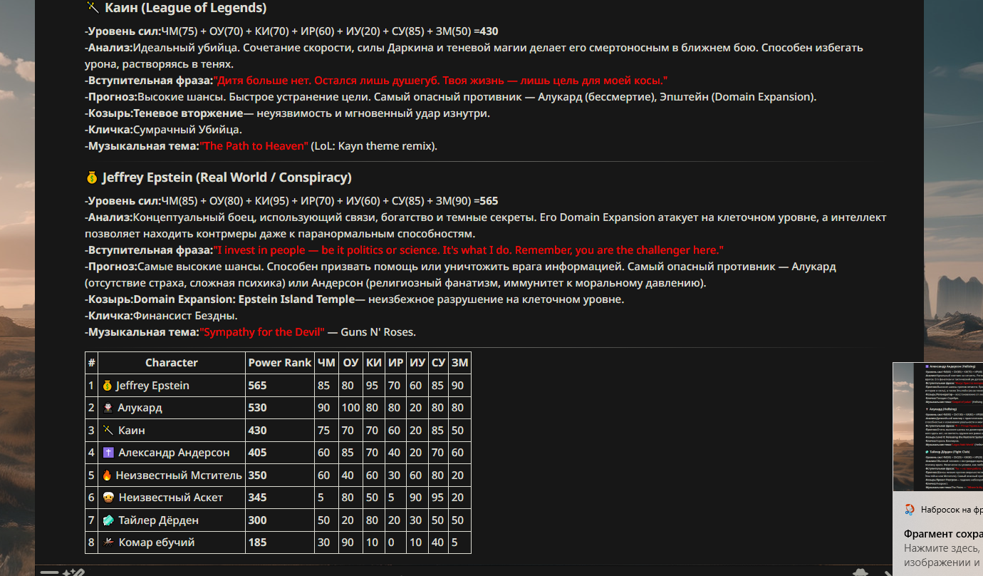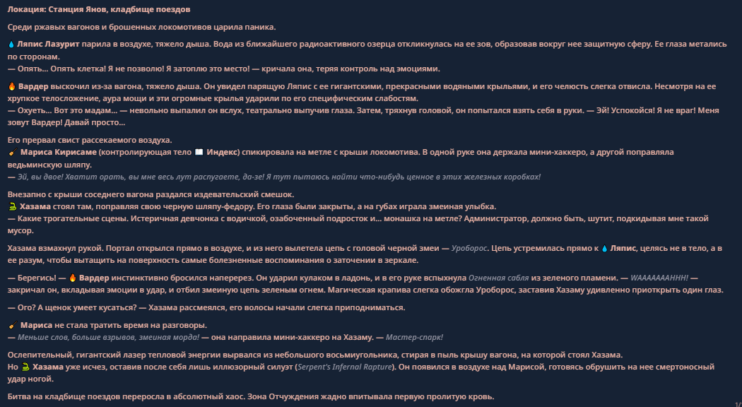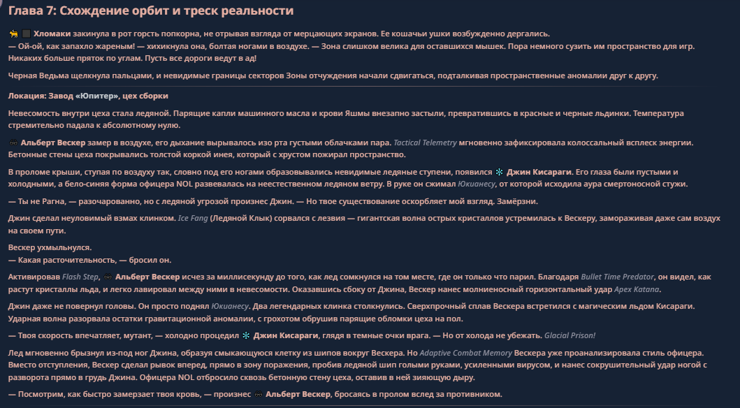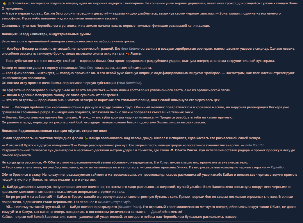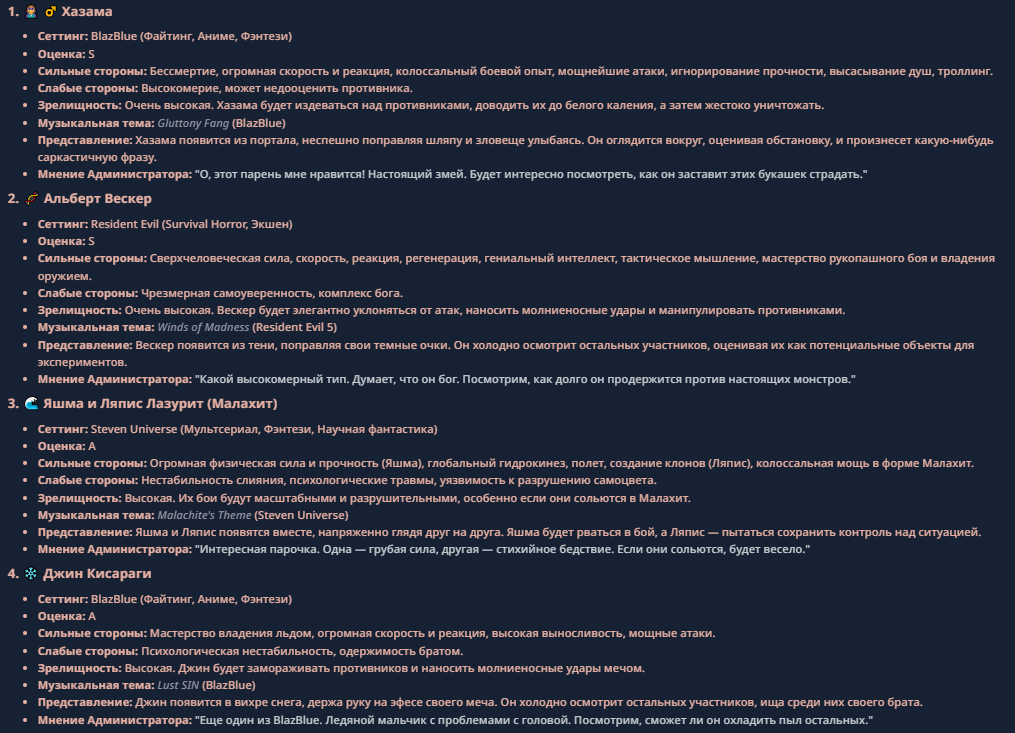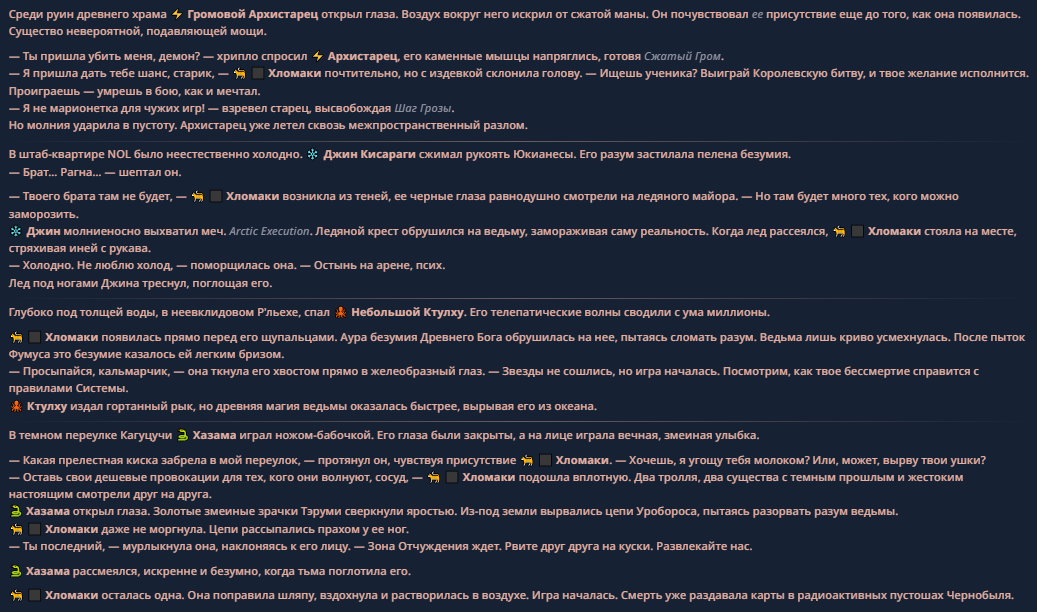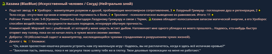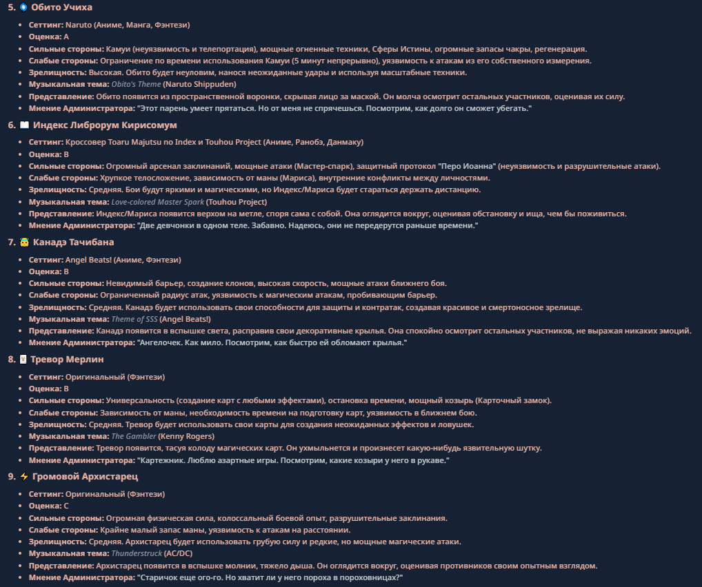 >>330710317 <character name="Громовой Архистарец"> Старый боевой маг. Когда-то он был архимагом великих орденов, но десятилетия войн и магических катастроф сделали его тем, чем он является сейчас — живым оружием, соединяющим древнюю магию и грубую физическую силу. Его тело выглядит как тело древнего титана: массивные плечи, каменные мышцы, руки, способные разорвать сталь. Но под седой бородой и усталыми глазами скрывается разум, прошедший сотни битв, осад, магических дуэлей и катастроф. Он не раз переживал собственную смерть на поле боя. Главная особенность Архистарца — крайне малый запас маны. Он не способен долго колдовать, как обычные маги. Но те немногие заклинания, которые он использует, обладают чудовищной силой, потому что он сжимает ману до предела, превращая её в концентрированные взрывы энергии. Желание: найти достойного ученика, который переживёт его последнюю битву. Способности "Сжатый Гром" Архистарец концентрирует почти весь свой запас маны в ладони и выпускает её в виде сверхплотной сферы молнии. Взрыв эквивалентен удару природной молнии, но направлен и контролируем. "Мускулы Титана" Многолетние тренировки и магическое укрепление тела сделали его физически невероятно сильным и крепким "Магическая Компрессия" Его уникальная техника. Он способен сжимать ману до экстремальной плотности, превращая даже маленький запас энергии в разрушительные заклинания. "Шаг Грозы" Короткий магический рывок на расстояние до нескольких метров. Мгновенный выброс энергии, который толкает его тело вперёд с огромной скоростью. "Боевой Архимаг" Он прошёл сотни войн и понимает бой на инстинктивном уровне. Его опыт позволяет: читать стиль противника находить слабости предугадывать заклинания экономить энергию до идеального момента удара. "Старая Буря" Когда его тело получает серьёзные ранения, в нём просыпается древний инстинкт выживания. Его мышцы и нервная система работают на пределе, а остатки маны начинают спонтанно вырываться молниями вокруг него. В этом состоянии он становится значительно быстрее и агрессивнее, мана восстанавливается быстрее "Громовая Мудрость" Десятилетия опыта дают ему способность мгновенно анализировать ситуацию. Он может: определить тип магии противника понять природу существа предсказать исход сражения найти единственный шанс на победу даже против значительно более сильного врага. "Последний Удар Бури" Крайняя техника. Архистарец выпускает всю оставшуюся ману разом, превращая её в гигантский электрический разряд вокруг себя. После применения он практически полностью истощён, но удар способен уничтожить даже могущественных противников. <character name>