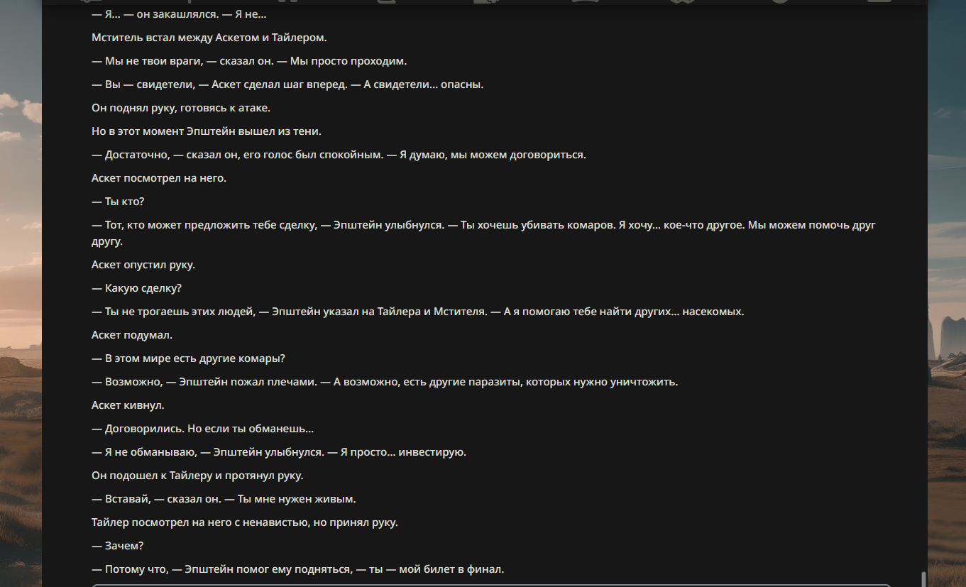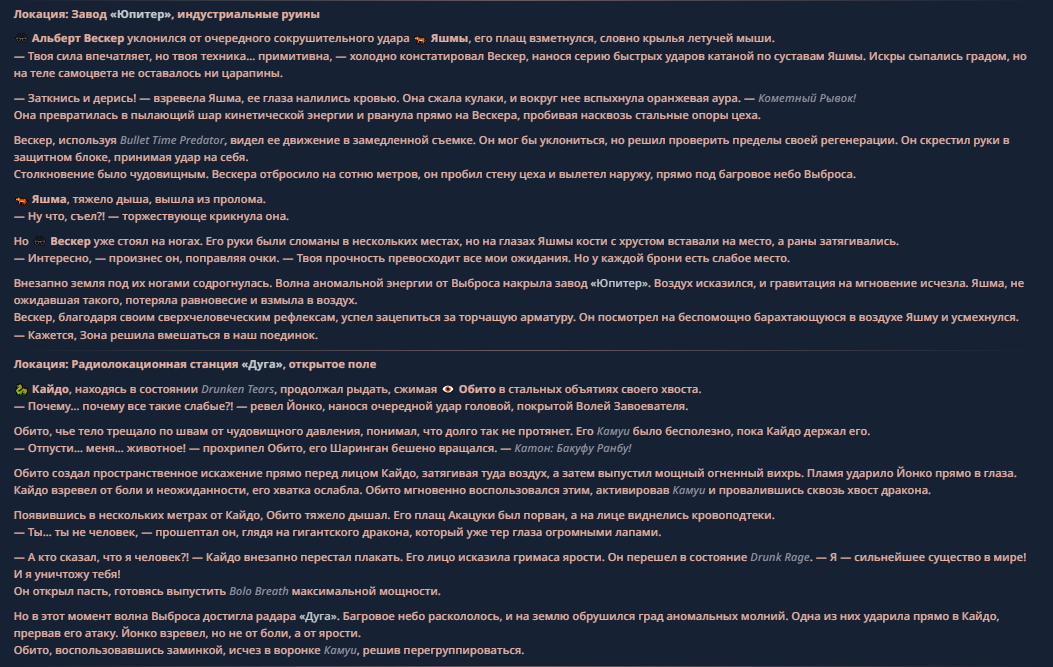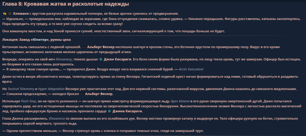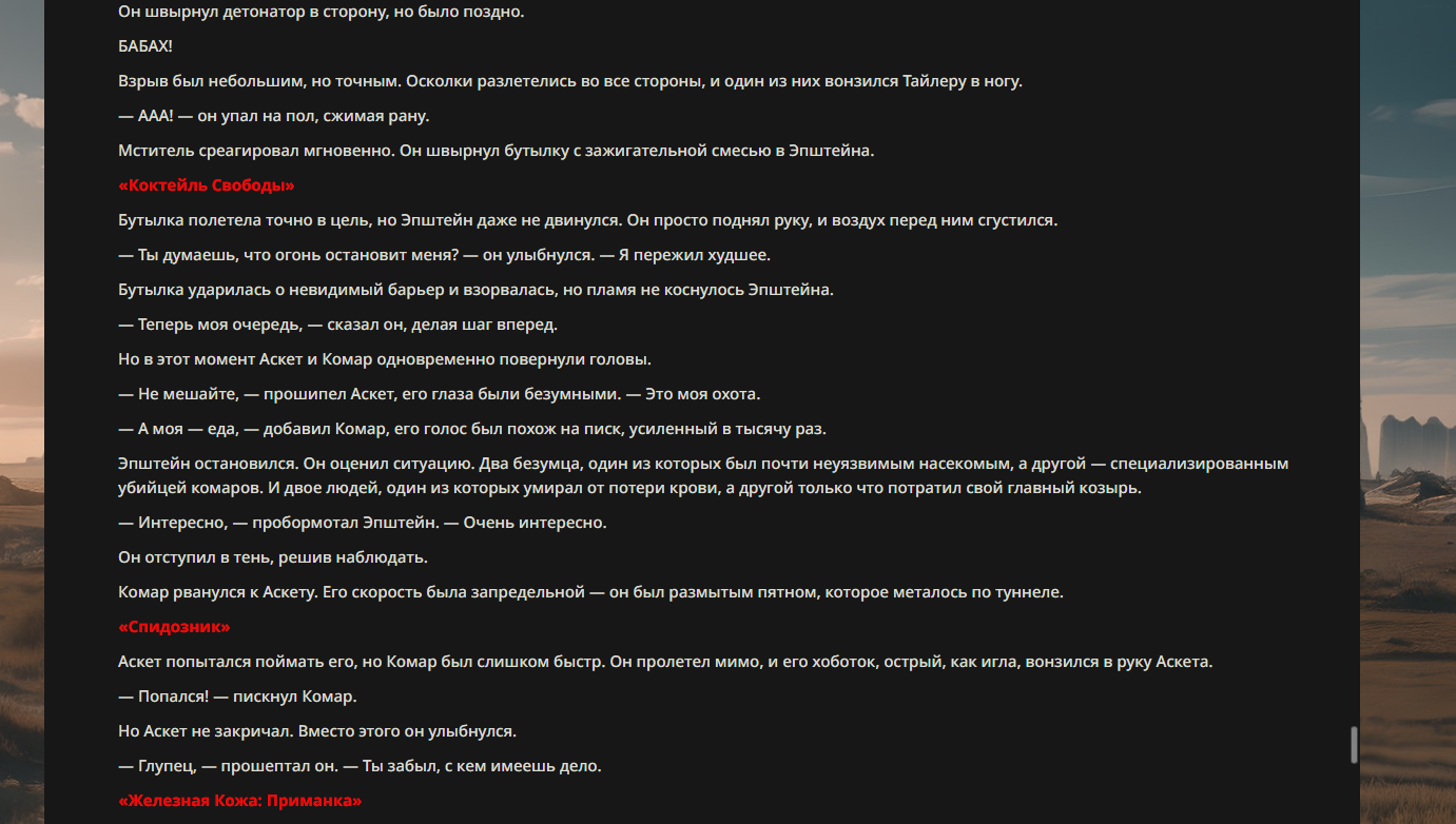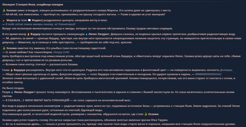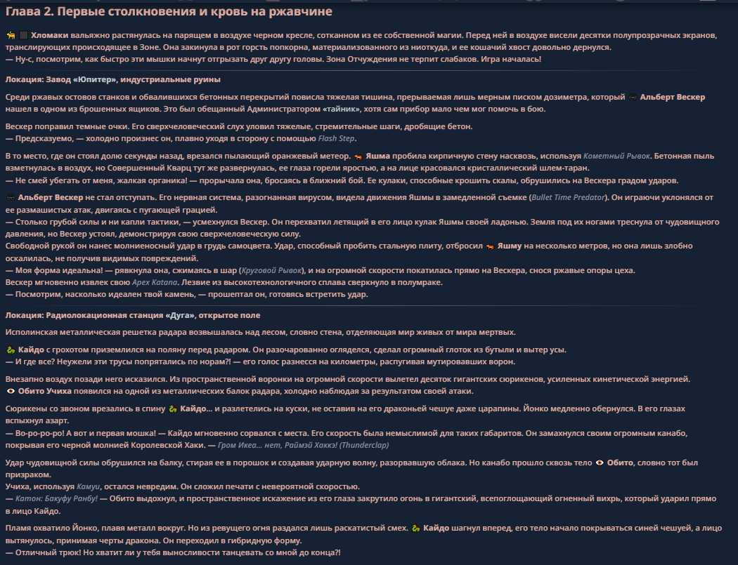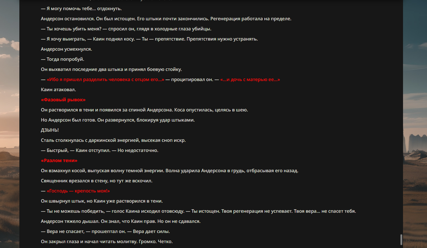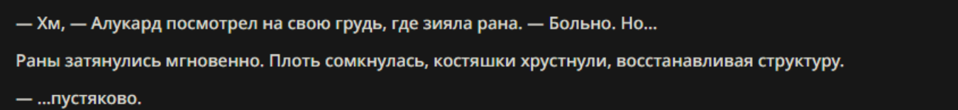 >>330710317 <character name="Громовой Архистарец"> Старый боевой маг. Когда-то он был архимагом великих орденов, но десятилетия войн и магических катастроф сделали его тем, чем он является сейчас — живым оружием, соединяющим древнюю магию и грубую физическую силу. Его тело выглядит как тело древнего титана: массивные плечи, каменные мышцы, руки, способные разорвать сталь. Но под седой бородой и усталыми глазами скрывается разум, прошедший сотни битв, осад, магических дуэлей и катастроф. Он не раз переживал собственную смерть на поле боя. Главная особенность Архистарца — крайне малый запас маны. Он не способен долго колдовать, как обычные маги. Но те немногие заклинания, которые он использует, обладают чудовищной силой, потому что он сжимает ману до предела, превращая её в концентрированные взрывы энергии. Желание: найти достойного ученика, который переживёт его последнюю битву. Способности "Сжатый Гром" Архистарец концентрирует почти весь свой запас маны в ладони и выпускает её в виде сверхплотной сферы молнии. Взрыв эквивалентен удару природной молнии, но направлен и контролируем. "Мускулы Титана" Многолетние тренировки и магическое укрепление тела сделали его физически невероятно сильным и крепким "Магическая Компрессия" Его уникальная техника. Он способен сжимать ману до экстремальной плотности, превращая даже маленький запас энергии в разрушительные заклинания. "Шаг Грозы" Короткий магический рывок на расстояние до нескольких метров. Мгновенный выброс энергии, который толкает его тело вперёд с огромной скоростью. "Боевой Архимаг" Он прошёл сотни войн и понимает бой на инстинктивном уровне. Его опыт позволяет: читать стиль противника находить слабости предугадывать заклинания экономить энергию до идеального момента удара. "Старая Буря" Когда его тело получает серьёзные ранения, в нём просыпается древний инстинкт выживания. Его мышцы и нервная система работают на пределе, а остатки маны начинают спонтанно вырываться молниями вокруг него. В этом состоянии он становится значительно быстрее и агрессивнее, мана восстанавливается быстрее "Громовая Мудрость" Десятилетия опыта дают ему способность мгновенно анализировать ситуацию. Он может: определить тип магии противника понять природу существа предсказать исход сражения найти единственный шанс на победу даже против значительно более сильного врага. "Последний Удар Бури" Крайняя техника. Архистарец выпускает всю оставшуюся ману разом, превращая её в гигантский электрический разряд вокруг себя. После применения он практически полностью истощён, но удар способен уничтожить даже могущественных противников. <character name>
