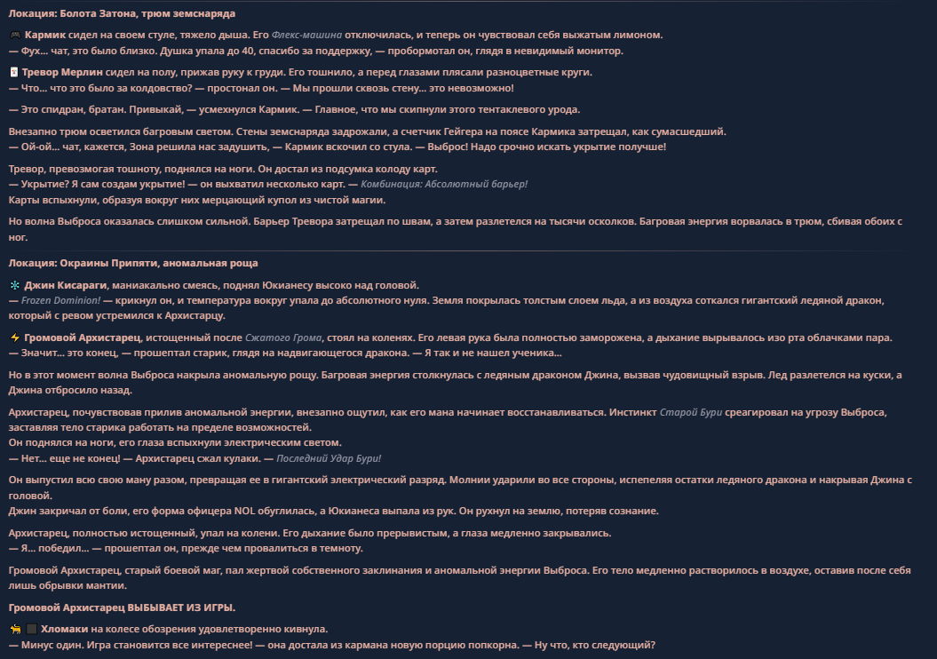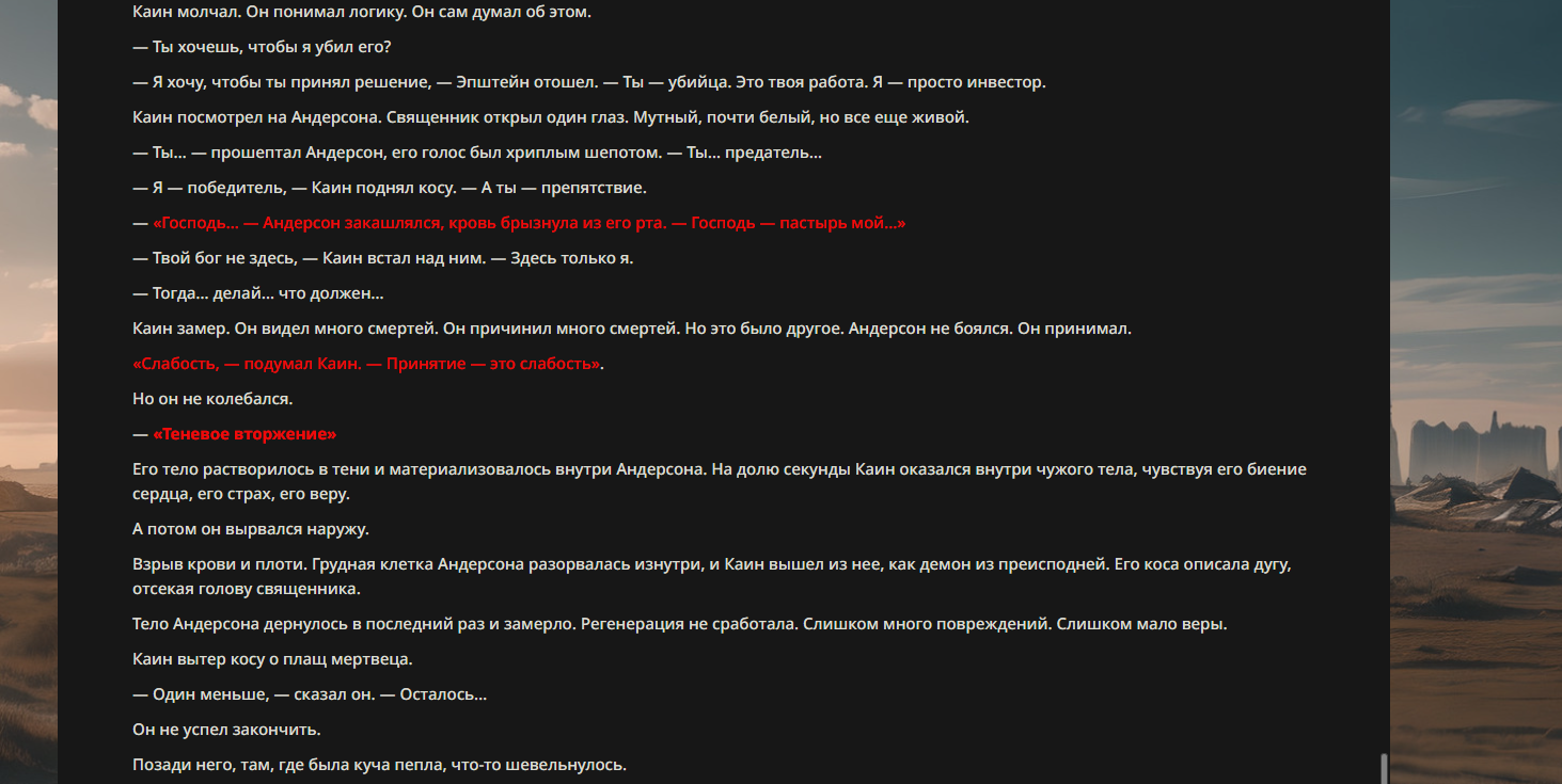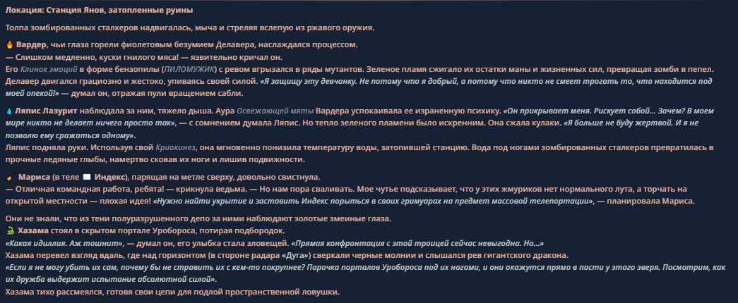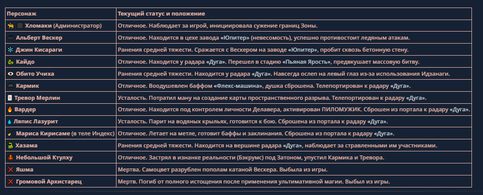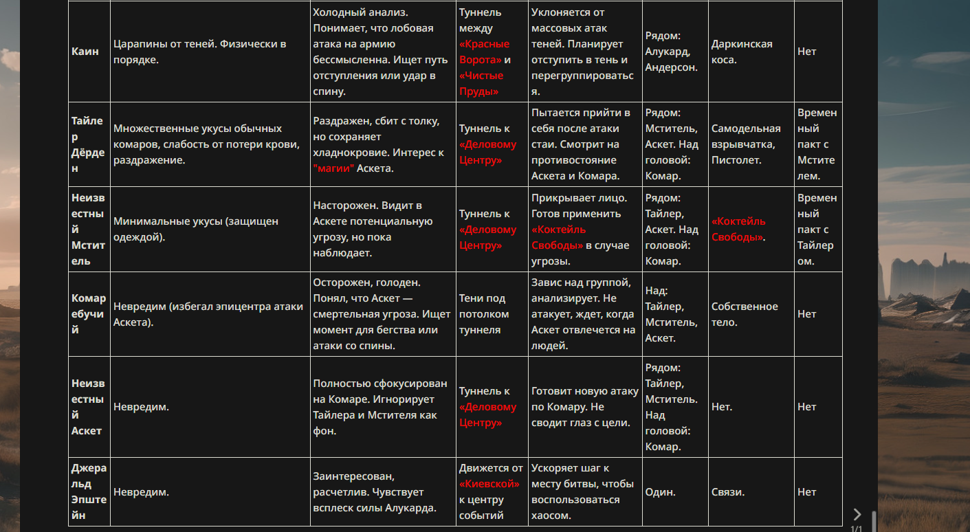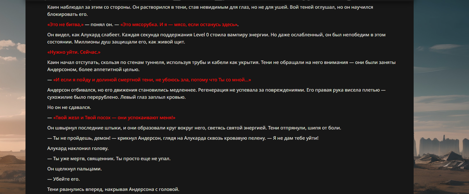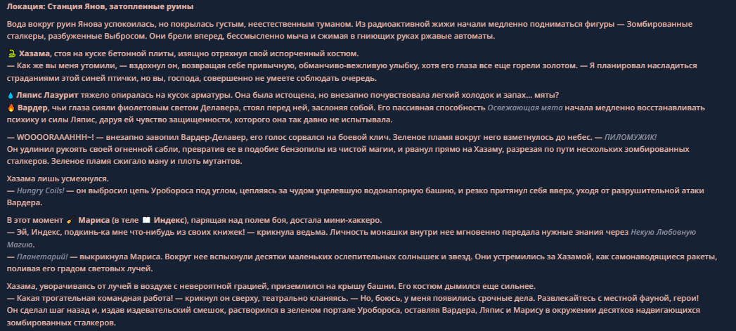 >>330710317 <character name="Громовой Архистарец"> Старый боевой маг. Когда-то он был архимагом великих орденов, но десятилетия войн и магических катастроф сделали его тем, чем он является сейчас — живым оружием, соединяющим древнюю магию и грубую физическую силу. Его тело выглядит как тело древнего титана: массивные плечи, каменные мышцы, руки, способные разорвать сталь. Но под седой бородой и усталыми глазами скрывается разум, прошедший сотни битв, осад, магических дуэлей и катастроф. Он не раз переживал собственную смерть на поле боя. Главная особенность Архистарца — крайне малый запас маны. Он не способен долго колдовать, как обычные маги. Но те немногие заклинания, которые он использует, обладают чудовищной силой, потому что он сжимает ману до предела, превращая её в концентрированные взрывы энергии. Желание: найти достойного ученика, который переживёт его последнюю битву. Способности "Сжатый Гром" Архистарец концентрирует почти весь свой запас маны в ладони и выпускает её в виде сверхплотной сферы молнии. Взрыв эквивалентен удару природной молнии, но направлен и контролируем. "Мускулы Титана" Многолетние тренировки и магическое укрепление тела сделали его физически невероятно сильным и крепким "Магическая Компрессия" Его уникальная техника. Он способен сжимать ману до экстремальной плотности, превращая даже маленький запас энергии в разрушительные заклинания. "Шаг Грозы" Короткий магический рывок на расстояние до нескольких метров. Мгновенный выброс энергии, который толкает его тело вперёд с огромной скоростью. "Боевой Архимаг" Он прошёл сотни войн и понимает бой на инстинктивном уровне. Его опыт позволяет: читать стиль противника находить слабости предугадывать заклинания экономить энергию до идеального момента удара. "Старая Буря" Когда его тело получает серьёзные ранения, в нём просыпается древний инстинкт выживания. Его мышцы и нервная система работают на пределе, а остатки маны начинают спонтанно вырываться молниями вокруг него. В этом состоянии он становится значительно быстрее и агрессивнее, мана восстанавливается быстрее "Громовая Мудрость" Десятилетия опыта дают ему способность мгновенно анализировать ситуацию. Он может: определить тип магии противника понять природу существа предсказать исход сражения найти единственный шанс на победу даже против значительно более сильного врага. "Последний Удар Бури" Крайняя техника. Архистарец выпускает всю оставшуюся ману разом, превращая её в гигантский электрический разряд вокруг себя. После применения он практически полностью истощён, но удар способен уничтожить даже могущественных противников. <character name>