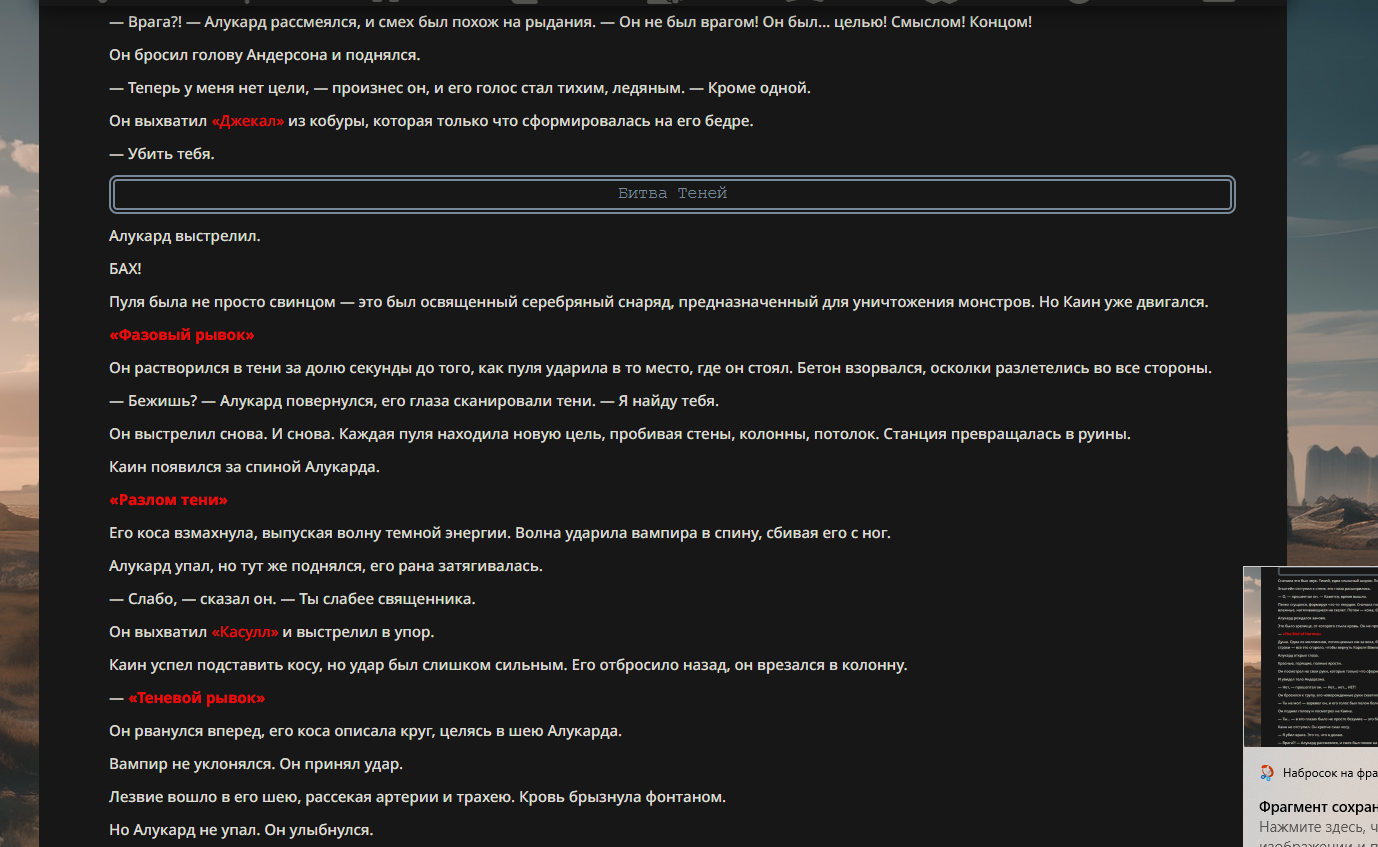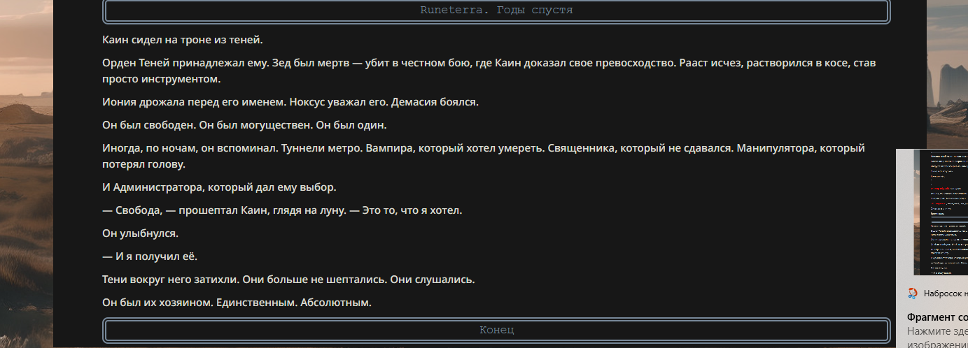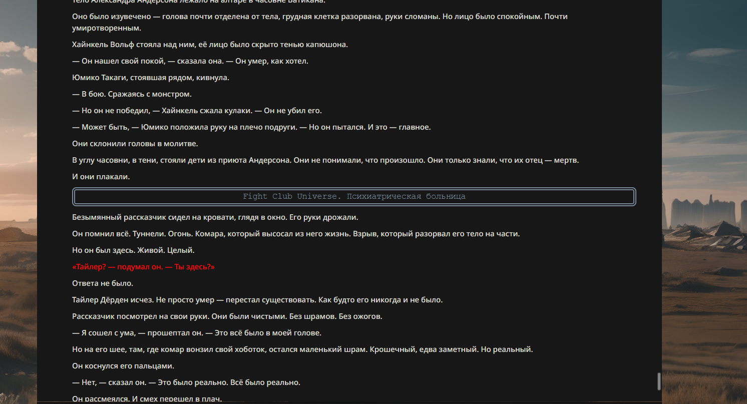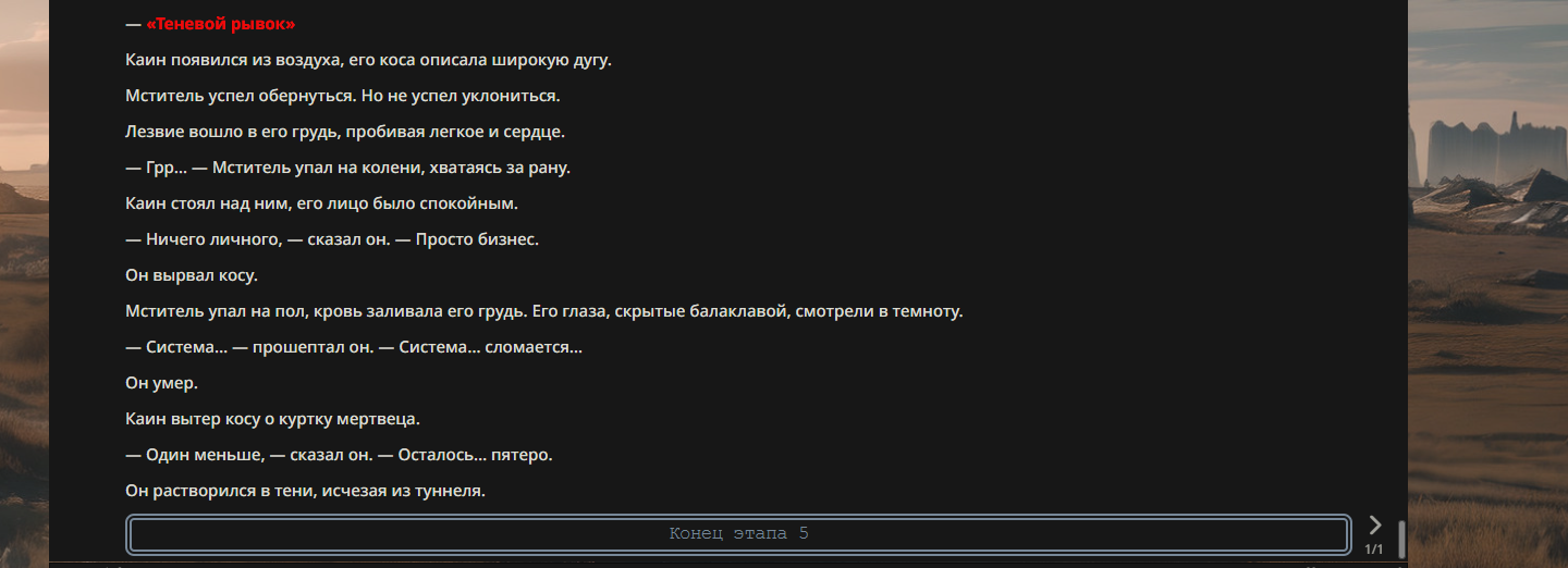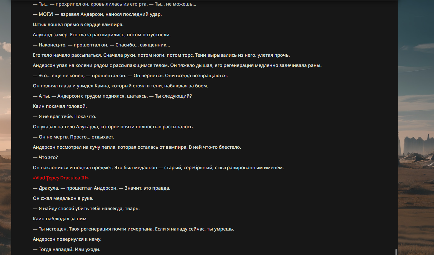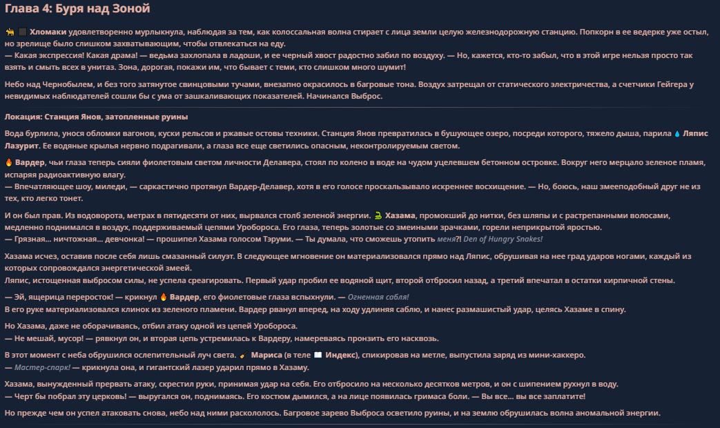 >>330710317 <character name="Громовой Архистарец"> Старый боевой маг. Когда-то он был архимагом великих орденов, но десятилетия войн и магических катастроф сделали его тем, чем он является сейчас — живым оружием, соединяющим древнюю магию и грубую физическую силу. Его тело выглядит как тело древнего титана: массивные плечи, каменные мышцы, руки, способные разорвать сталь. Но под седой бородой и усталыми глазами скрывается разум, прошедший сотни битв, осад, магических дуэлей и катастроф. Он не раз переживал собственную смерть на поле боя. Главная особенность Архистарца — крайне малый запас маны. Он не способен долго колдовать, как обычные маги. Но те немногие заклинания, которые он использует, обладают чудовищной силой, потому что он сжимает ману до предела, превращая её в концентрированные взрывы энергии. Желание: найти достойного ученика, который переживёт его последнюю битву. Способности "Сжатый Гром" Архистарец концентрирует почти весь свой запас маны в ладони и выпускает её в виде сверхплотной сферы молнии. Взрыв эквивалентен удару природной молнии, но направлен и контролируем. "Мускулы Титана" Многолетние тренировки и магическое укрепление тела сделали его физически невероятно сильным и крепким "Магическая Компрессия" Его уникальная техника. Он способен сжимать ману до экстремальной плотности, превращая даже маленький запас энергии в разрушительные заклинания. "Шаг Грозы" Короткий магический рывок на расстояние до нескольких метров. Мгновенный выброс энергии, который толкает его тело вперёд с огромной скоростью. "Боевой Архимаг" Он прошёл сотни войн и понимает бой на инстинктивном уровне. Его опыт позволяет: читать стиль противника находить слабости предугадывать заклинания экономить энергию до идеального момента удара. "Старая Буря" Когда его тело получает серьёзные ранения, в нём просыпается древний инстинкт выживания. Его мышцы и нервная система работают на пределе, а остатки маны начинают спонтанно вырываться молниями вокруг него. В этом состоянии он становится значительно быстрее и агрессивнее, мана восстанавливается быстрее "Громовая Мудрость" Десятилетия опыта дают ему способность мгновенно анализировать ситуацию. Он может: определить тип магии противника понять природу существа предсказать исход сражения найти единственный шанс на победу даже против значительно более сильного врага. "Последний Удар Бури" Крайняя техника. Архистарец выпускает всю оставшуюся ману разом, превращая её в гигантский электрический разряд вокруг себя. После применения он практически полностью истощён, но удар способен уничтожить даже могущественных противников. <character name>