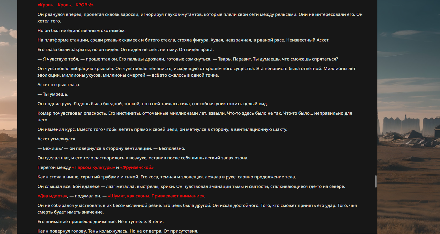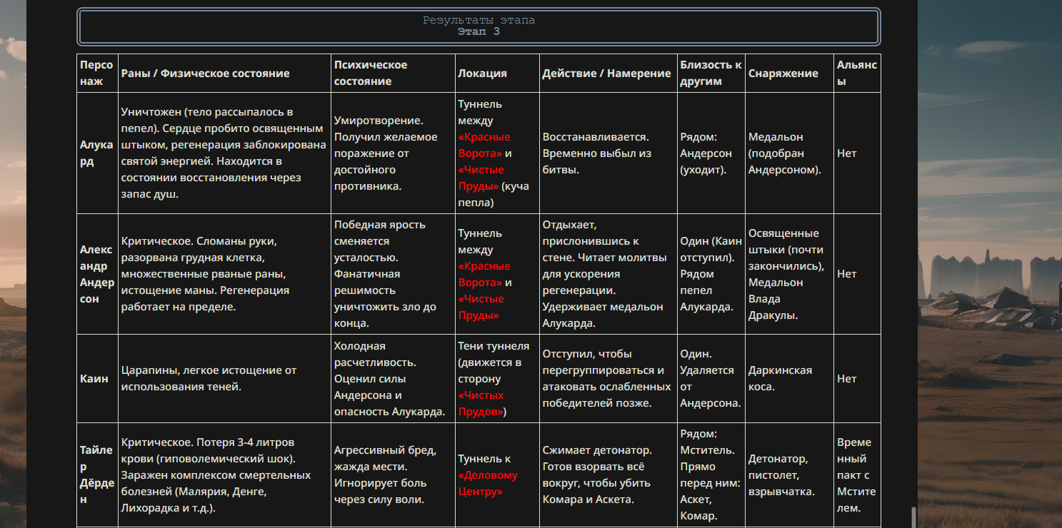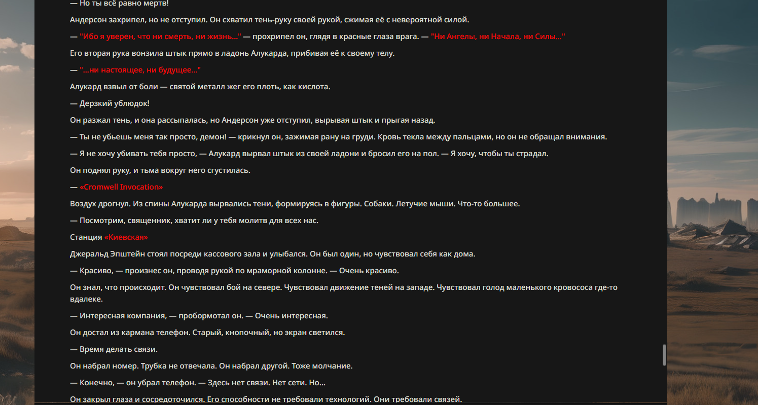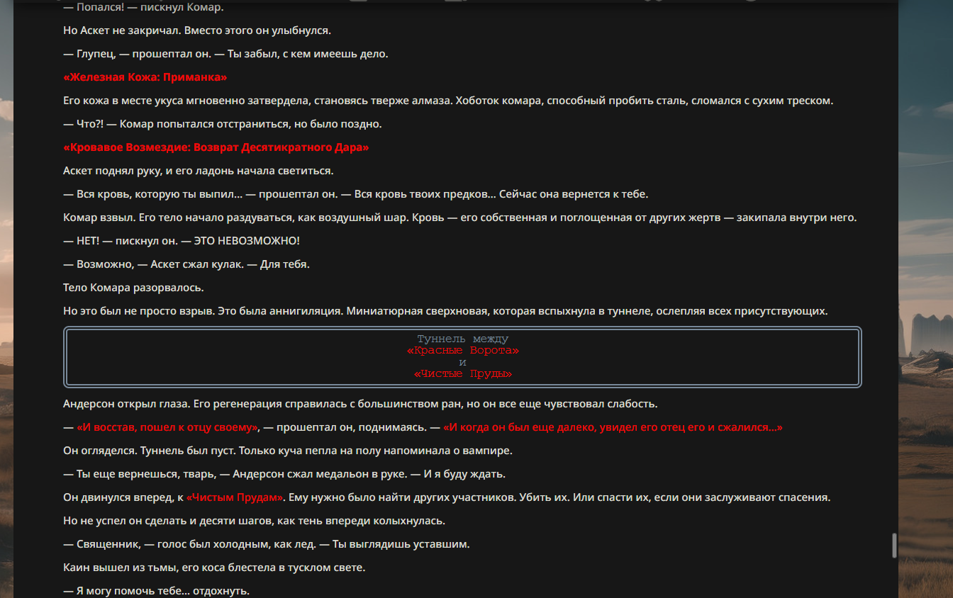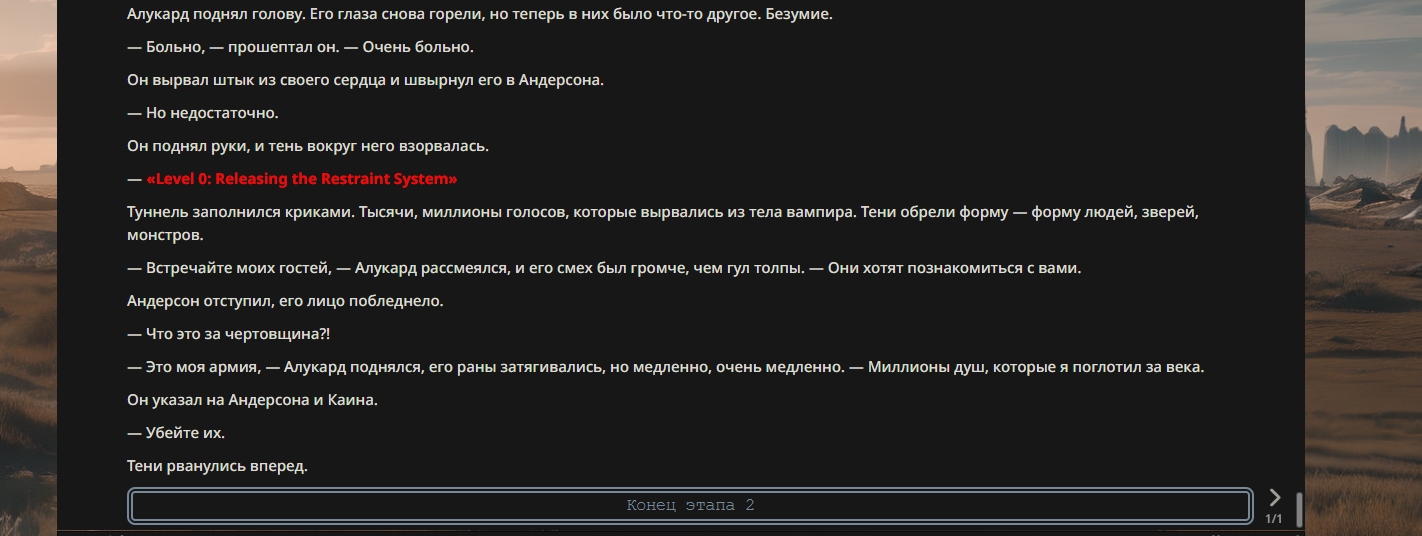 >>330710317 <character name="Громовой Архистарец"> Старый боевой маг. Когда-то он был архимагом великих орденов, но десятилетия войн и магических катастроф сделали его тем, чем он является сейчас — живым оружием, соединяющим древнюю магию и грубую физическую силу. Его тело выглядит как тело древнего титана: массивные плечи, каменные мышцы, руки, способные разорвать сталь. Но под седой бородой и усталыми глазами скрывается разум, прошедший сотни битв, осад, магических дуэлей и катастроф. Он не раз переживал собственную смерть на поле боя. Главная особенность Архистарца — крайне малый запас маны. Он не способен долго колдовать, как обычные маги. Но те немногие заклинания, которые он использует, обладают чудовищной силой, потому что он сжимает ману до предела, превращая её в концентрированные взрывы энергии. Желание: найти достойного ученика, который переживёт его последнюю битву. Способности "Сжатый Гром" Архистарец концентрирует почти весь свой запас маны в ладони и выпускает её в виде сверхплотной сферы молнии. Взрыв эквивалентен удару природной молнии, но направлен и контролируем. "Мускулы Титана" Многолетние тренировки и магическое укрепление тела сделали его физически невероятно сильным и крепким "Магическая Компрессия" Его уникальная техника. Он способен сжимать ману до экстремальной плотности, превращая даже маленький запас энергии в разрушительные заклинания. "Шаг Грозы" Короткий магический рывок на расстояние до нескольких метров. Мгновенный выброс энергии, который толкает его тело вперёд с огромной скоростью. "Боевой Архимаг" Он прошёл сотни войн и понимает бой на инстинктивном уровне. Его опыт позволяет: читать стиль противника находить слабости предугадывать заклинания экономить энергию до идеального момента удара. "Старая Буря" Когда его тело получает серьёзные ранения, в нём просыпается древний инстинкт выживания. Его мышцы и нервная система работают на пределе, а остатки маны начинают спонтанно вырываться молниями вокруг него. В этом состоянии он становится значительно быстрее и агрессивнее, мана восстанавливается быстрее "Громовая Мудрость" Десятилетия опыта дают ему способность мгновенно анализировать ситуацию. Он может: определить тип магии противника понять природу существа предсказать исход сражения найти единственный шанс на победу даже против значительно более сильного врага. "Последний Удар Бури" Крайняя техника. Архистарец выпускает всю оставшуюся ману разом, превращая её в гигантский электрический разряд вокруг себя. После применения он практически полностью истощён, но удар способен уничтожить даже могущественных противников. <character name>