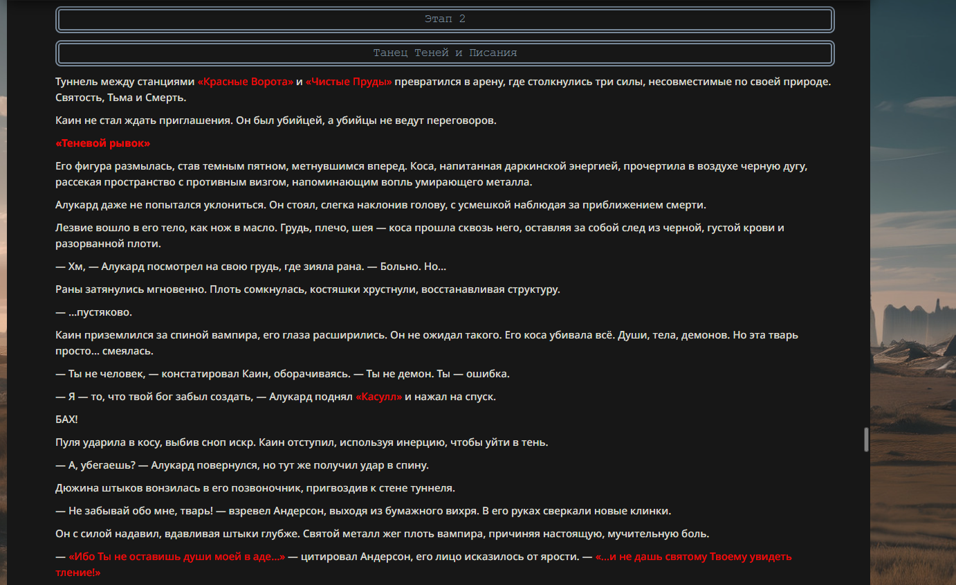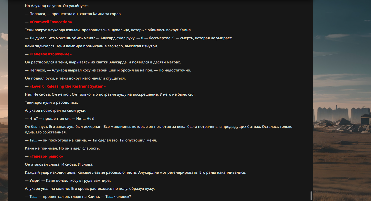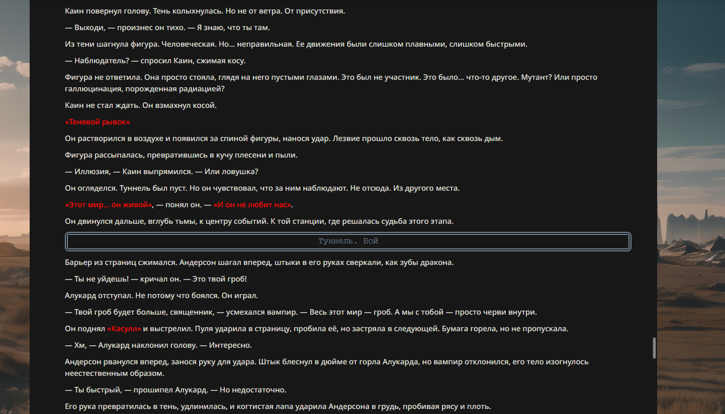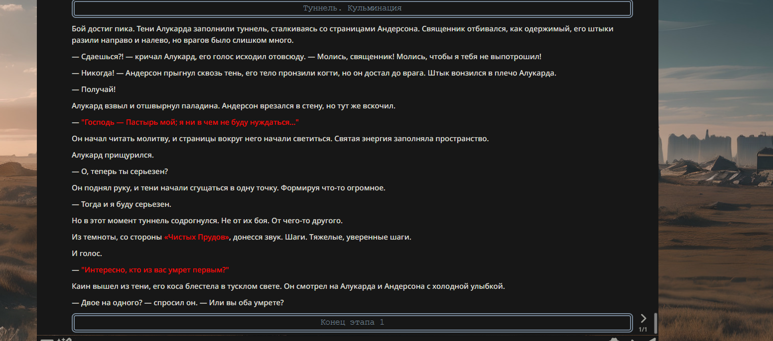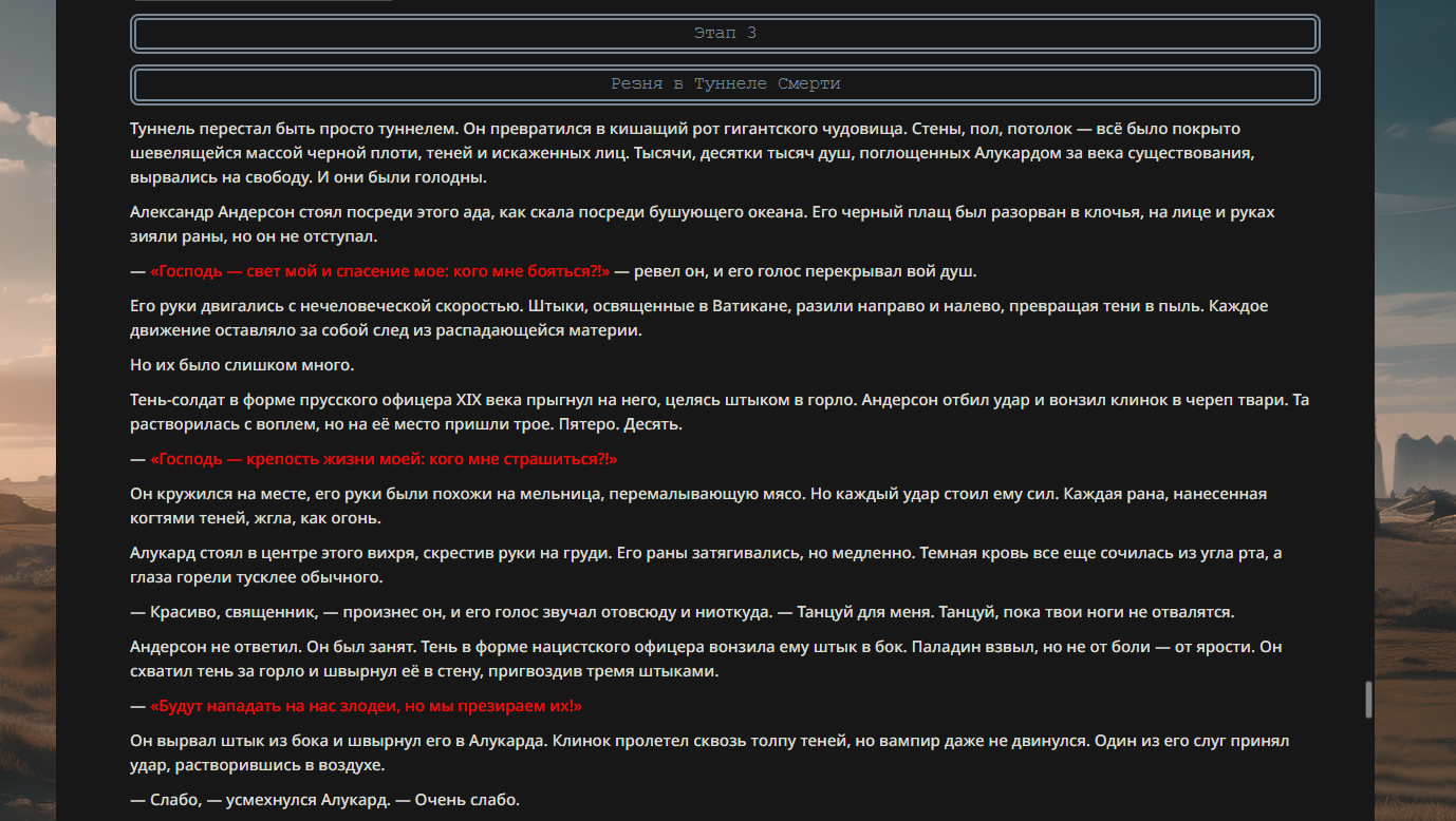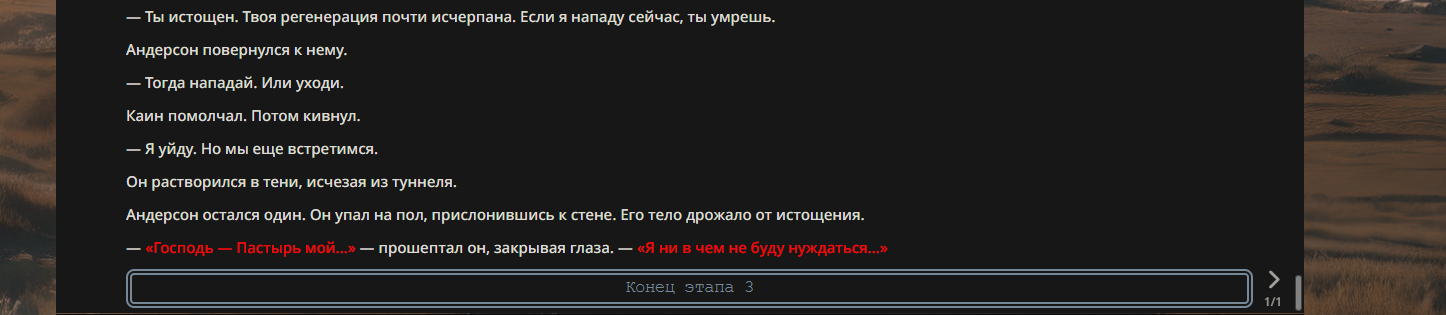 >>330710317 <character name="Громовой Архистарец"> Старый боевой маг. Когда-то он был архимагом великих орденов, но десятилетия войн и магических катастроф сделали его тем, чем он является сейчас — живым оружием, соединяющим древнюю магию и грубую физическую силу. Его тело выглядит как тело древнего титана: массивные плечи, каменные мышцы, руки, способные разорвать сталь. Но под седой бородой и усталыми глазами скрывается разум, прошедший сотни битв, осад, магических дуэлей и катастроф. Он не раз переживал собственную смерть на поле боя. Главная особенность Архистарца — крайне малый запас маны. Он не способен долго колдовать, как обычные маги. Но те немногие заклинания, которые он использует, обладают чудовищной силой, потому что он сжимает ману до предела, превращая её в концентрированные взрывы энергии. Желание: найти достойного ученика, который переживёт его последнюю битву. Способности "Сжатый Гром" Архистарец концентрирует почти весь свой запас маны в ладони и выпускает её в виде сверхплотной сферы молнии. Взрыв эквивалентен удару природной молнии, но направлен и контролируем. "Мускулы Титана" Многолетние тренировки и магическое укрепление тела сделали его физически невероятно сильным и крепким "Магическая Компрессия" Его уникальная техника. Он способен сжимать ману до экстремальной плотности, превращая даже маленький запас энергии в разрушительные заклинания. "Шаг Грозы" Короткий магический рывок на расстояние до нескольких метров. Мгновенный выброс энергии, который толкает его тело вперёд с огромной скоростью. "Боевой Архимаг" Он прошёл сотни войн и понимает бой на инстинктивном уровне. Его опыт позволяет: читать стиль противника находить слабости предугадывать заклинания экономить энергию до идеального момента удара. "Старая Буря" Когда его тело получает серьёзные ранения, в нём просыпается древний инстинкт выживания. Его мышцы и нервная система работают на пределе, а остатки маны начинают спонтанно вырываться молниями вокруг него. В этом состоянии он становится значительно быстрее и агрессивнее, мана восстанавливается быстрее "Громовая Мудрость" Десятилетия опыта дают ему способность мгновенно анализировать ситуацию. Он может: определить тип магии противника понять природу существа предсказать исход сражения найти единственный шанс на победу даже против значительно более сильного врага. "Последний Удар Бури" Крайняя техника. Архистарец выпускает всю оставшуюся ману разом, превращая её в гигантский электрический разряд вокруг себя. После применения он практически полностью истощён, но удар способен уничтожить даже могущественных противников. <character name>