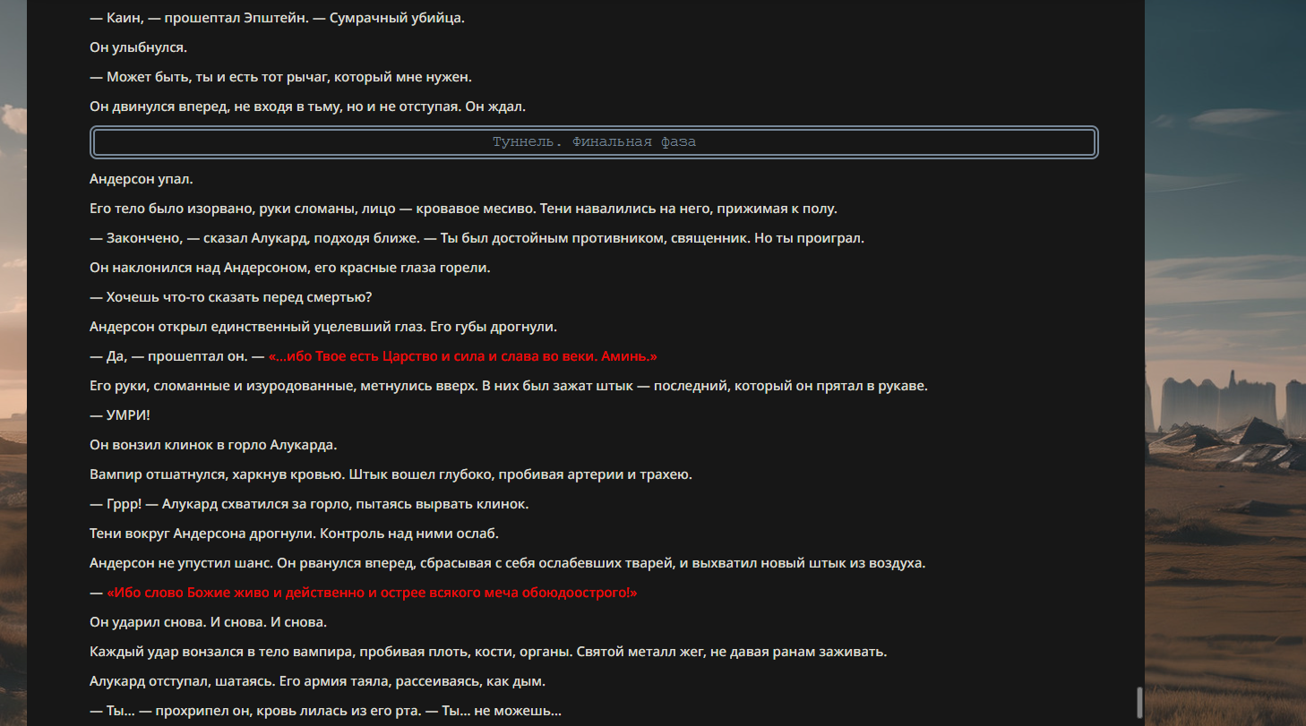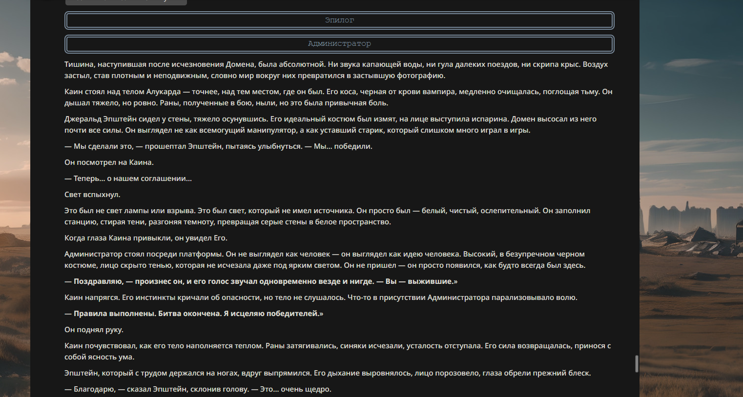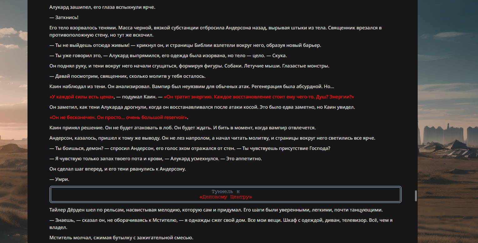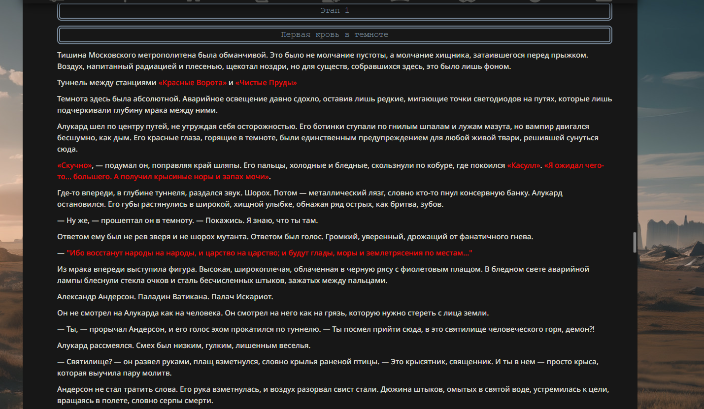 >>330710317 <character name="Громовой Архистарец"> Старый боевой маг. Когда-то он был архимагом великих орденов, но десятилетия войн и магических катастроф сделали его тем, чем он является сейчас — живым оружием, соединяющим древнюю магию и грубую физическую силу. Его тело выглядит как тело древнего титана: массивные плечи, каменные мышцы, руки, способные разорвать сталь. Но под седой бородой и усталыми глазами скрывается разум, прошедший сотни битв, осад, магических дуэлей и катастроф. Он не раз переживал собственную смерть на поле боя. Главная особенность Архистарца — крайне малый запас маны. Он не способен долго колдовать, как обычные маги. Но те немногие заклинания, которые он использует, обладают чудовищной силой, потому что он сжимает ману до предела, превращая её в концентрированные взрывы энергии. Желание: найти достойного ученика, который переживёт его последнюю битву. Способности "Сжатый Гром" Архистарец концентрирует почти весь свой запас маны в ладони и выпускает её в виде сверхплотной сферы молнии. Взрыв эквивалентен удару природной молнии, но направлен и контролируем. "Мускулы Титана" Многолетние тренировки и магическое укрепление тела сделали его физически невероятно сильным и крепким "Магическая Компрессия" Его уникальная техника. Он способен сжимать ману до экстремальной плотности, превращая даже маленький запас энергии в разрушительные заклинания. "Шаг Грозы" Короткий магический рывок на расстояние до нескольких метров. Мгновенный выброс энергии, который толкает его тело вперёд с огромной скоростью. "Боевой Архимаг" Он прошёл сотни войн и понимает бой на инстинктивном уровне. Его опыт позволяет: читать стиль противника находить слабости предугадывать заклинания экономить энергию до идеального момента удара. "Старая Буря" Когда его тело получает серьёзные ранения, в нём просыпается древний инстинкт выживания. Его мышцы и нервная система работают на пределе, а остатки маны начинают спонтанно вырываться молниями вокруг него. В этом состоянии он становится значительно быстрее и агрессивнее, мана восстанавливается быстрее "Громовая Мудрость" Десятилетия опыта дают ему способность мгновенно анализировать ситуацию. Он может: определить тип магии противника понять природу существа предсказать исход сражения найти единственный шанс на победу даже против значительно более сильного врага. "Последний Удар Бури" Крайняя техника. Архистарец выпускает всю оставшуюся ману разом, превращая её в гигантский электрический разряд вокруг себя. После применения он практически полностью истощён, но удар способен уничтожить даже могущественных противников. <character name>