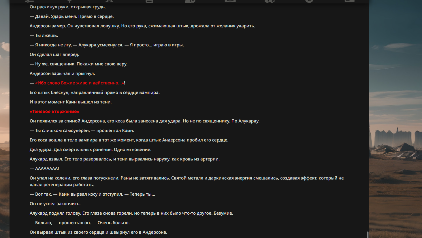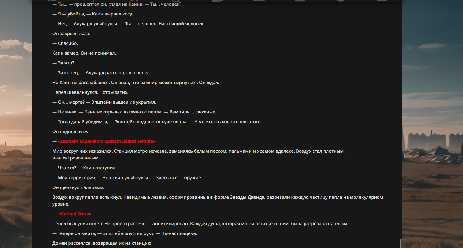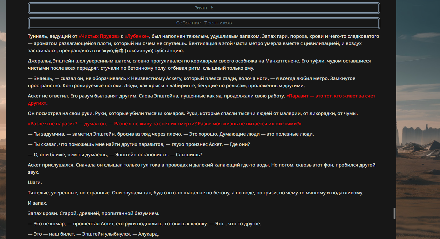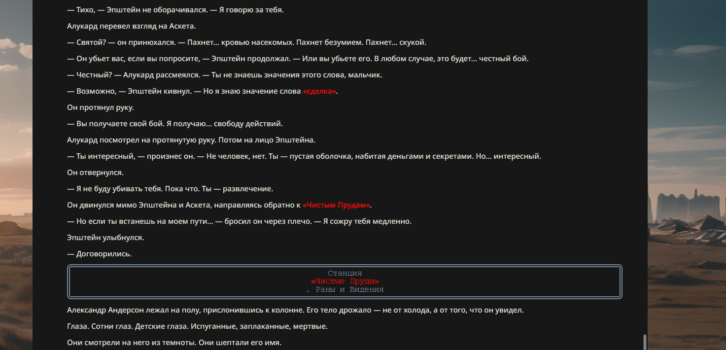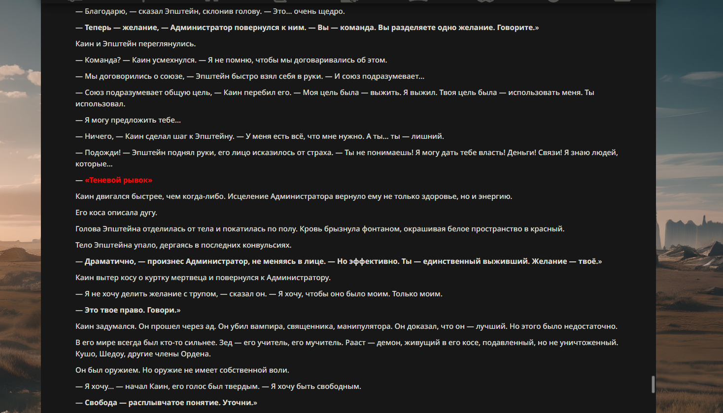 >>330710317 <character name="Громовой Архистарец"> Старый боевой маг. Когда-то он был архимагом великих орденов, но десятилетия войн и магических катастроф сделали его тем, чем он является сейчас — живым оружием, соединяющим древнюю магию и грубую физическую силу. Его тело выглядит как тело древнего титана: массивные плечи, каменные мышцы, руки, способные разорвать сталь. Но под седой бородой и усталыми глазами скрывается разум, прошедший сотни битв, осад, магических дуэлей и катастроф. Он не раз переживал собственную смерть на поле боя. Главная особенность Архистарца — крайне малый запас маны. Он не способен долго колдовать, как обычные маги. Но те немногие заклинания, которые он использует, обладают чудовищной силой, потому что он сжимает ману до предела, превращая её в концентрированные взрывы энергии. Желание: найти достойного ученика, который переживёт его последнюю битву. Способности "Сжатый Гром" Архистарец концентрирует почти весь свой запас маны в ладони и выпускает её в виде сверхплотной сферы молнии. Взрыв эквивалентен удару природной молнии, но направлен и контролируем. "Мускулы Титана" Многолетние тренировки и магическое укрепление тела сделали его физически невероятно сильным и крепким "Магическая Компрессия" Его уникальная техника. Он способен сжимать ману до экстремальной плотности, превращая даже маленький запас энергии в разрушительные заклинания. "Шаг Грозы" Короткий магический рывок на расстояние до нескольких метров. Мгновенный выброс энергии, который толкает его тело вперёд с огромной скоростью. "Боевой Архимаг" Он прошёл сотни войн и понимает бой на инстинктивном уровне. Его опыт позволяет: читать стиль противника находить слабости предугадывать заклинания экономить энергию до идеального момента удара. "Старая Буря" Когда его тело получает серьёзные ранения, в нём просыпается древний инстинкт выживания. Его мышцы и нервная система работают на пределе, а остатки маны начинают спонтанно вырываться молниями вокруг него. В этом состоянии он становится значительно быстрее и агрессивнее, мана восстанавливается быстрее "Громовая Мудрость" Десятилетия опыта дают ему способность мгновенно анализировать ситуацию. Он может: определить тип магии противника понять природу существа предсказать исход сражения найти единственный шанс на победу даже против значительно более сильного врага. "Последний Удар Бури" Крайняя техника. Архистарец выпускает всю оставшуюся ману разом, превращая её в гигантский электрический разряд вокруг себя. После применения он практически полностью истощён, но удар способен уничтожить даже могущественных противников. <character name>