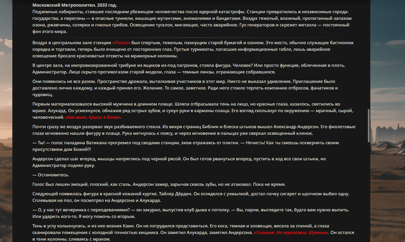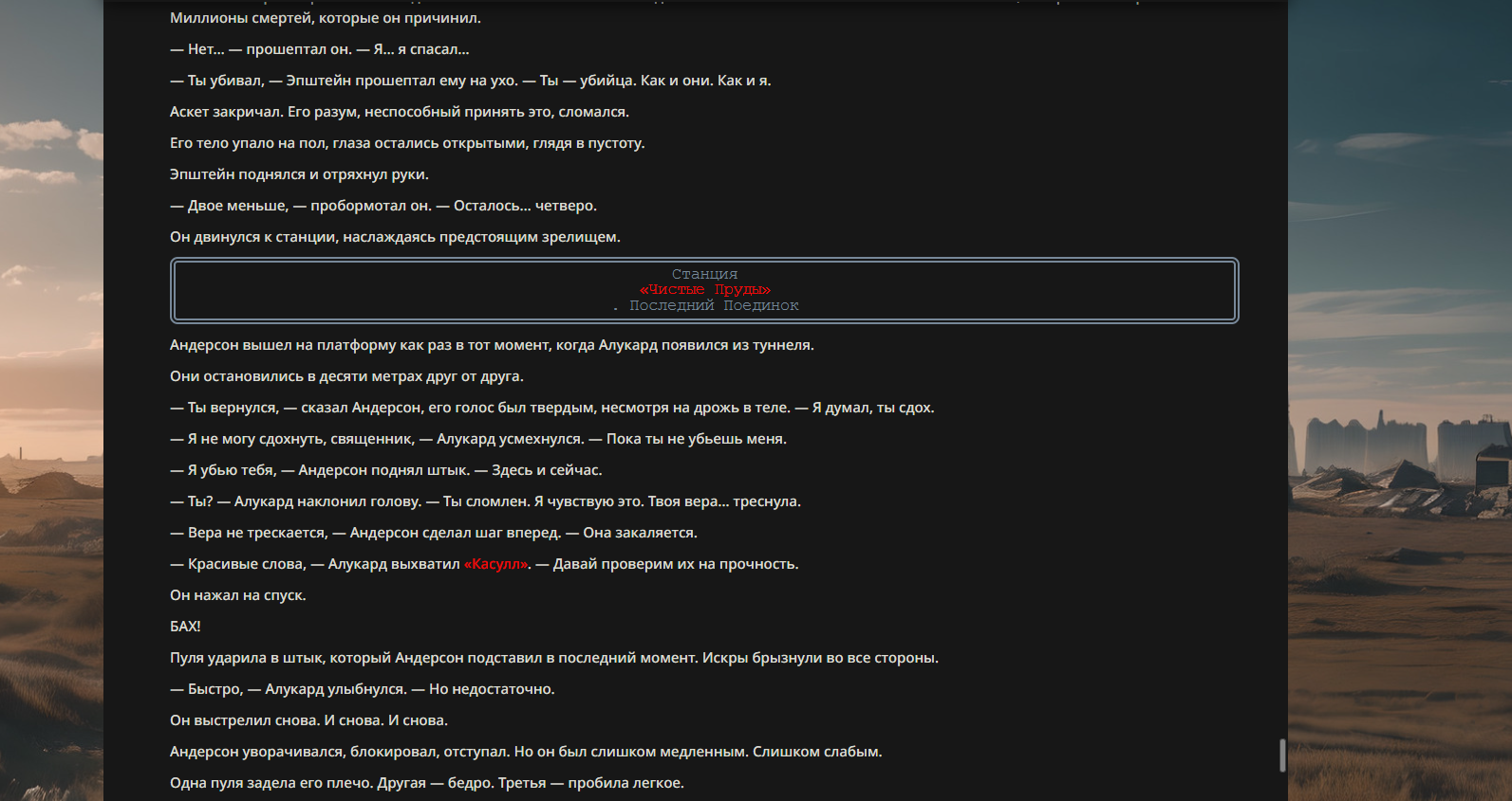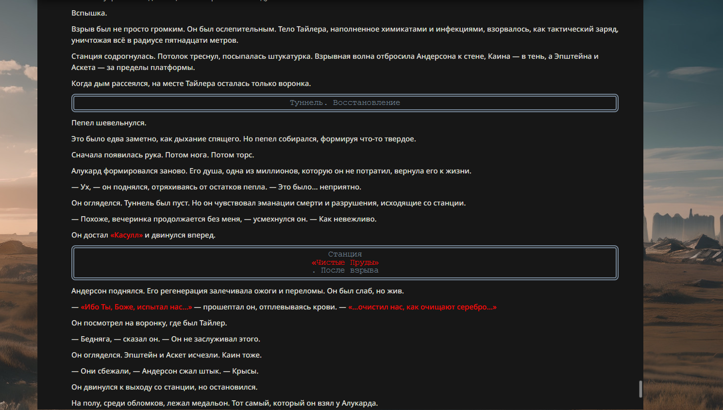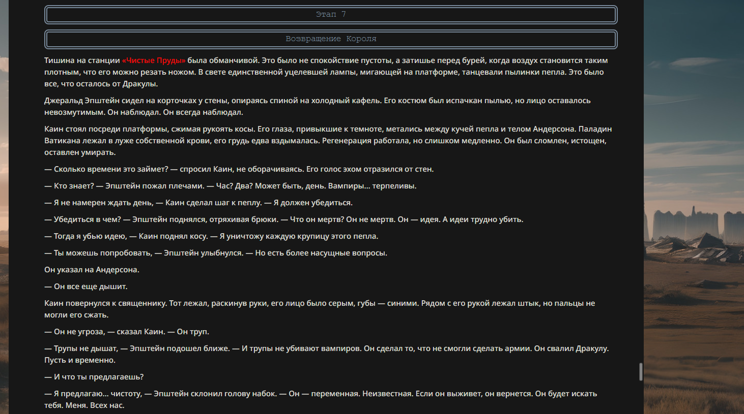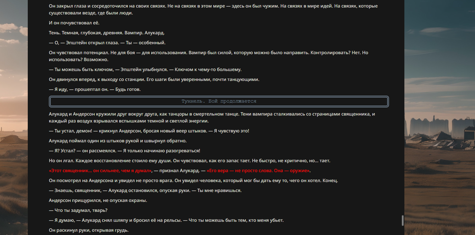 >>330710317 <character name="Громовой Архистарец"> Старый боевой маг. Когда-то он был архимагом великих орденов, но десятилетия войн и магических катастроф сделали его тем, чем он является сейчас — живым оружием, соединяющим древнюю магию и грубую физическую силу. Его тело выглядит как тело древнего титана: массивные плечи, каменные мышцы, руки, способные разорвать сталь. Но под седой бородой и усталыми глазами скрывается разум, прошедший сотни битв, осад, магических дуэлей и катастроф. Он не раз переживал собственную смерть на поле боя. Главная особенность Архистарца — крайне малый запас маны. Он не способен долго колдовать, как обычные маги. Но те немногие заклинания, которые он использует, обладают чудовищной силой, потому что он сжимает ману до предела, превращая её в концентрированные взрывы энергии. Желание: найти достойного ученика, который переживёт его последнюю битву. Способности "Сжатый Гром" Архистарец концентрирует почти весь свой запас маны в ладони и выпускает её в виде сверхплотной сферы молнии. Взрыв эквивалентен удару природной молнии, но направлен и контролируем. "Мускулы Титана" Многолетние тренировки и магическое укрепление тела сделали его физически невероятно сильным и крепким "Магическая Компрессия" Его уникальная техника. Он способен сжимать ману до экстремальной плотности, превращая даже маленький запас энергии в разрушительные заклинания. "Шаг Грозы" Короткий магический рывок на расстояние до нескольких метров. Мгновенный выброс энергии, который толкает его тело вперёд с огромной скоростью. "Боевой Архимаг" Он прошёл сотни войн и понимает бой на инстинктивном уровне. Его опыт позволяет: читать стиль противника находить слабости предугадывать заклинания экономить энергию до идеального момента удара. "Старая Буря" Когда его тело получает серьёзные ранения, в нём просыпается древний инстинкт выживания. Его мышцы и нервная система работают на пределе, а остатки маны начинают спонтанно вырываться молниями вокруг него. В этом состоянии он становится значительно быстрее и агрессивнее, мана восстанавливается быстрее "Громовая Мудрость" Десятилетия опыта дают ему способность мгновенно анализировать ситуацию. Он может: определить тип магии противника понять природу существа предсказать исход сражения найти единственный шанс на победу даже против значительно более сильного врага. "Последний Удар Бури" Крайняя техника. Архистарец выпускает всю оставшуюся ману разом, превращая её в гигантский электрический разряд вокруг себя. После применения он практически полностью истощён, но удар способен уничтожить даже могущественных противников. <character name>
