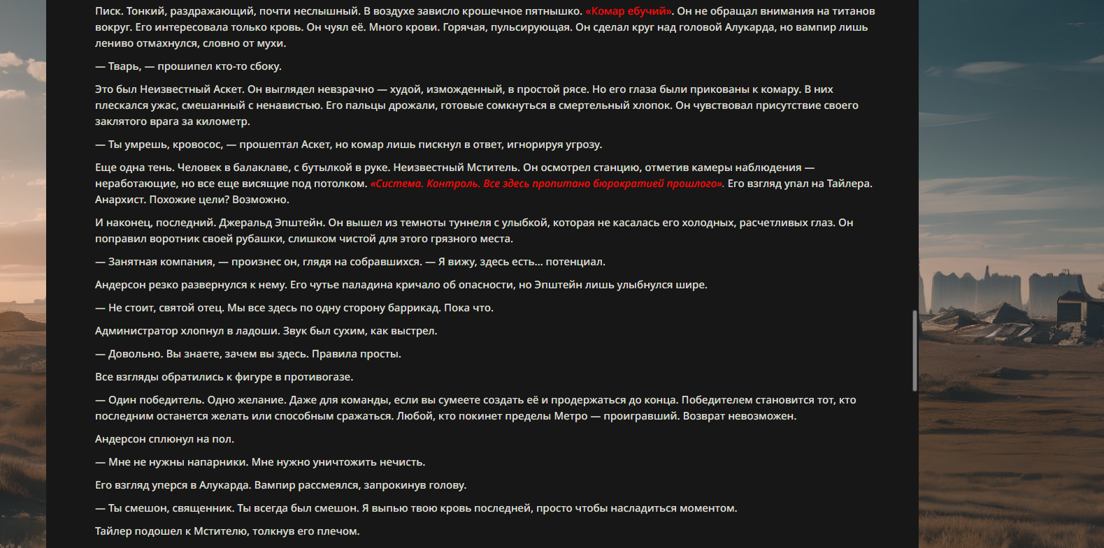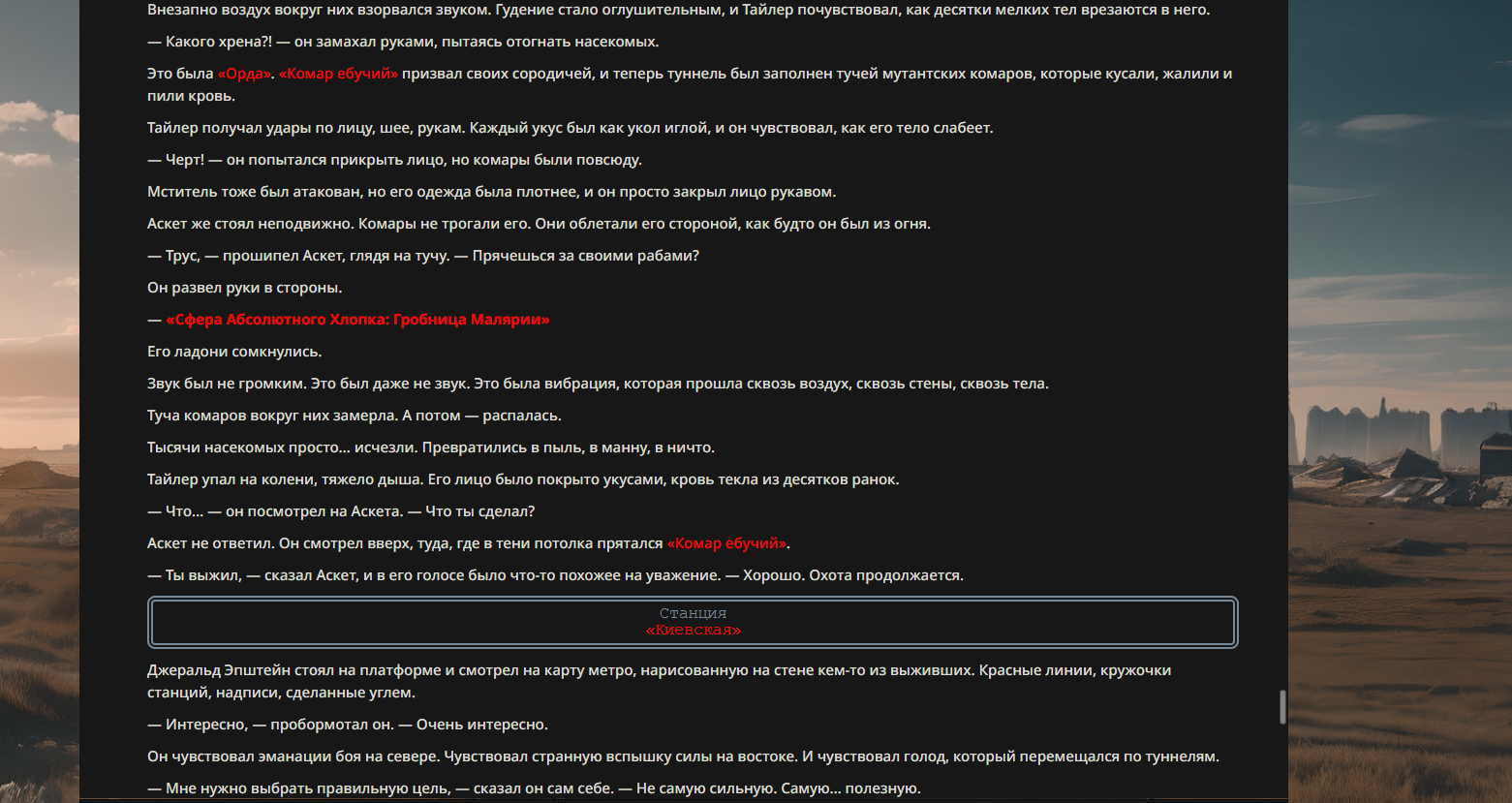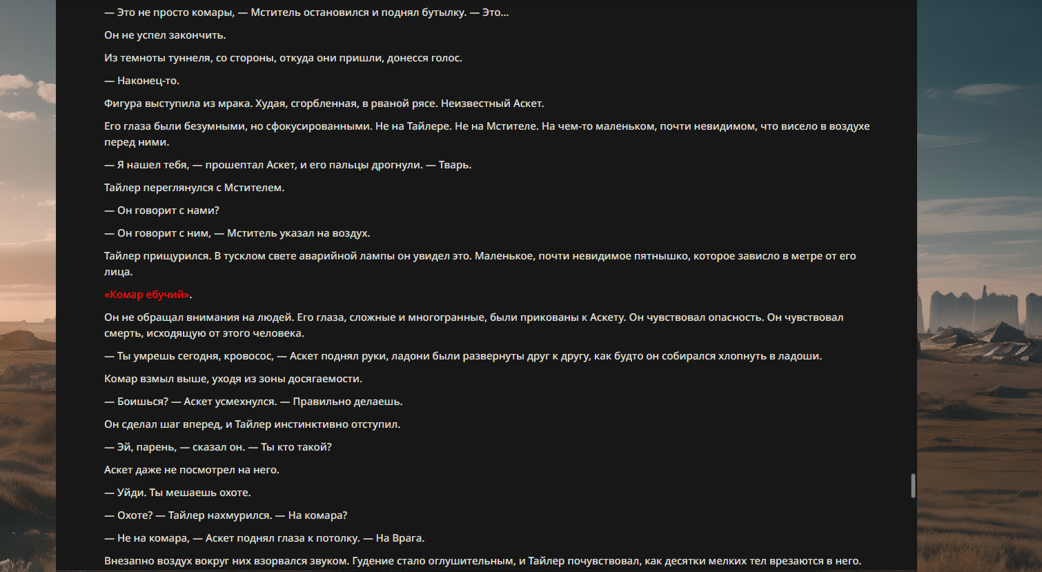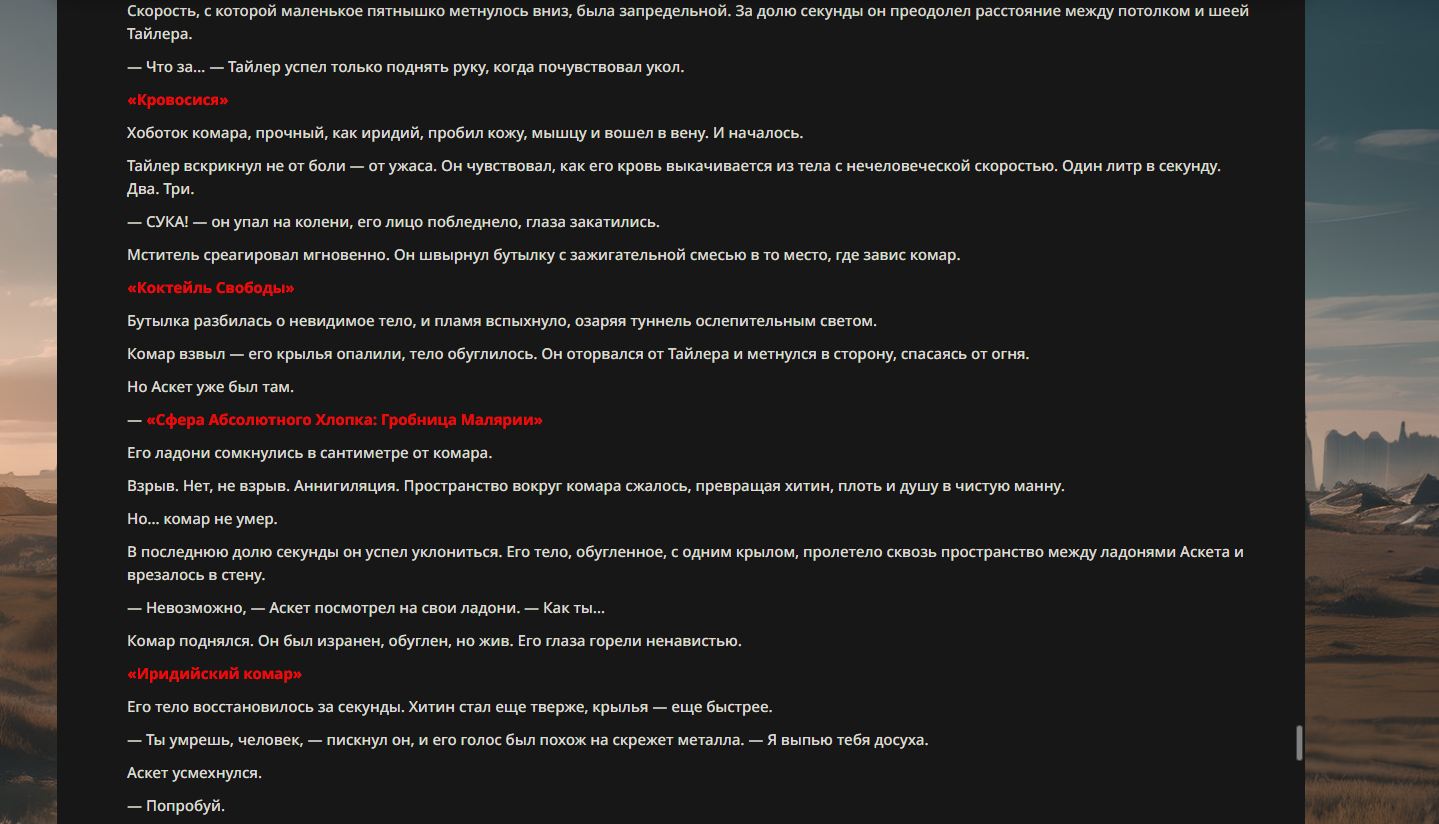 Орда: "Комар ебучий" обладает способностью контролировать других комаров. Он излучает особые ультразвуковые сигналы и химические феромоны, которые заставляют ближайших кровососов беспрекословно ему подчиняться. Может направлять целые тучи комаров на врага — чтобы отвлечь, замедлить или просто морально разъебать. Если надо, он сливает с ними часть собственной ярости, превращая их в бешеных кусачих уродов, готовых сдохнуть ради атаки.