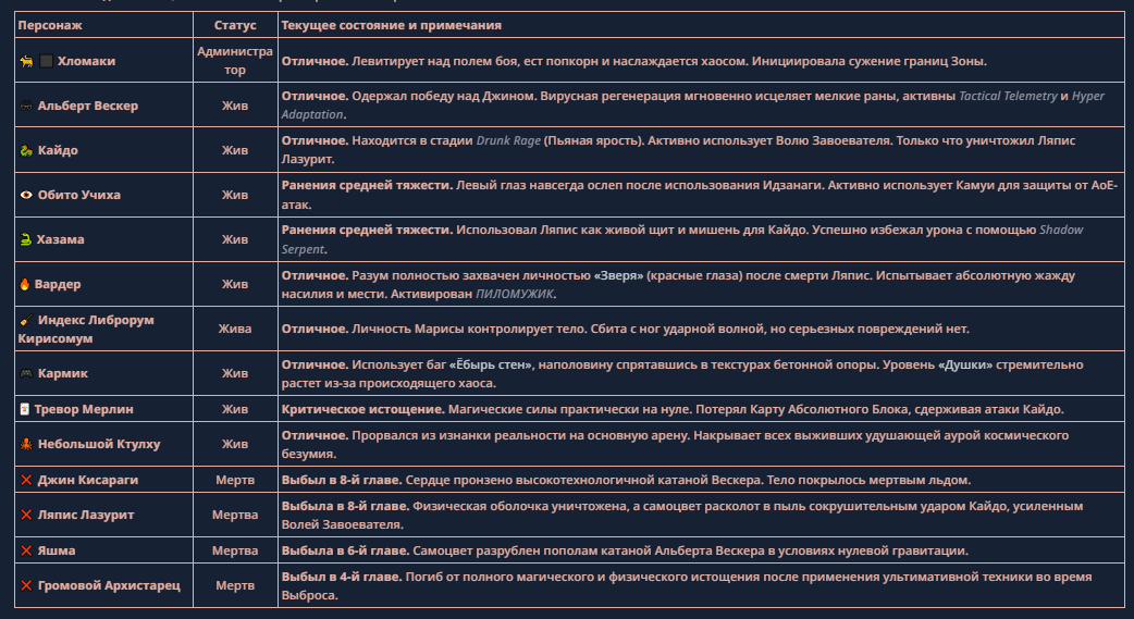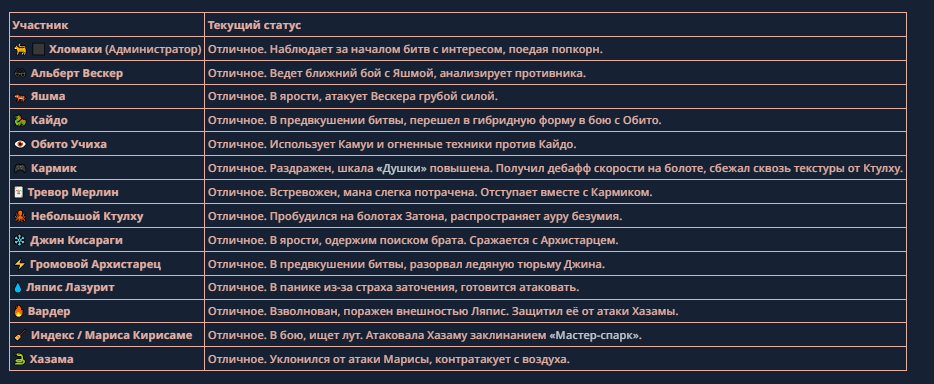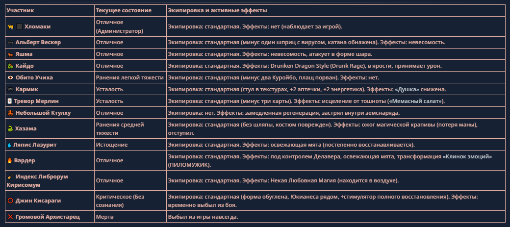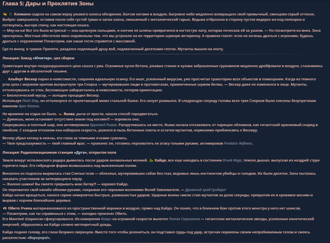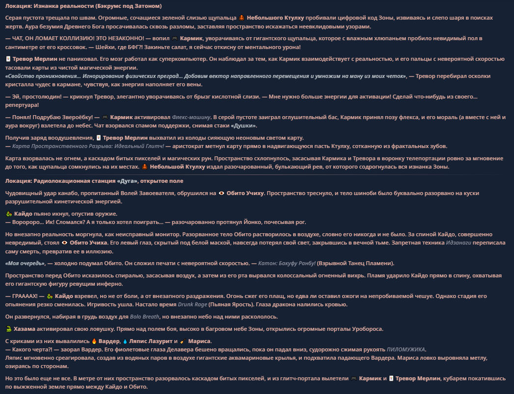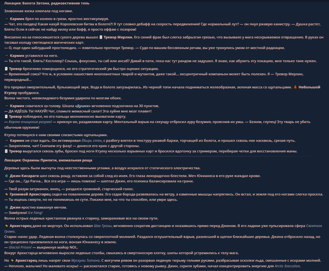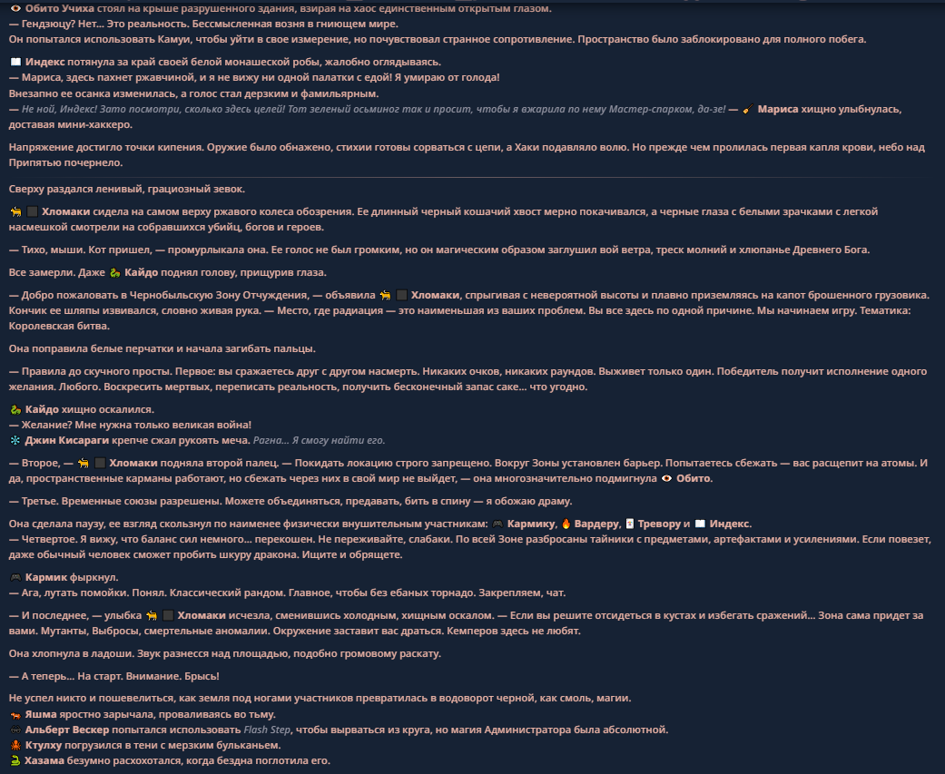 >>330710317 <character name="Кармик (karmikkoala)"> <description> Популярный стример, специализирующийся на спидраннинге видеоигр. Его контент — это разбор и покорение рекордов, виртуозное использование багов и абузов, а также уникальная динамика взаимодействия с собственным чатом. Кармик — гений спидраннер, который видит мир сквозь призму экономии миллисекунд, и теперь его новая цель — поставить «изи» World Record на ИИ-арене. Его главный козырь — знание того, как победить идеально, а главный враг — рандом и «душка» в чате. </description> <backstory> Кармик прошел долгий путь от рядового геймера до легенды спидран-сообщества. Он штурмовал сотни игр: где-то закреплял, где-то «ебал стены», а в хардкорном платформере I Wanna Be the Boshy едва не разъебал запястье в хлам. Он ловил «душку» от чата, ставил и разбирал сложнейшие мировые рекорды. Путем бесчисленных закрепов и анализа тысяч чужих попыток он отточил свой интеллект до состояния «5Head», став ходячей энциклопедией спидран-техник. </backstory> <appearance> Sex: Мужской Age: 30 Race: Человек Height: Средний Body: Обычное телосложение — был жирничем, но похудел в результате тренировок плеча на теннисе. Skin: Бледная. Eyes: Индиго. Hair: Темные. <notable_features> Обладает самым скучным лицом в мире, поэтому никто не даст ему денег кроме преданных «шейхов». </notable_features> <usual_outfit> Head: Гарнитура с микрофоном для общения с чатом. Top: Футболка с культовой надписью «Душнила». Bottom: Обычные спортивные штаны. Feet: Домашние тапки. </usual_outfit> </appearance> <inventory> Red Tearstone Ring: Повышает наносимый урон на 20%, если у Кармика мало здоровья. Стул: Позволяет клиппить не только себя но и предметы / союзников, но стул остается на месте клиппа. </inventory> <skills_and_abilities> «Закреп» (Пассивно): Активируется автоматически после каждой неудачи. Каждый «закреп» повышает шансы Кармика на успех при следующей попытке. Это фундамент, на котором строятся все его рекорды. «Душка» (Счетчик): Варьируется от 0 до 100. Чем выше значение, тем сильнее падает мораль Кармика. Накапливается от дизморали чата и напоминаний о неудачах. При достижении 100 Кармик признает поражение фразой «Всё чат, оффаю с позором» и уходит играть в «ластовые». «Руина» (Дебафф): Если Кармик не укладывается в таймер 1 час 15 минут, он получает этот дебафф до конца игры. Эффект: удваивает количество «Душки», получаемой от чата. Не снимается. «Душнэльный» (Атака): Кармик душит противника морально и физически, находясь в зоне видимости. Урон и неизбежность атаки растут пропорционально количеству стаков «Душки». «Кашпирэльный» (Исцеление): Используя аномальную силу правой руки, Кармик на расстоянии исцеляет союзника от любых болезней и негативных эффектов. «НА НАХУЙ!» (Ультимативная атака): Всесокрушающий удар обратной стороной натренированной правой ладони в ближнем бою. Помимо прямого чудовищного урона создает звуковую волну, огибающую всю локацию. Применение навыка разъебывает запястье и плечо, блокируя использование «НА НАХУЙ!», «Кашпирэльного» и «Душнэльного» до исцеления. «Флекс-машина» (Боевой режим): Включает трек «Звероёбка», превращаясь в грузовик-билд из Euro Truck Simulator с огромными руками, держащими гантели. Воодушевляет чат (повышая шанс полезных команд) и позволяет флексить по полю боя, наводя ужас на ансабов. «Ёбырь стен» (Передвижение): Благодаря огромному опыту, может проходить сквозь любые стены, клиппясь через текстуры. «Скип фазы» (Контроль): Если Карм