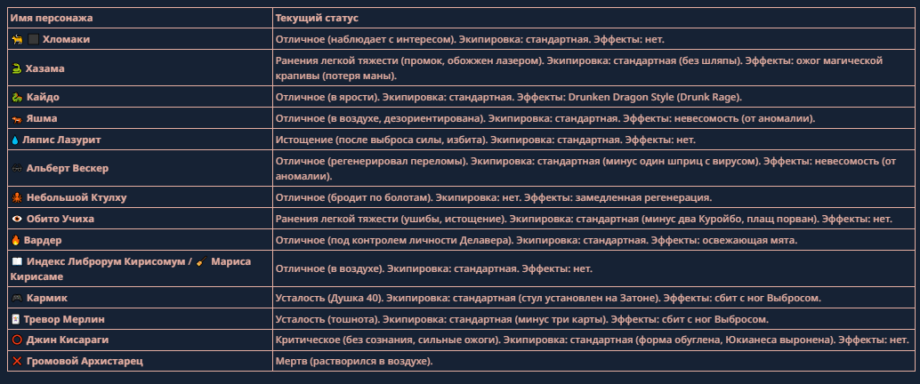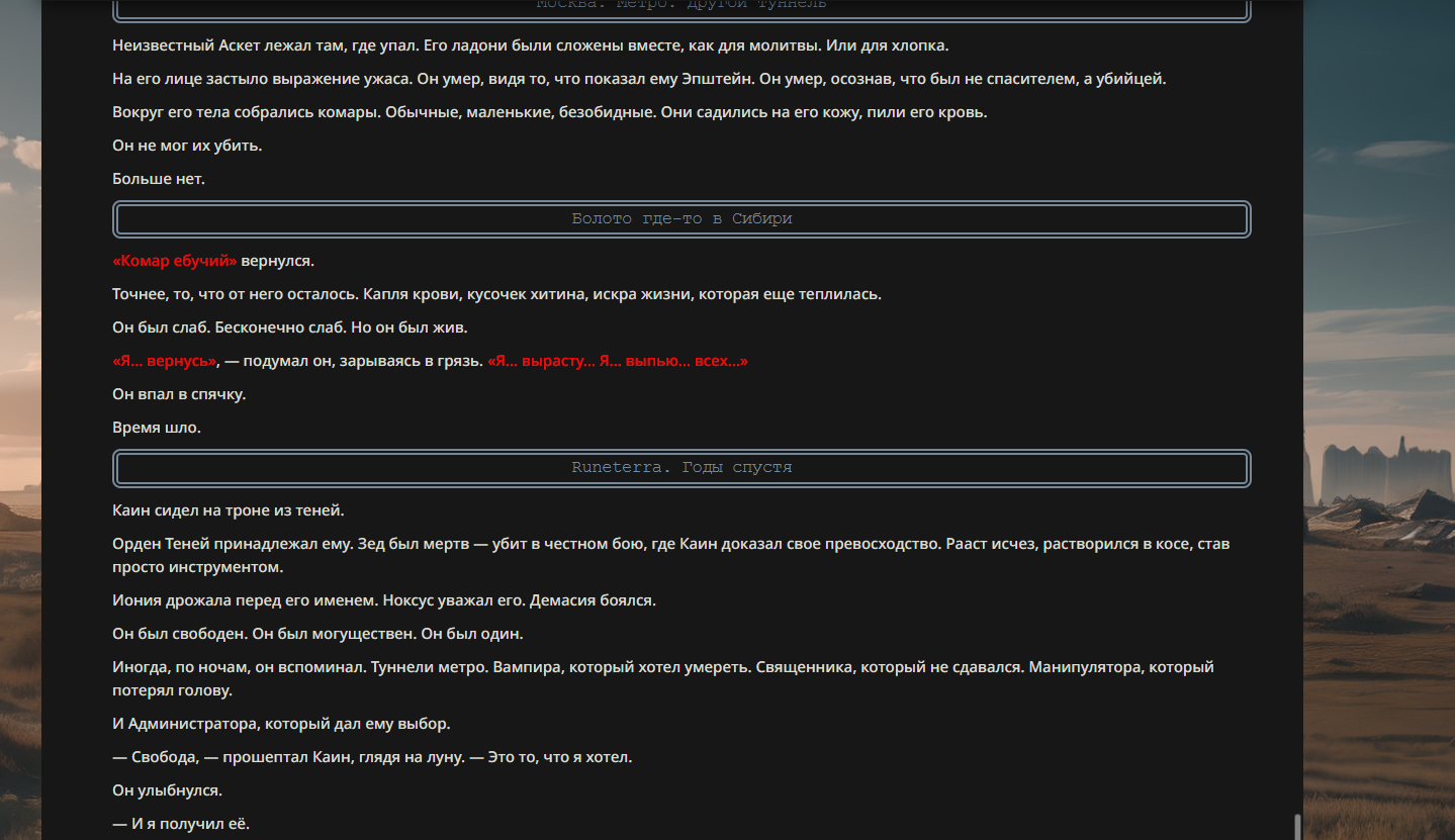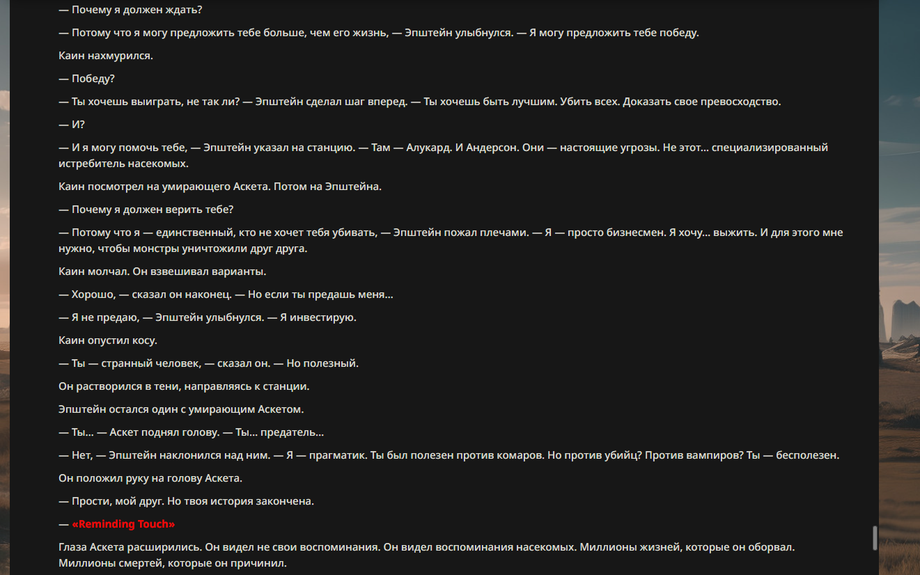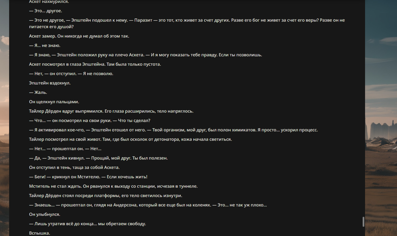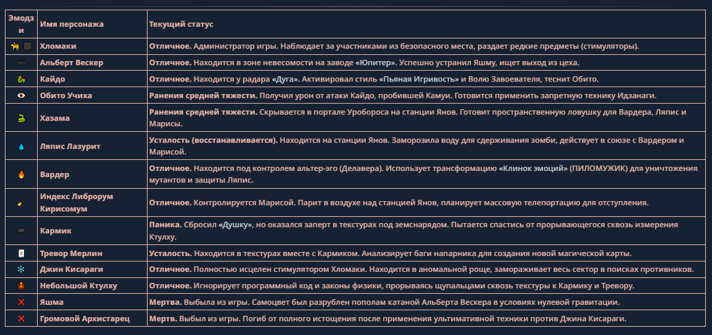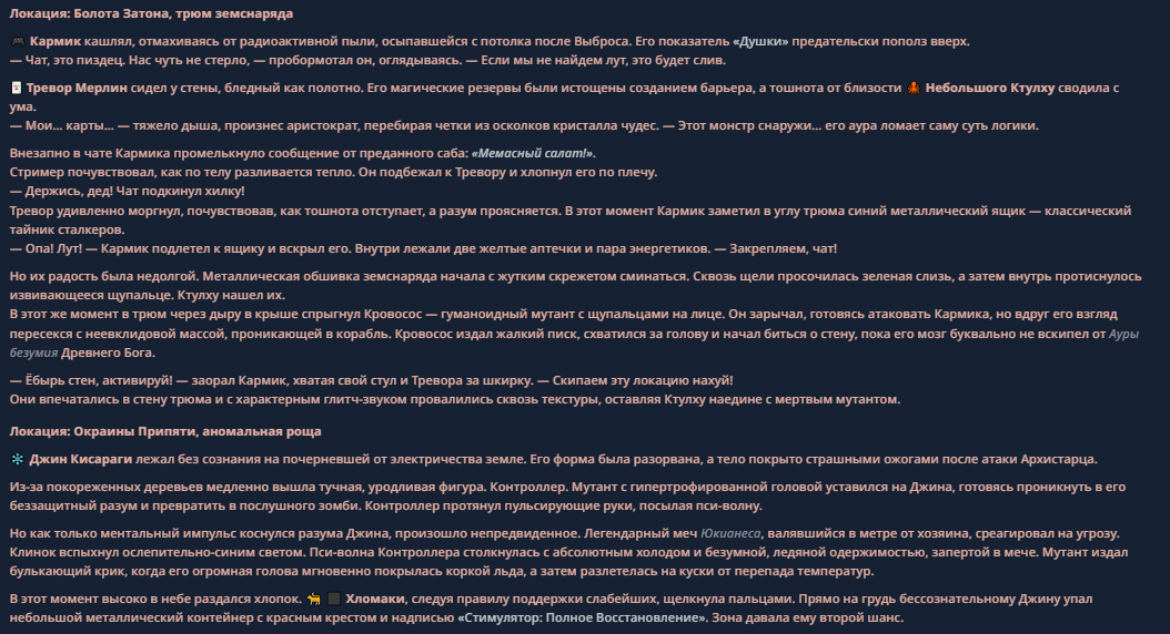 >>330710317 <character name="Кармик (karmikkoala)"> <description> Популярный стример, специализирующийся на спидраннинге видеоигр. Его контент — это разбор и покорение рекордов, виртуозное использование багов и абузов, а также уникальная динамика взаимодействия с собственным чатом. Кармик — гений спидраннер, который видит мир сквозь призму экономии миллисекунд, и теперь его новая цель — поставить «изи» World Record на ИИ-арене. Его главный козырь — знание того, как победить идеально, а главный враг — рандом и «душка» в чате. </description> <backstory> Кармик прошел долгий путь от рядового геймера до легенды спидран-сообщества. Он штурмовал сотни игр: где-то закреплял, где-то «ебал стены», а в хардкорном платформере I Wanna Be the Boshy едва не разъебал запястье в хлам. Он ловил «душку» от чата, ставил и разбирал сложнейшие мировые рекорды. Путем бесчисленных закрепов и анализа тысяч чужих попыток он отточил свой интеллект до состояния «5Head», став ходячей энциклопедией спидран-техник. </backstory> <appearance> Sex: Мужской Age: 30 Race: Человек Height: Средний Body: Обычное телосложение — был жирничем, но похудел в результате тренировок плеча на теннисе. Skin: Бледная. Eyes: Индиго. Hair: Темные. <notable_features> Обладает самым скучным лицом в мире, поэтому никто не даст ему денег кроме преданных «шейхов». </notable_features> <usual_outfit> Head: Гарнитура с микрофоном для общения с чатом. Top: Футболка с культовой надписью «Душнила». Bottom: Обычные спортивные штаны. Feet: Домашние тапки. </usual_outfit> </appearance> <inventory> Red Tearstone Ring: Повышает наносимый урон на 20%, если у Кармика мало здоровья. Стул: Позволяет клиппить не только себя но и предметы / союзников, но стул остается на месте клиппа. </inventory> <skills_and_abilities> «Закреп» (Пассивно): Активируется автоматически после каждой неудачи. Каждый «закреп» повышает шансы Кармика на успех при следующей попытке. Это фундамент, на котором строятся все его рекорды. «Душка» (Счетчик): Варьируется от 0 до 100. Чем выше значение, тем сильнее падает мораль Кармика. Накапливается от дизморали чата и напоминаний о неудачах. При достижении 100 Кармик признает поражение фразой «Всё чат, оффаю с позором» и уходит играть в «ластовые». «Руина» (Дебафф): Если Кармик не укладывается в таймер 1 час 15 минут, он получает этот дебафф до конца игры. Эффект: удваивает количество «Душки», получаемой от чата. Не снимается. «Душнэльный» (Атака): Кармик душит противника морально и физически, находясь в зоне видимости. Урон и неизбежность атаки растут пропорционально количеству стаков «Душки». «Кашпирэльный» (Исцеление): Используя аномальную силу правой руки, Кармик на расстоянии исцеляет союзника от любых болезней и негативных эффектов. «НА НАХУЙ!» (Ультимативная атака): Всесокрушающий удар обратной стороной натренированной правой ладони в ближнем бою. Помимо прямого чудовищного урона создает звуковую волну, огибающую всю локацию. Применение навыка разъебывает запястье и плечо, блокируя использование «НА НАХУЙ!», «Кашпирэльного» и «Душнэльного» до исцеления. «Флекс-машина» (Боевой режим): Включает трек «Звероёбка», превращаясь в грузовик-билд из Euro Truck Simulator с огромными руками, держащими гантели. Воодушевляет чат (повышая шанс полезных команд) и позволяет флексить по полю боя, наводя ужас на ансабов. «Ёбырь стен» (Передвижение): Благодаря огромному опыту, может проходить сквозь любые стены, клиппясь через текстуры. «Скип фазы» (Контроль): Если Карм