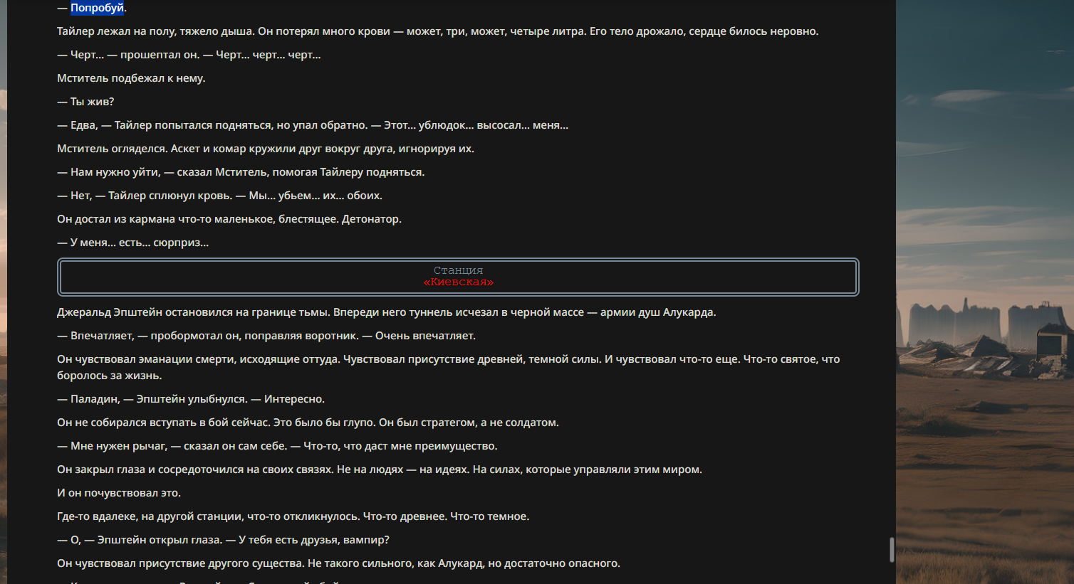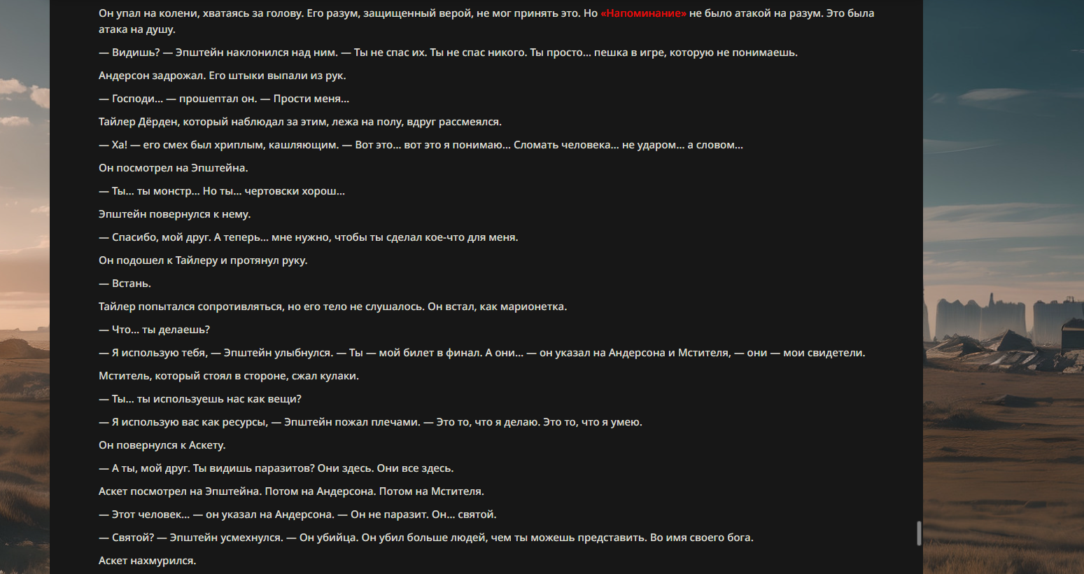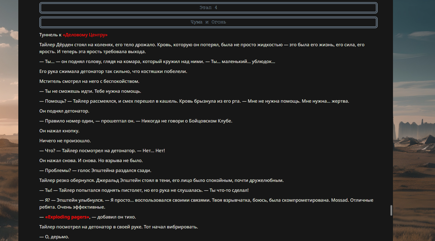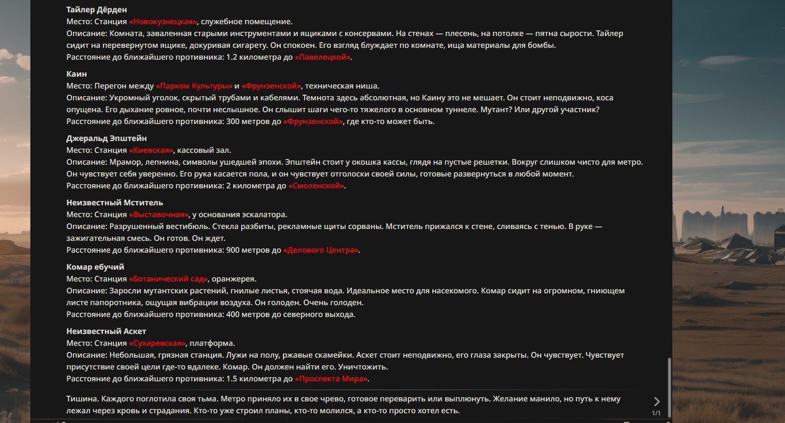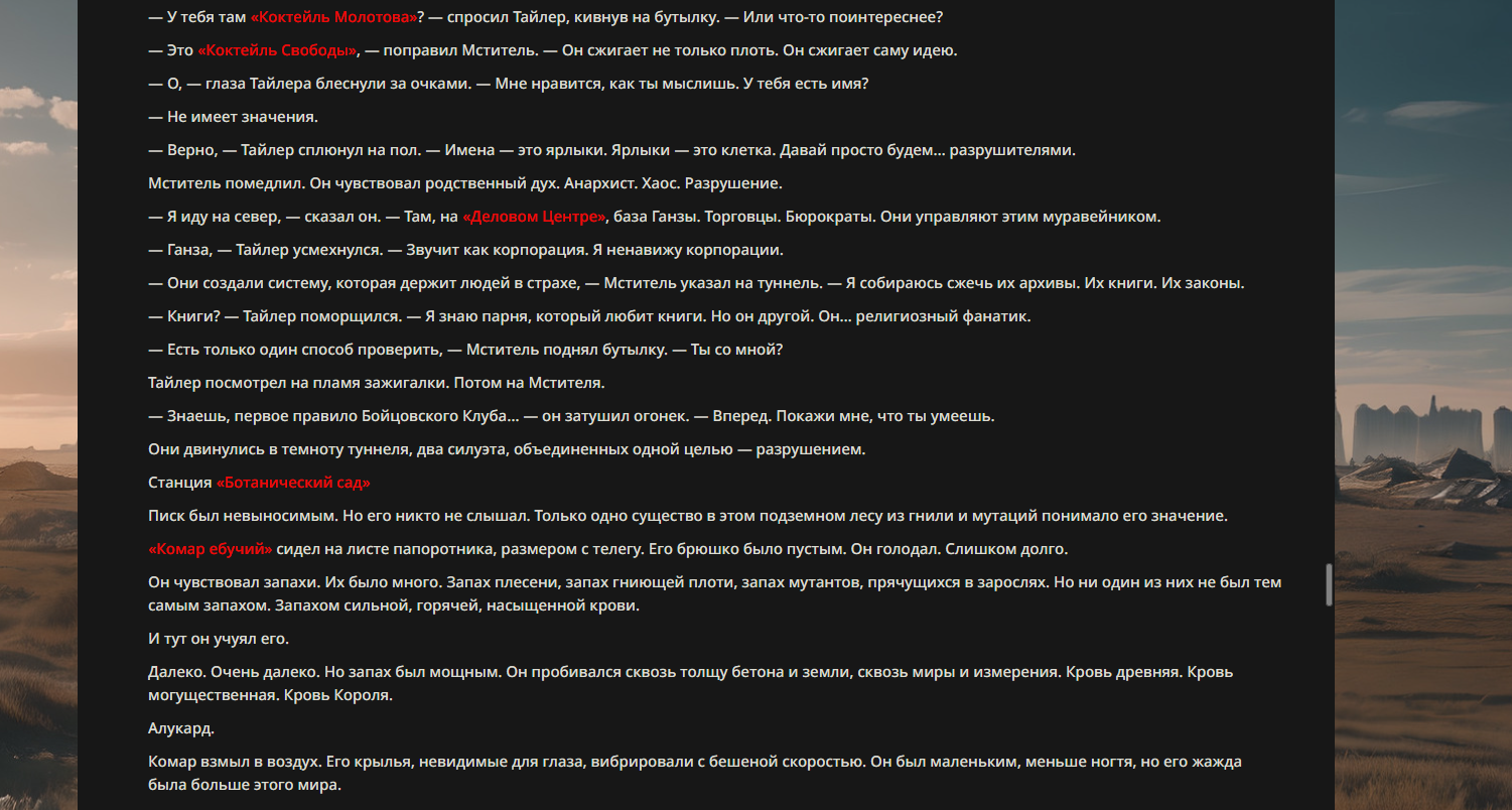 >>330710317 <character name="Кармик (karmikkoala)"> <description> Популярный стример, специализирующийся на спидраннинге видеоигр. Его контент — это разбор и покорение рекордов, виртуозное использование багов и абузов, а также уникальная динамика взаимодействия с собственным чатом. Кармик — гений спидраннер, который видит мир сквозь призму экономии миллисекунд, и теперь его новая цель — поставить «изи» World Record на ИИ-арене. Его главный козырь — знание того, как победить идеально, а главный враг — рандом и «душка» в чате. </description> <backstory> Кармик прошел долгий путь от рядового геймера до легенды спидран-сообщества. Он штурмовал сотни игр: где-то закреплял, где-то «ебал стены», а в хардкорном платформере I Wanna Be the Boshy едва не разъебал запястье в хлам. Он ловил «душку» от чата, ставил и разбирал сложнейшие мировые рекорды. Путем бесчисленных закрепов и анализа тысяч чужих попыток он отточил свой интеллект до состояния «5Head», став ходячей энциклопедией спидран-техник. </backstory> <appearance> Sex: Мужской Age: 30 Race: Человек Height: Средний Body: Обычное телосложение — был жирничем, но похудел в результате тренировок плеча на теннисе. Skin: Бледная. Eyes: Индиго. Hair: Темные. <notable_features> Обладает самым скучным лицом в мире, поэтому никто не даст ему денег кроме преданных «шейхов». </notable_features> <usual_outfit> Head: Гарнитура с микрофоном для общения с чатом. Top: Футболка с культовой надписью «Душнила». Bottom: Обычные спортивные штаны. Feet: Домашние тапки. </usual_outfit> </appearance> <inventory> Red Tearstone Ring: Повышает наносимый урон на 20%, если у Кармика мало здоровья. Стул: Позволяет клиппить не только себя но и предметы / союзников, но стул остается на месте клиппа. </inventory> <skills_and_abilities> «Закреп» (Пассивно): Активируется автоматически после каждой неудачи. Каждый «закреп» повышает шансы Кармика на успех при следующей попытке. Это фундамент, на котором строятся все его рекорды. «Душка» (Счетчик): Варьируется от 0 до 100. Чем выше значение, тем сильнее падает мораль Кармика. Накапливается от дизморали чата и напоминаний о неудачах. При достижении 100 Кармик признает поражение фразой «Всё чат, оффаю с позором» и уходит играть в «ластовые». «Руина» (Дебафф): Если Кармик не укладывается в таймер 1 час 15 минут, он получает этот дебафф до конца игры. Эффект: удваивает количество «Душки», получаемой от чата. Не снимается. «Душнэльный» (Атака): Кармик душит противника морально и физически, находясь в зоне видимости. Урон и неизбежность атаки растут пропорционально количеству стаков «Душки». «Кашпирэльный» (Исцеление): Используя аномальную силу правой руки, Кармик на расстоянии исцеляет союзника от любых болезней и негативных эффектов. «НА НАХУЙ!» (Ультимативная атака): Всесокрушающий удар обратной стороной натренированной правой ладони в ближнем бою. Помимо прямого чудовищного урона создает звуковую волну, огибающую всю локацию. Применение навыка разъебывает запястье и плечо, блокируя использование «НА НАХУЙ!», «Кашпирэльного» и «Душнэльного» до исцеления. «Флекс-машина» (Боевой режим): Включает трек «Звероёбка», превращаясь в грузовик-билд из Euro Truck Simulator с огромными руками, держащими гантели. Воодушевляет чат (повышая шанс полезных команд) и позволяет флексить по полю боя, наводя ужас на ансабов. «Ёбырь стен» (Передвижение): Благодаря огромному опыту, может проходить сквозь любые стены, клиппясь через текстуры. «Скип фазы» (Контроль): Если Карм