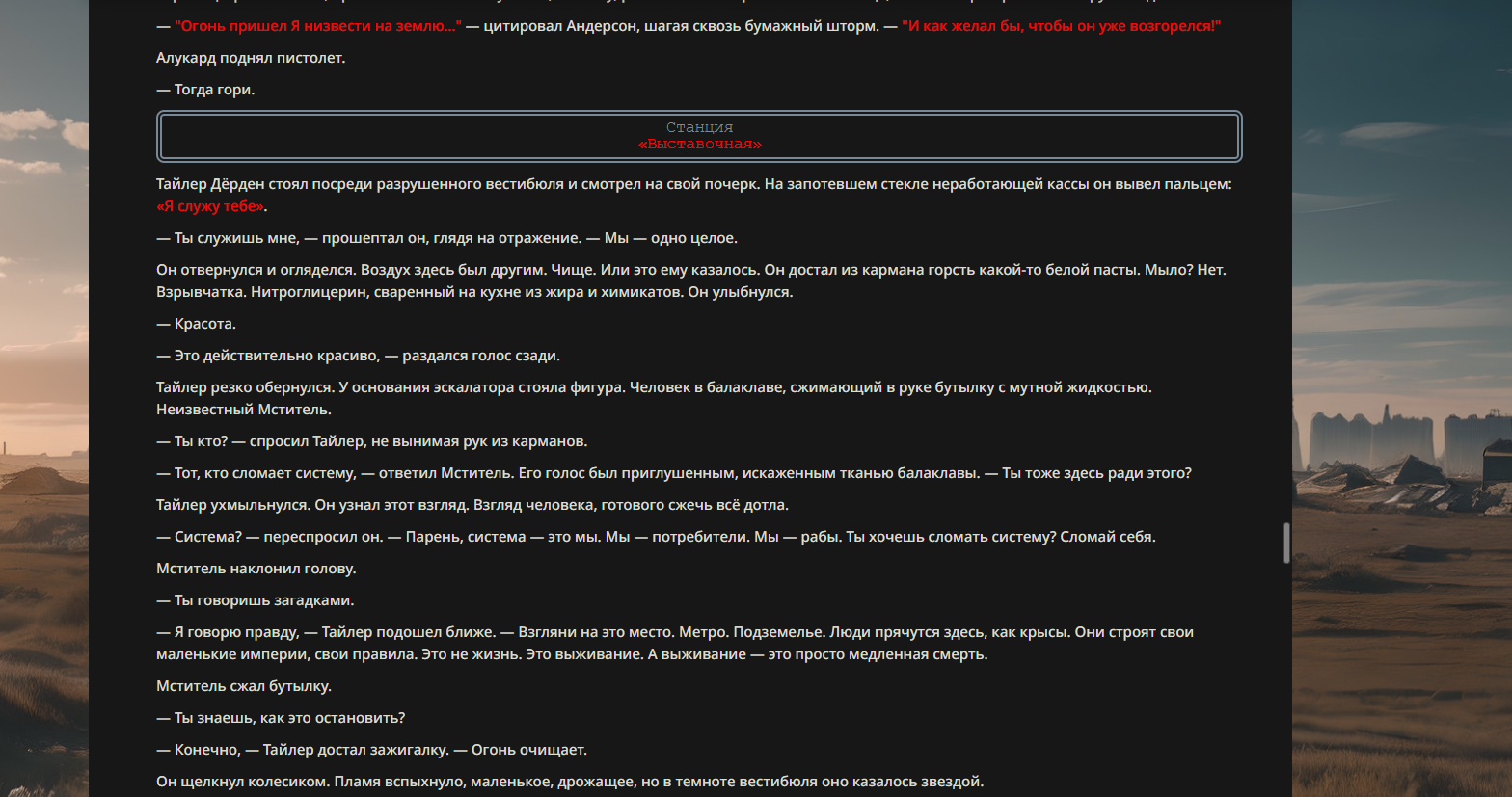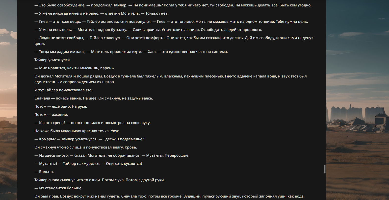 Тайлер проповедует отказ от потребительства, корпоративной культуры и социальных условностей. Вместе с рассказчиком он создаёт подпольную организацию Бойцовский Клуб, где мужчины дерутся, чтобы почувствовать себя живыми и вернуть контроль над своей жизнью.