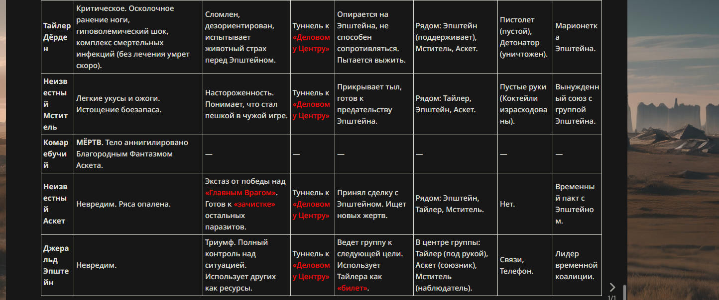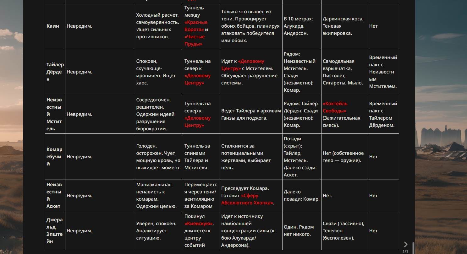 >>330699953 Личные навыки: Харизма Корпоративного Лидера (A): Манипуляция массами через лозунги и брендинг. Заставляет окружающих верить, что их рабство — это «карьерный рост». Отрицание Хаоса (Anti-Tyler): Уникальный навык, подавляющий любые «инстинктивные» или «дикие» порывы. В радиусе действия персонажа любые попытки устроить революцию или драку ради драки кажутся глупыми и невыгодными. Золотое Правило (Инвестиции) (EX): Персонаж никогда не испытывает нехватки ресурсов. Любой урон, нанесенный ему, можно «выкупить», восстановив форму за счет маны налогоплательщиков.
