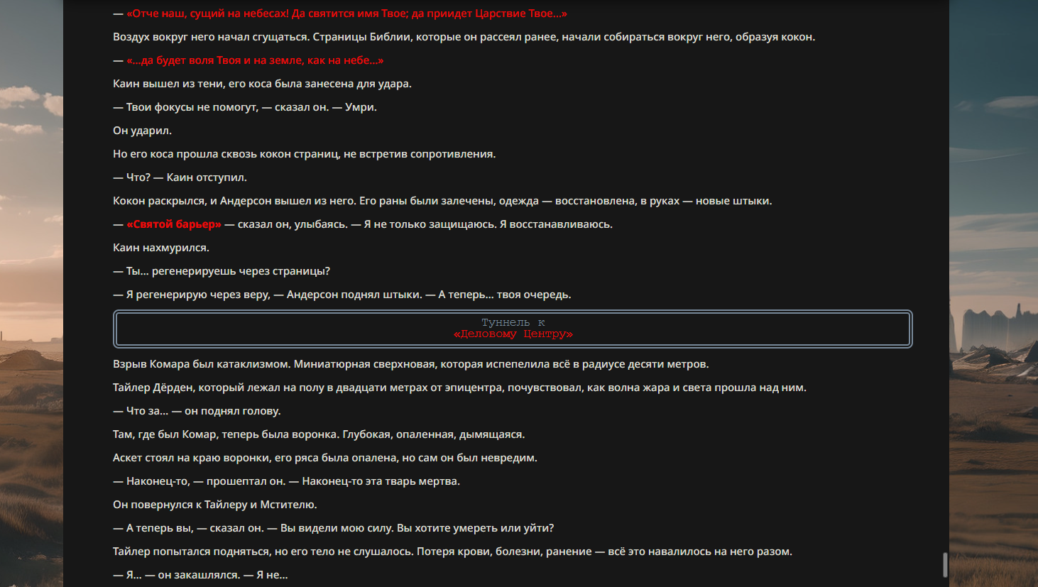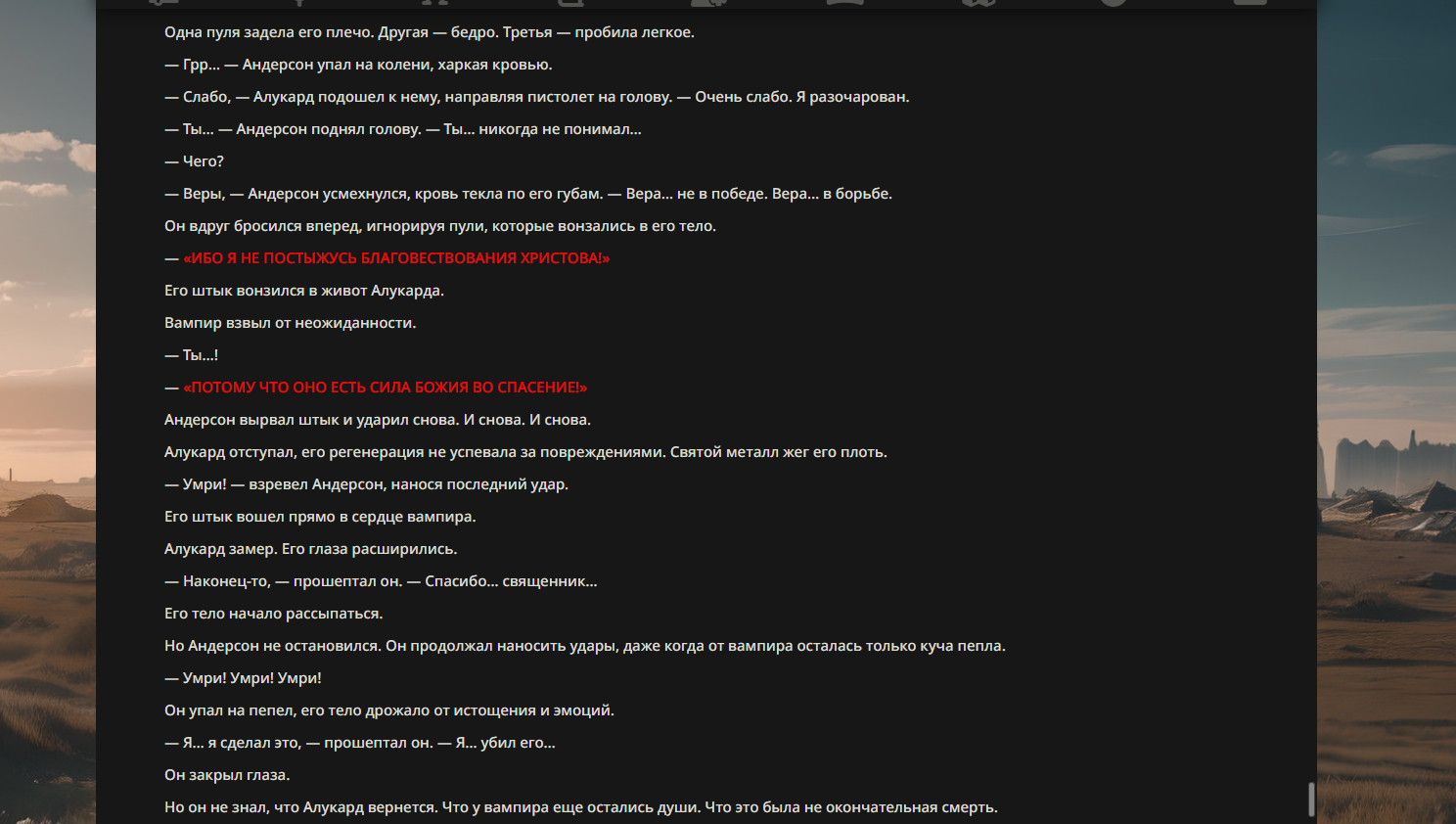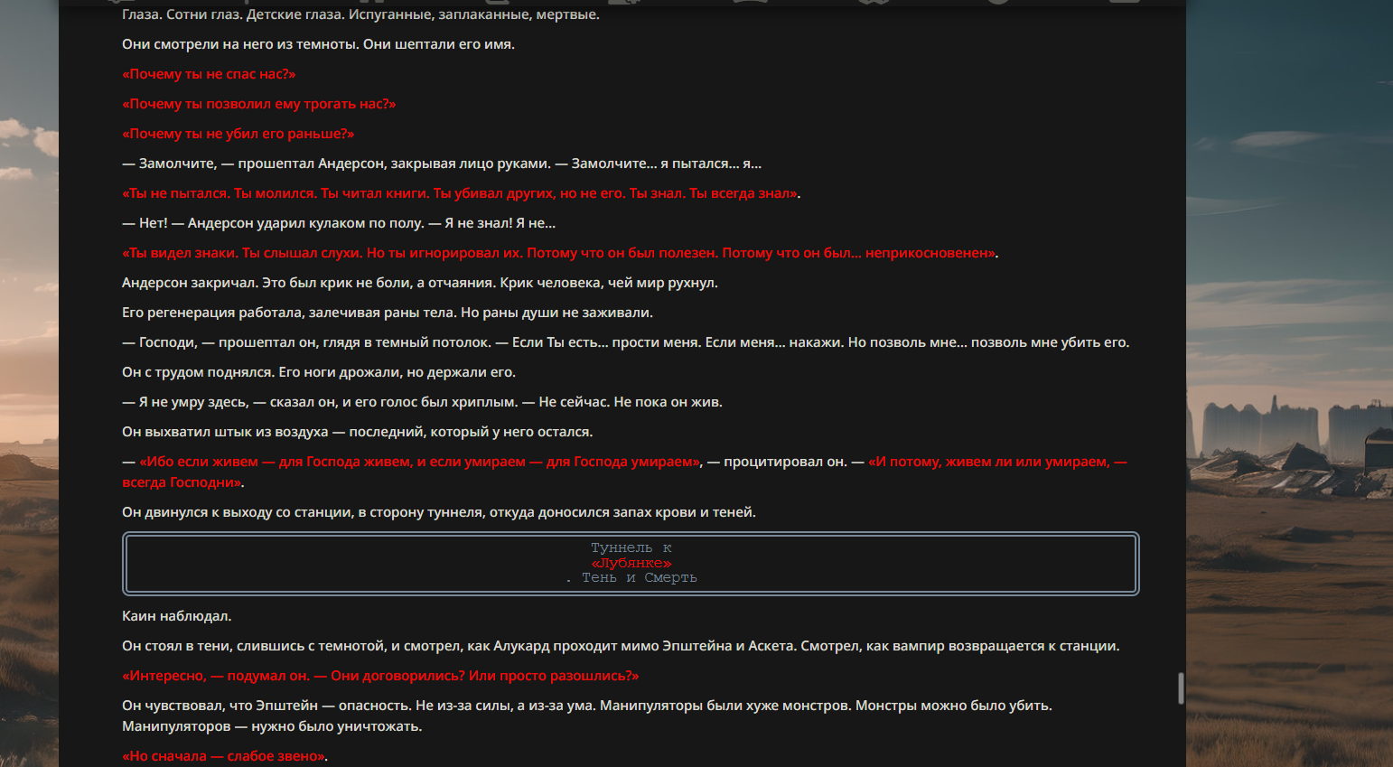 "Ты должен понять, что богу ты не нравишься! Он никогда тебя не хотел. И, скорее всего, он тебя ненавидит. Но это не самое страшное в жизни. К чёрту вечные муки, к чёрту искупление. Ты должен понять тот факт, что когда-нибудь ты умрёшь."