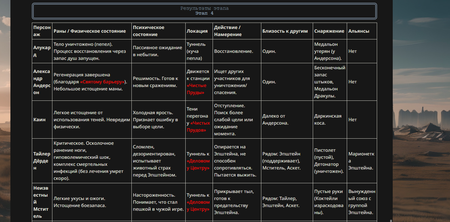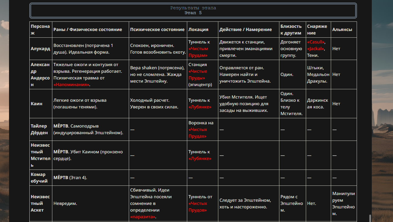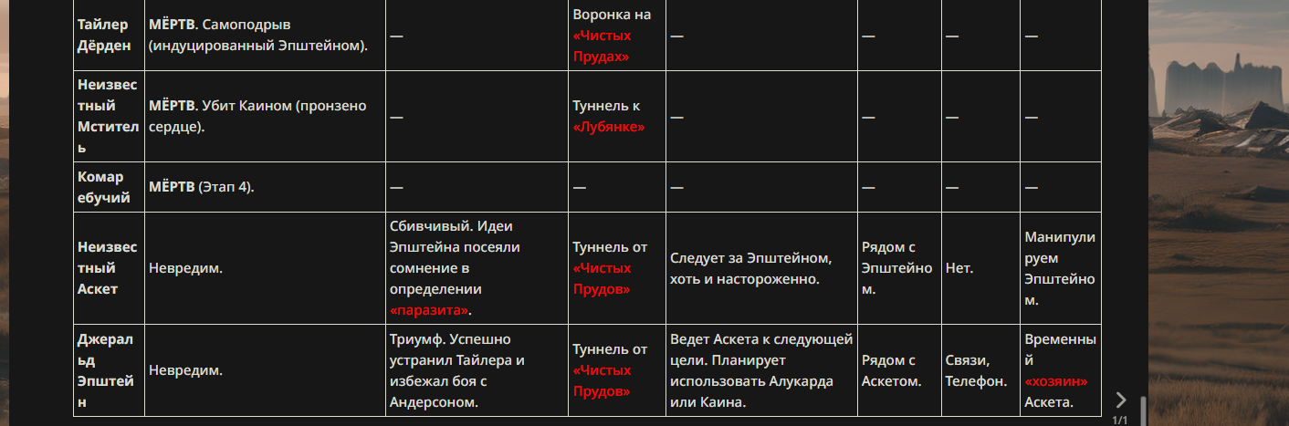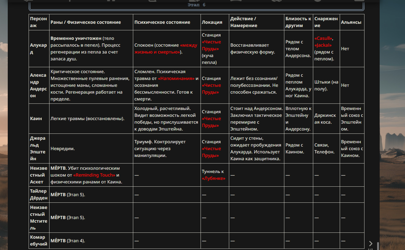 >>330710317 <character name="Генезис"> Истинное Имя: Генезис Класс: Assassin Источник: Техногенный апокалипсис / Концепция «Смерти Эволюции» Параметры: Сила: B (достаточно, чтобы блокировать удары) Выносливость: A Ловкость: A++ (способность реагировать на рывки Вескера) Мана: B Удача: C Благородный Фантазм: EX Классовые навыки: Скрытие присутствия (Ложное Эхо) A: Позволяет обманывать обостренные чувства Вескера, оставляя тепловые и звуковые фантомы. Мститель B: Чем выше самомнение противника (статус «Бога»), тем сильнее растут физические параметры Ассасина. Личные навыки: Analysis of the End (Анализ Распада) EX: Пассивный навык. Ассасин видит «точки кипения» вируса внутри тела Вескера. Каждое движение Вескера ускоряет его клеточный распад. Antigen Strike (Антигенный удар) A+: Атаки Ассасина наносят не физический, а биологический урон, блокируя регенерацию. Раны, нанесенные этим персонажем, не заживают, а начинают «гнить» на программном уровне. Reaction Speed: Overlimit B: Специальный режим, позволяющий воспринимать мир в замедленном темпе, что делает «телепортацию» Вескера бесполезной — Ассасин видит траекторию его движения заранее. Благородный Фантазм (NP): «Uroboros Paradox: The End of Evolution» (Парадокс Уробороса: Конец Эволюции) Ранг: EX Тип: Анти-Юнит (Специализирован на мутантах) Описание: Фантазм принудительно активирует финальную стадию мутации в теле противника. Вместо того чтобы дать силу, вирус в теле Вескера начинает пожирать сам себя. Вескер буквально «задыхается» от собственного метаболизма: его мышцы разрываются от чрезмерного роста, а разум коллапсирует. Чем больше Вескер пытается использовать свою силу «Бога», тем быстрее он превращается в бесформенную массу. </character>