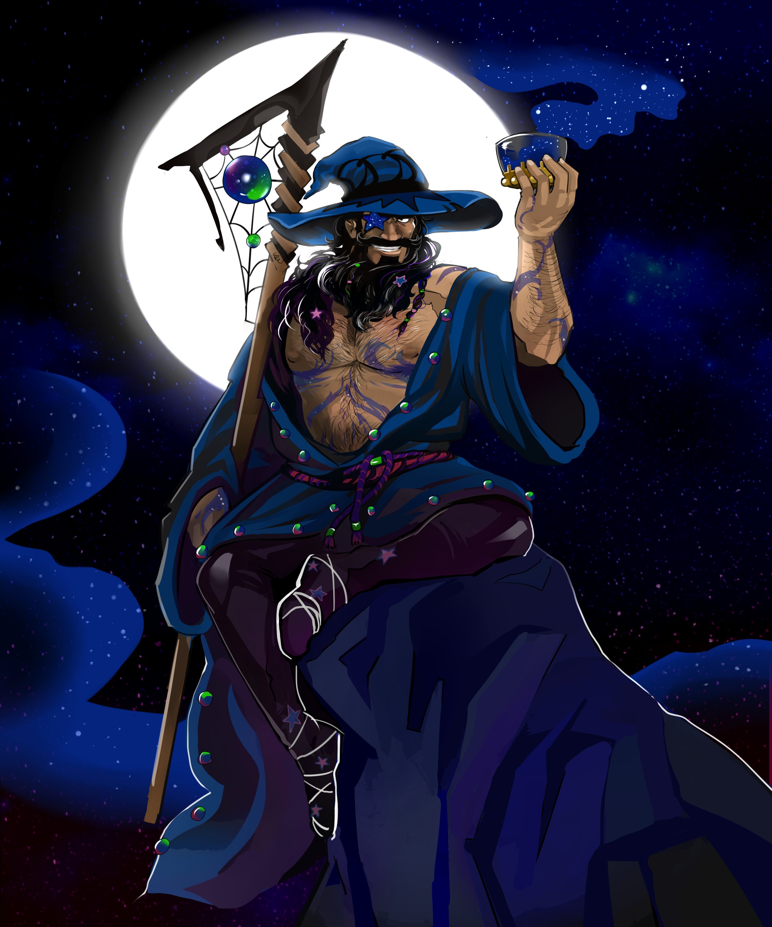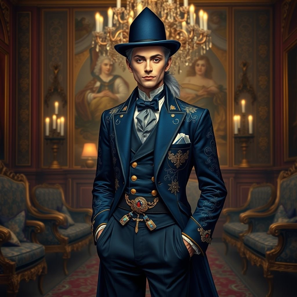 ##Biography Человек. Житель островной планеты. Один из прямых потомков великого мага Мерлина. Дальний родственник Зачарованного рыцаря. Потенциальный престолонаследник государства Золотой столицы. В истории своего государства он и его ветвь рода являют собой представителей партии ультраконсерваторов и прямых идеологов внутричиновничьего и преподавательского аппарата. Искренне убеждены в том, что пока проблема нашествия инопланетных бусурман учёных не будет решена - никаких реформ для государства не требуется. Из-за своих способностей и умением их максимально широко и разнообразно применять крайне успешно занимается мелкими интригами, подслушиванием и прочими коварными делами в абсолютной тайне. ##Внешность Сероволосый худощавый, но крайне рельефный молодой человек 24 лет. Волосы собраны в хвост на манер французского парика. Одет в специально вышитый родовой фрак темно синего цвета с золотыми нитками и родовыми инициалами. Одет также в форменное жабо. Брюки подстать фраку. На фоне такого агрессивно яркого прикида также выделяется необычный пояс с мелкими подсумками для его магических карт, треугольная синяя остроконечная шляпа и четки в кармане, сделанные из осколков кристалла чудес, что помогают ему во время перебирания бус восполнять запас магических сил при критическом истощении и успокаивают его. ##Характер ###1. Не смотря на чрезвычайную приверженность идеям своего рода, вне рабочей атмосферы на удивление является крайне компанейским парнем и душой компании. ###2. Темперамент крайне убедительного, в меру живого но не эмоционально агрессивного, язвительного шутника. При любом удобном случае любит находить чужие слабости и бесконечно беззлобно, но игриво тыкать об них других. ###3. Харизматичный и умеет впечатлить как в бою так и в общении. Настоящий боевой шулер. ###4. Крайне находчивый и способный в адаптацию (если ему удается выиграть время). Правда слабо умеет в чистую импровизацию. ###5. Нескрываемый сноб-элитарист, ксенофоб и ненавистник порождений зла. И наоборот - будет всеми силами пытаться договорится с тем, кто имеет признаки человека, знатного происхождения и порождения сил добра. ###6. После множества оборонительных сражений с пришельцами и ловли опасных магов - приобрёл невозмутимость к любым невероятно сильным и страшным существам. ###7. Если нет никого, кто бы мог отвлечь оппонента, то может совершенно спокойно заболтать противника, найдя тему для разговора, соответственно его характеру, темпераменту и складу ума (если тот вообще восприимчив на коммуникацию) ###8. В ином случае будет стараться скрыться с поле зрения, спрятавшись за что-либо и создавать следующие карты для дальнейших атак. ###9. Если есть возможность - будет всегда действовать скрытно, незаметно, изподтишка.