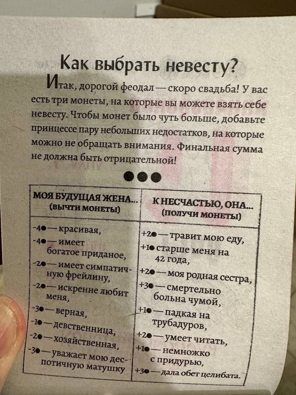 >>330798970 Имеет богатое приданое -4. Смертельно больна чумой. +3 Старше меня на 42 года +1 Дала обет целибата +3 На шесть монет бонуса иду гулять в кабак.
