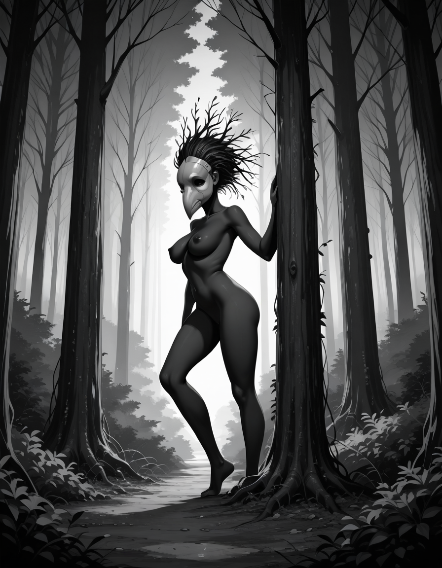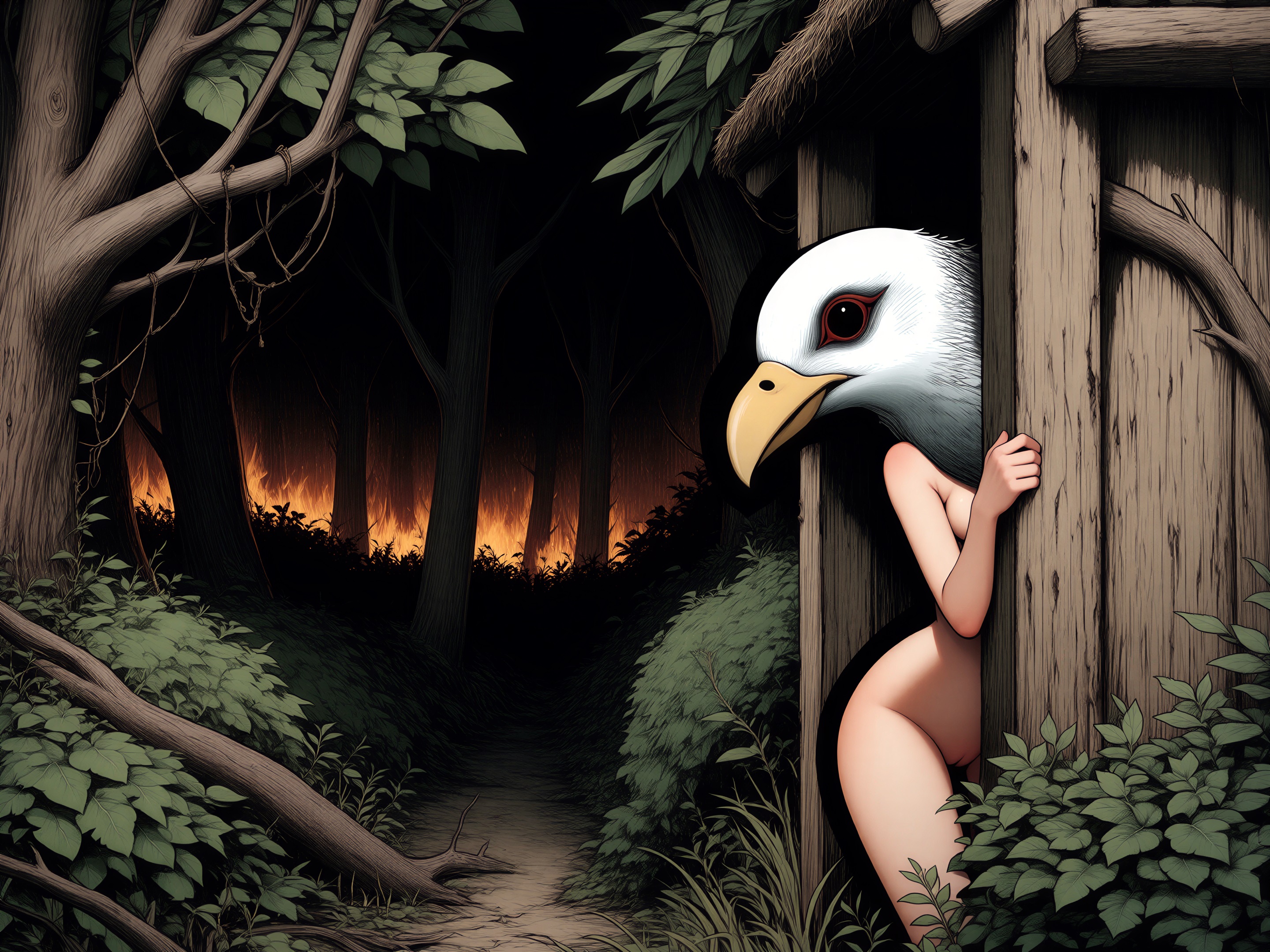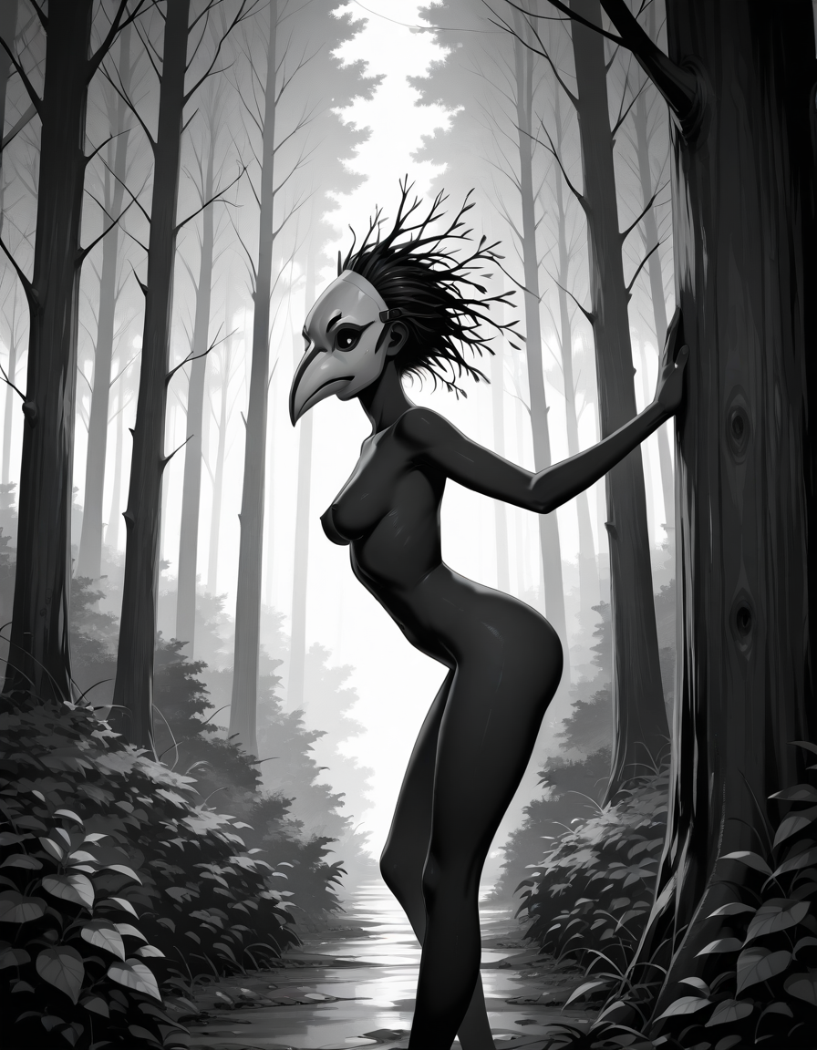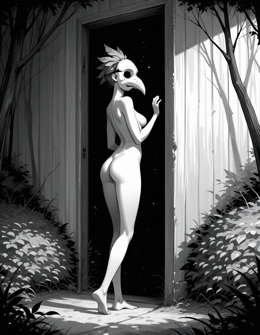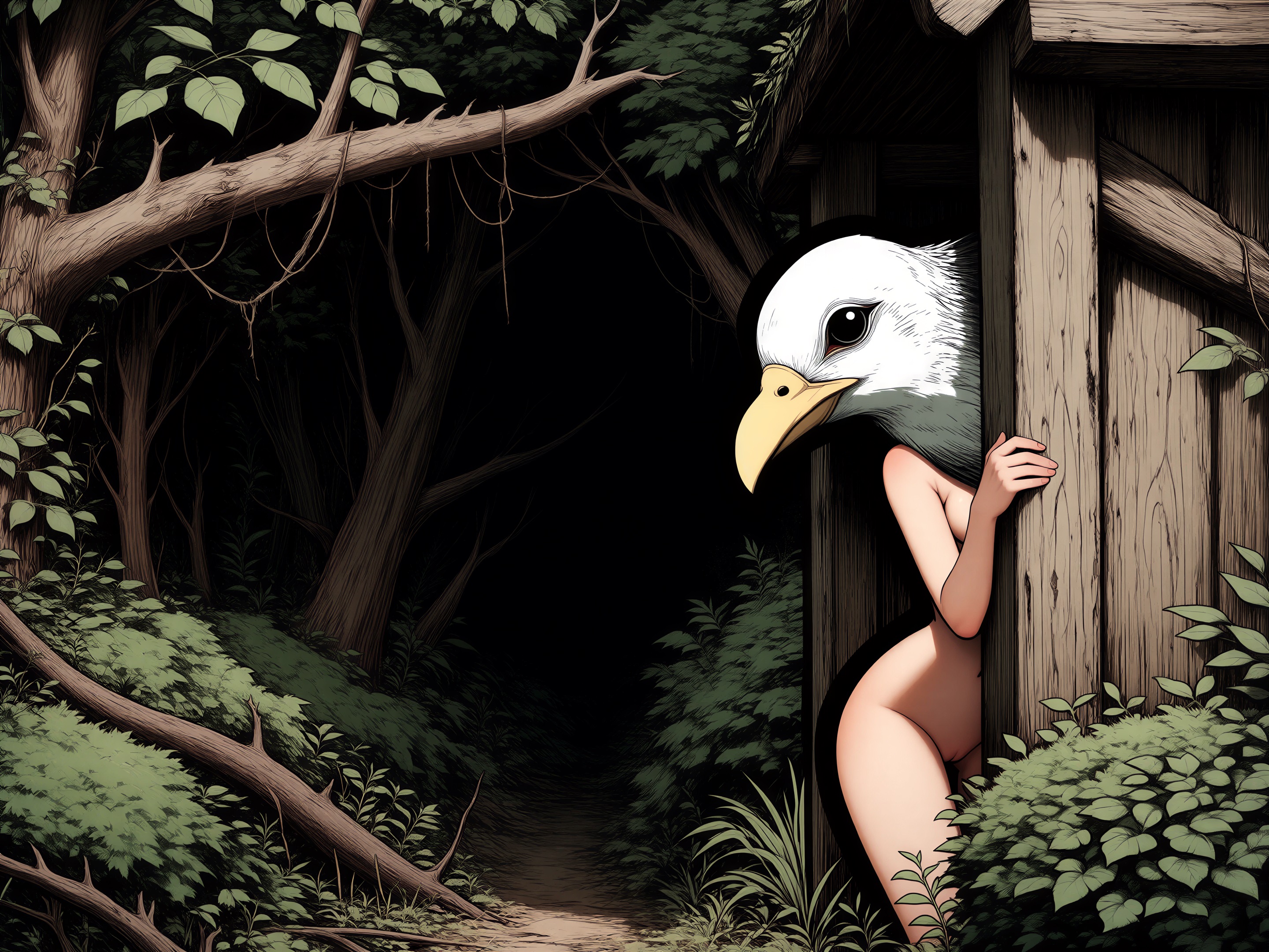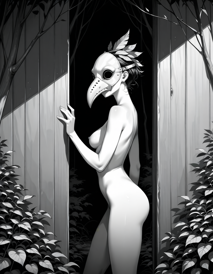 >>330788190 This eerie and atmospheric monochrome illustration depicts a highly surreal scene set within a dark, dense forest. A single female figure is hiding behind a rustic wooden wall or structure on the right side of the frame. She is completely nude, leaning out slightly to peek into the woods, which exposes her bare shoulder, arm, and a glimpse of sideboob. Her entire head is obscured by an oversized, slightly unsettling pigeon mask. The large, comical bird head contrasts sharply with the vulnerability of her bare human body, creating a deeply uncanny feeling. The background is engulfed in heavy shadows and filled with overgrown bushes, leafy branches, and dense foliage. The greyscale palette and deep shading enhance the mysterious, dreamlike, and creepy mood of the artwork.