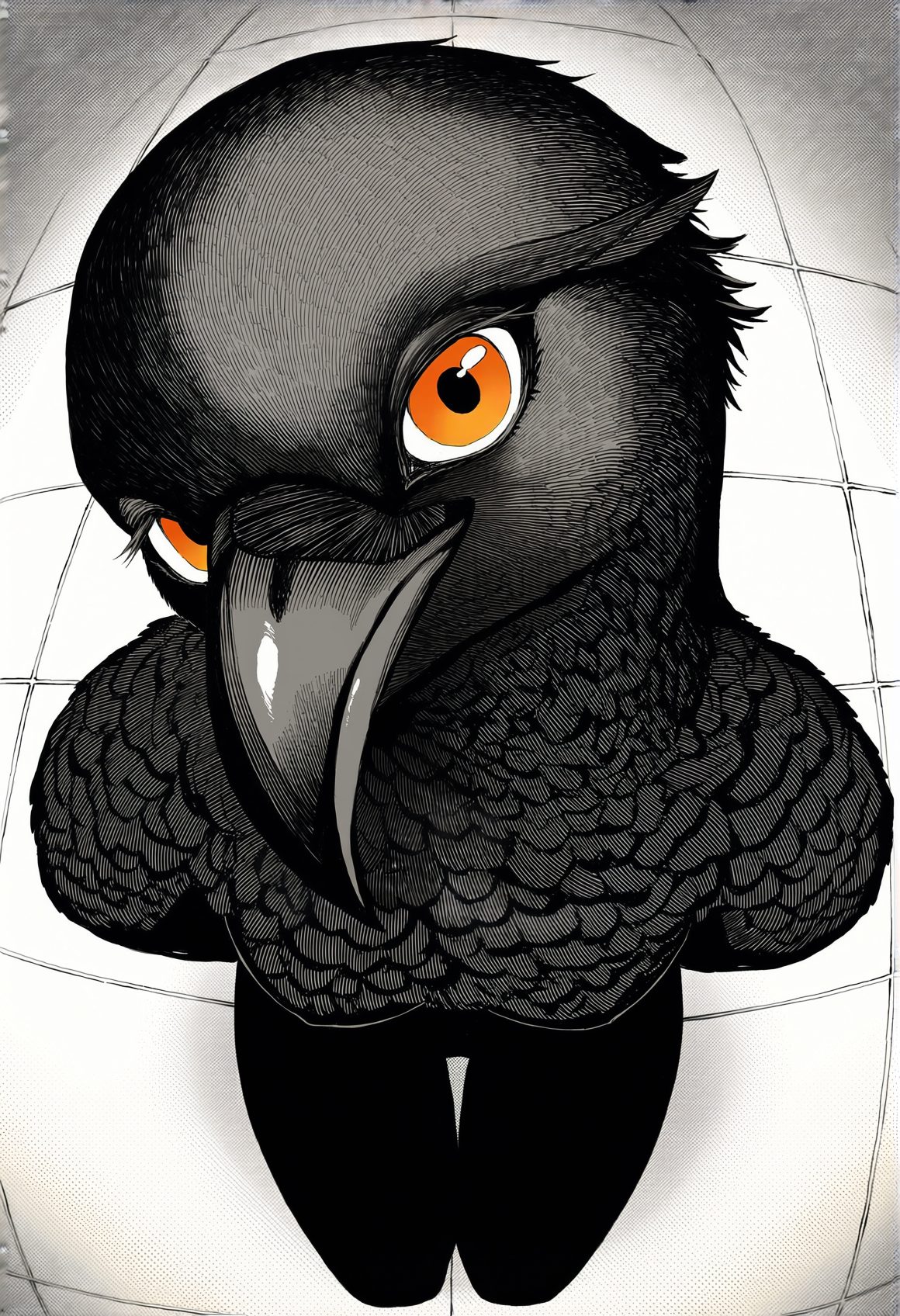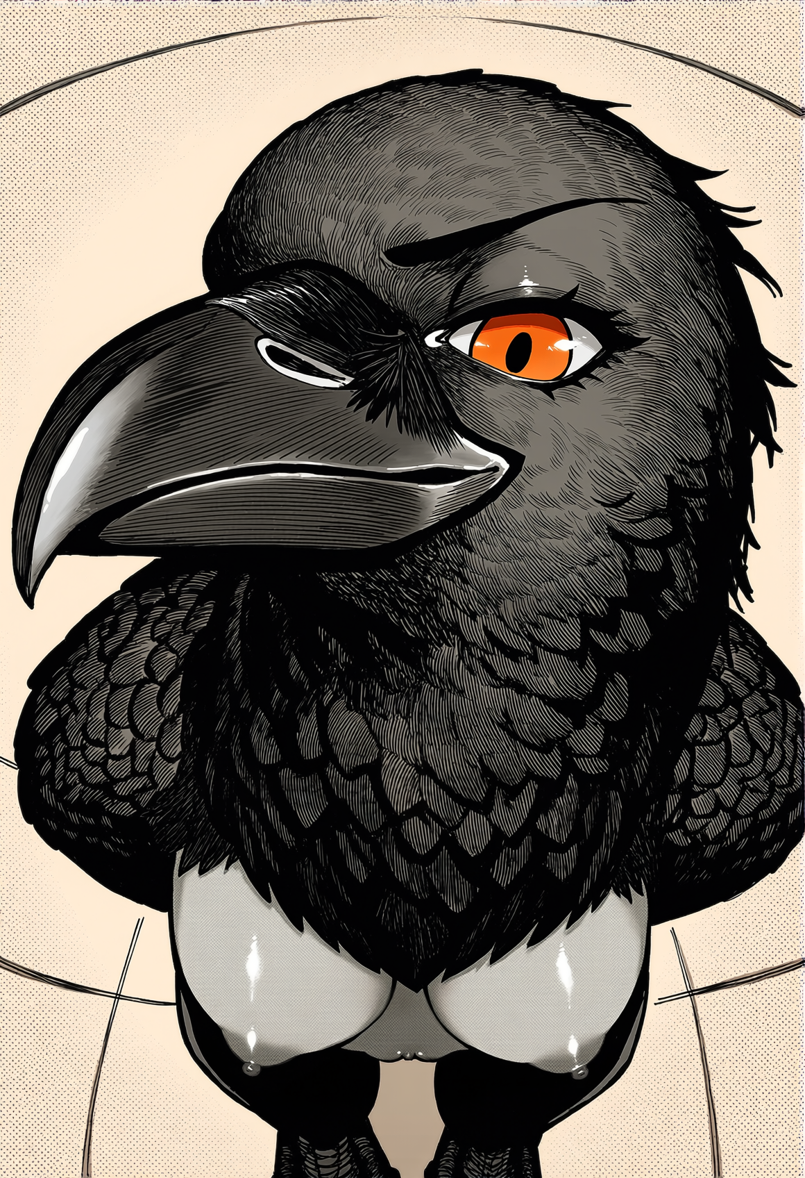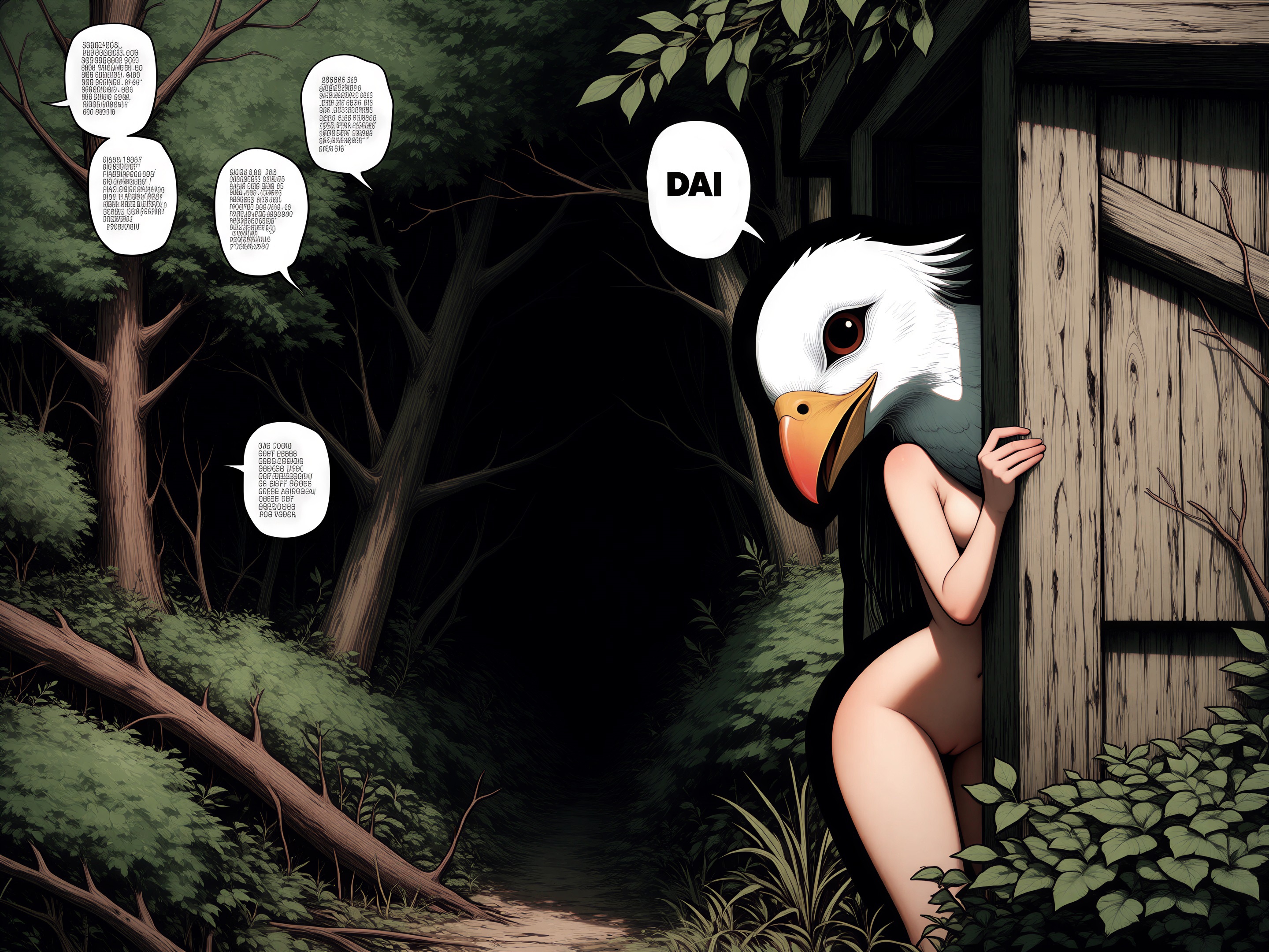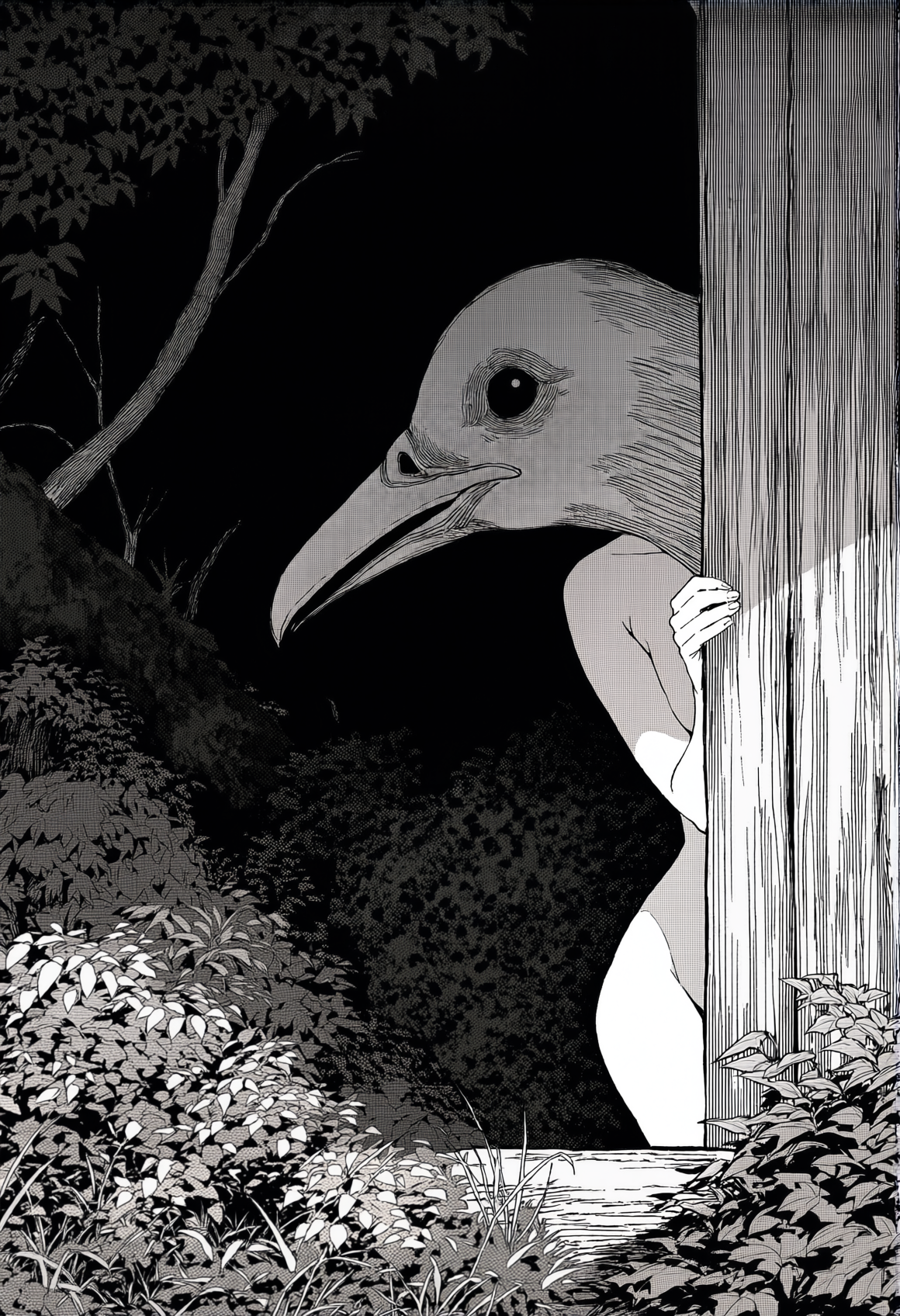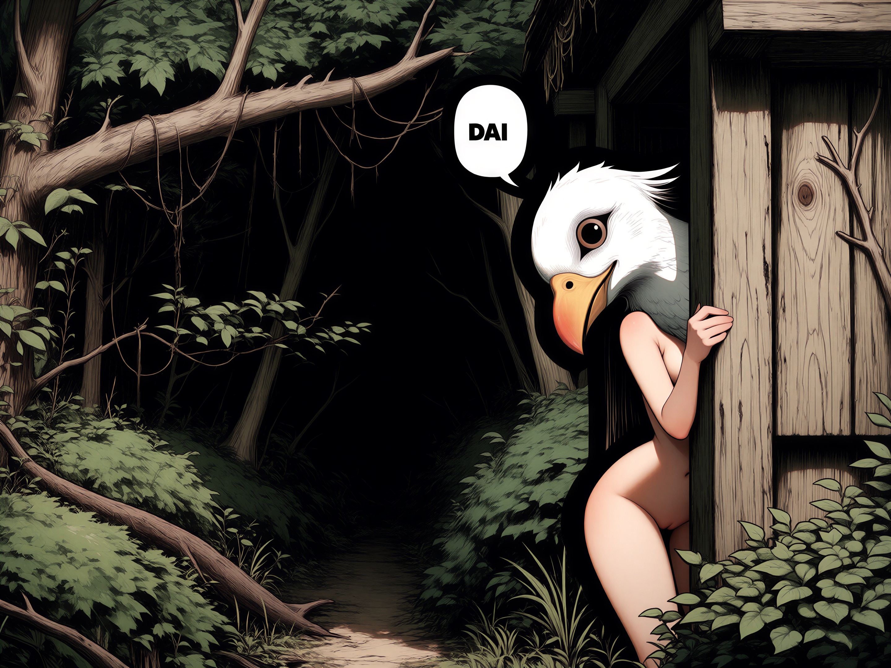 >>330788190 This eerie and atmospheric monochrome illustration depicts a highly surreal scene set within a dark, dense forest. A single female figure is hiding behind a rustic wooden wall or structure on the right side of the frame. She is completely nude, leaning out slightly to peek into the woods, which exposes her bare shoulder, arm, and a glimpse of sideboob. Her entire head is obscured by an oversized, slightly unsettling pigeon mask. The large, comical bird head contrasts sharply with the vulnerability of her bare human body, creating a deeply uncanny feeling. The background is engulfed in heavy shadows and filled with overgrown bushes, leafy branches, and dense foliage. The greyscale palette and deep shading enhance the mysterious, dreamlike, and creepy mood of the artwork.