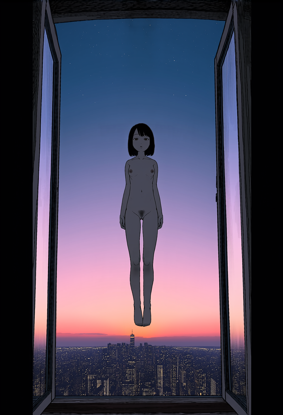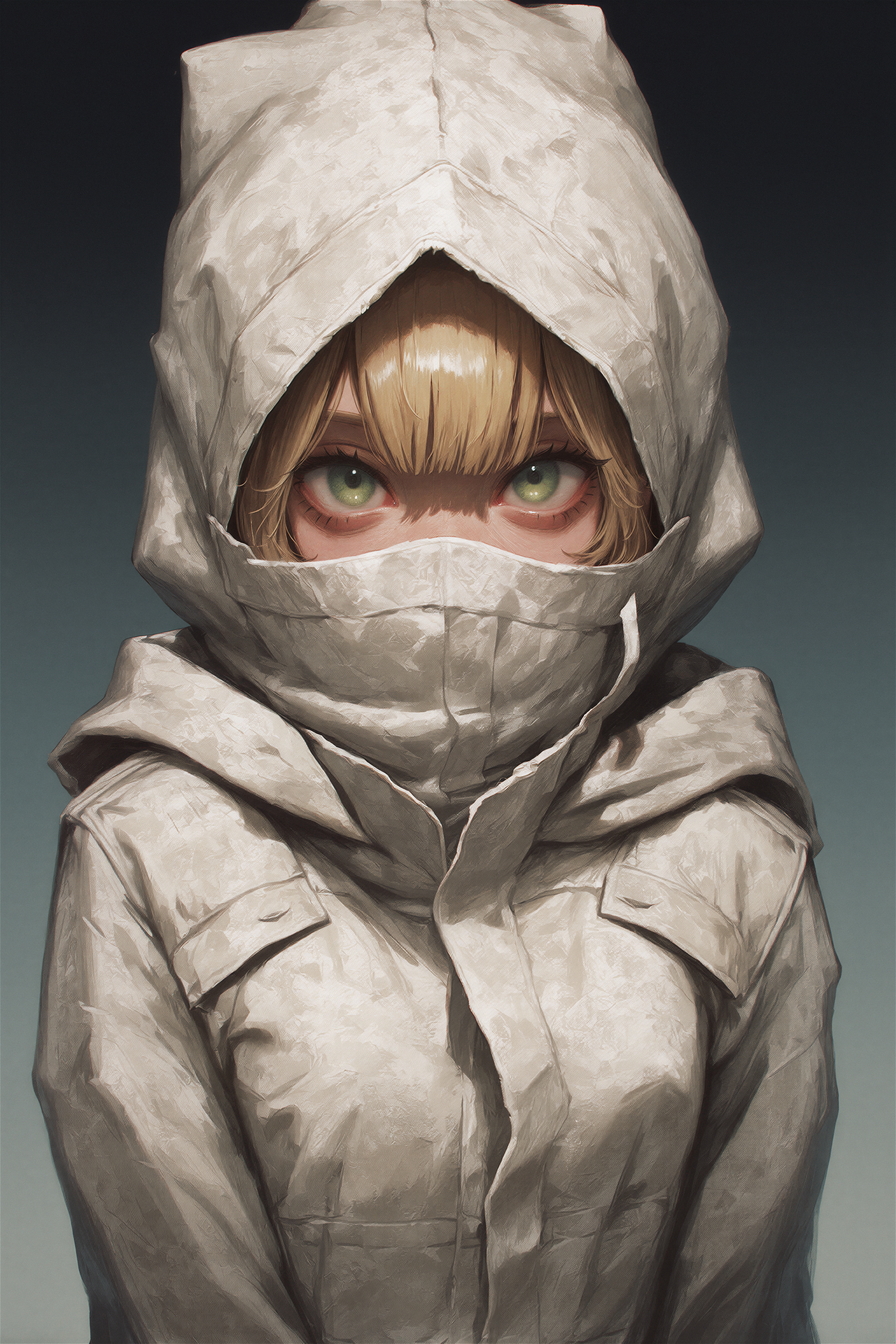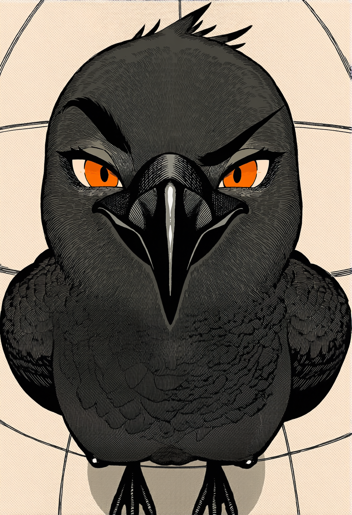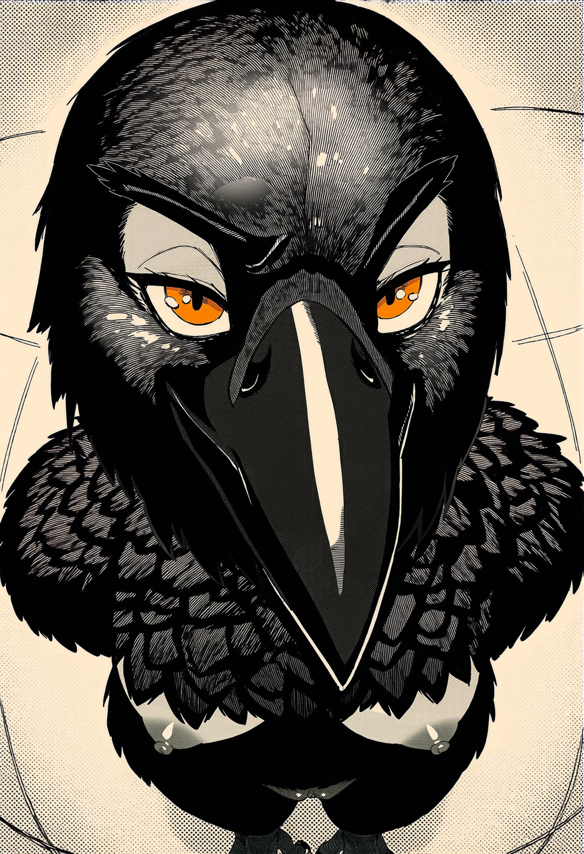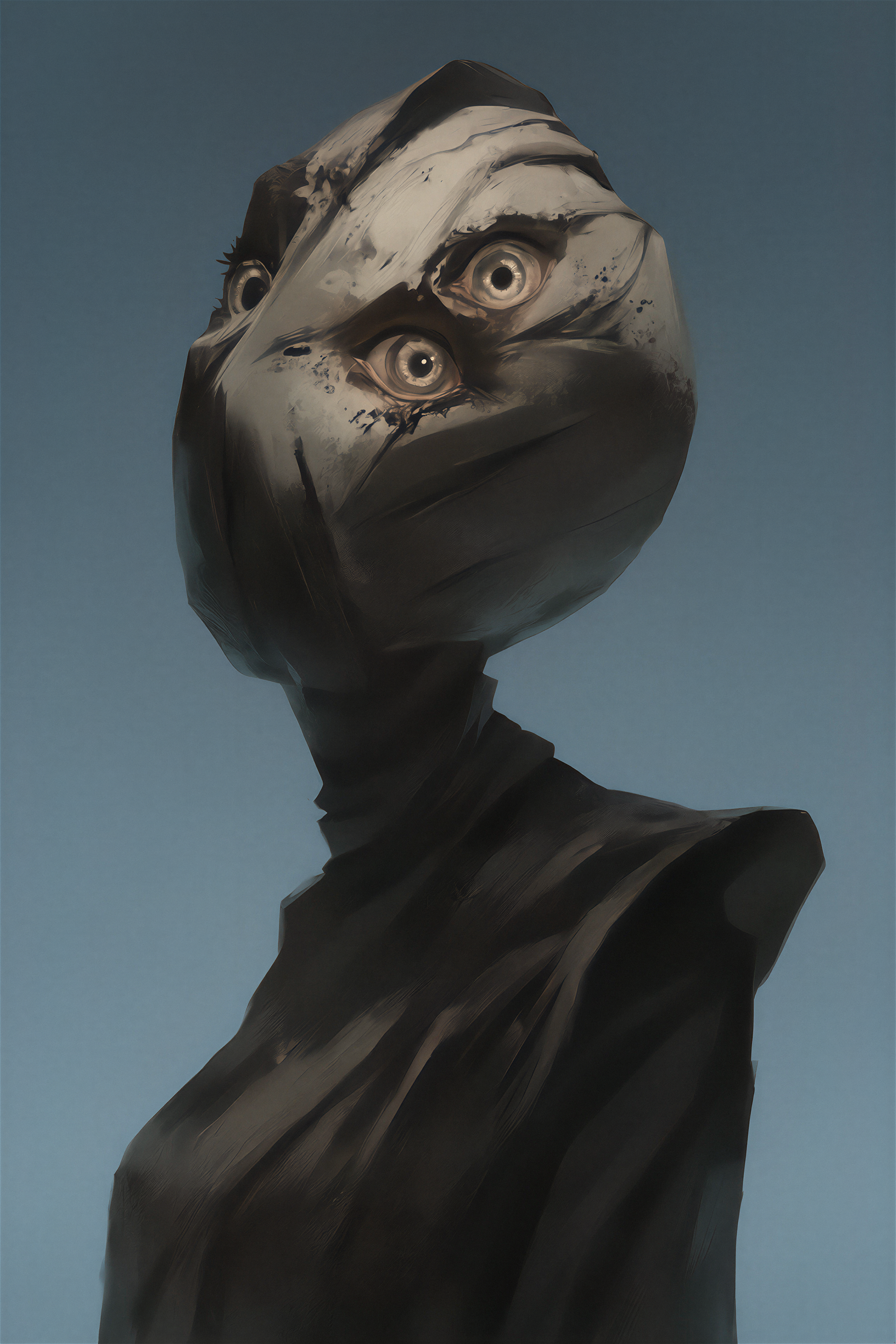 >>330788190 This eerie and atmospheric monochrome illustration depicts a highly surreal scene set within a dark, dense forest. A single female figure is hiding behind a rustic wooden wall or structure on the right side of the frame. She is completely nude, leaning out slightly to peek into the woods, which exposes her bare shoulder, arm, and a glimpse of sideboob. Her entire head is obscured by an oversized, slightly unsettling pigeon mask. The large, comical bird head contrasts sharply with the vulnerability of her bare human body, creating a deeply uncanny feeling. The background is engulfed in heavy shadows and filled with overgrown bushes, leafy branches, and dense foliage. The greyscale palette and deep shading enhance the mysterious, dreamlike, and creepy mood of the artwork.