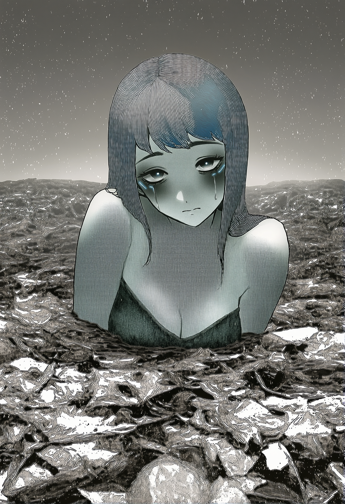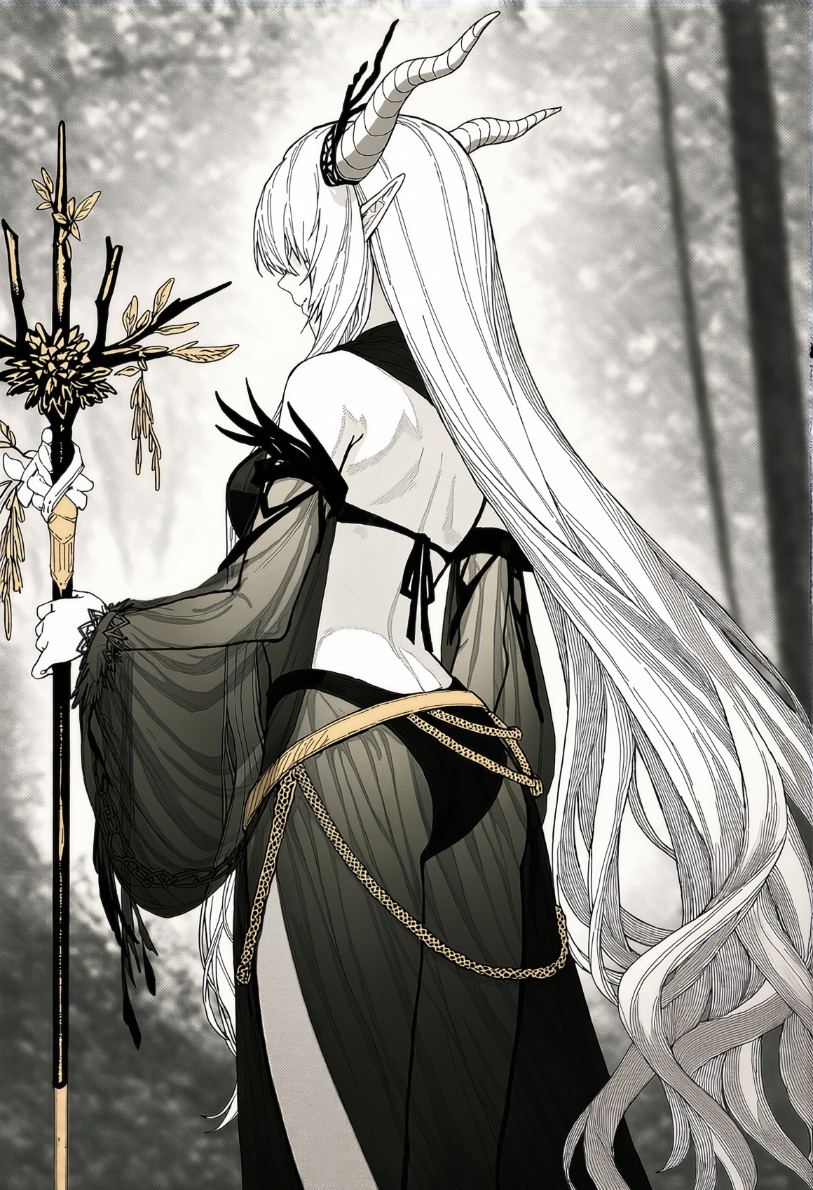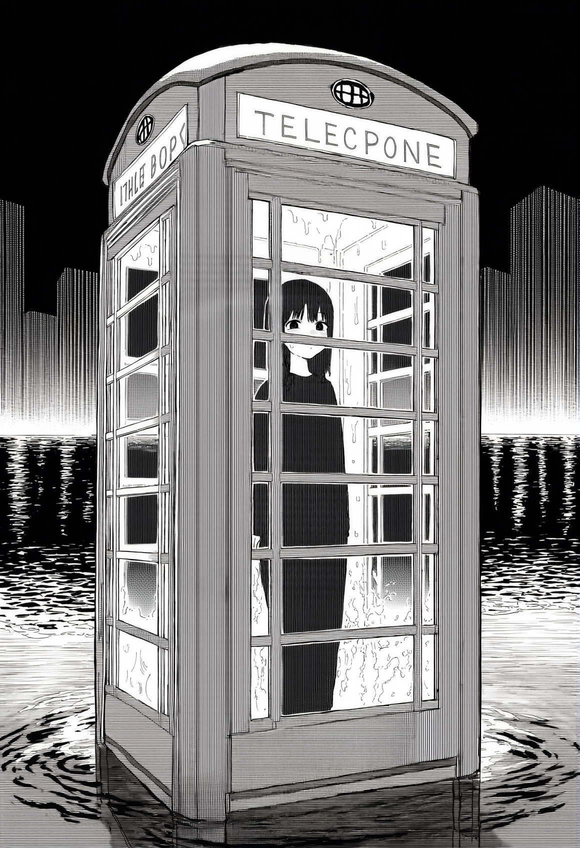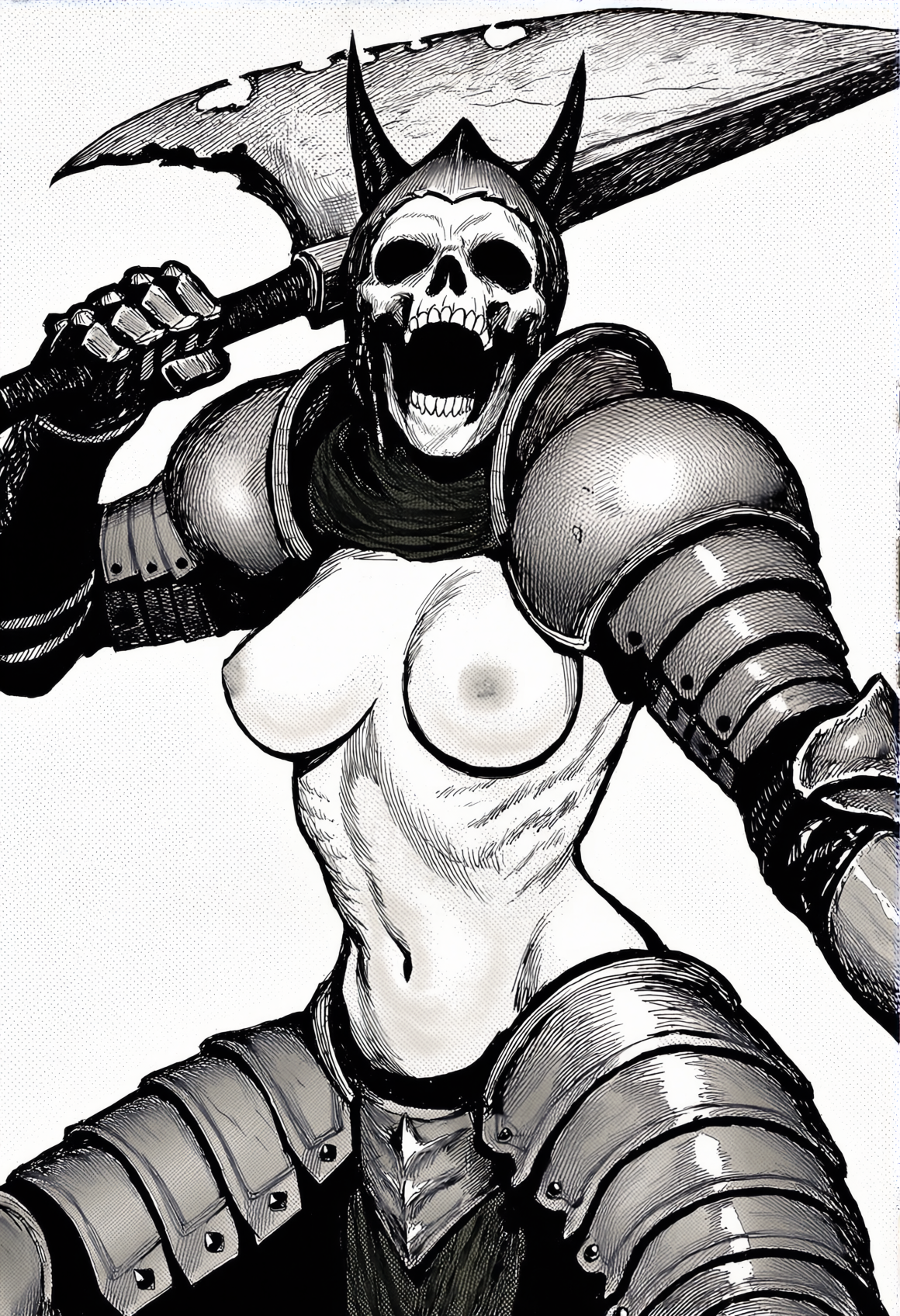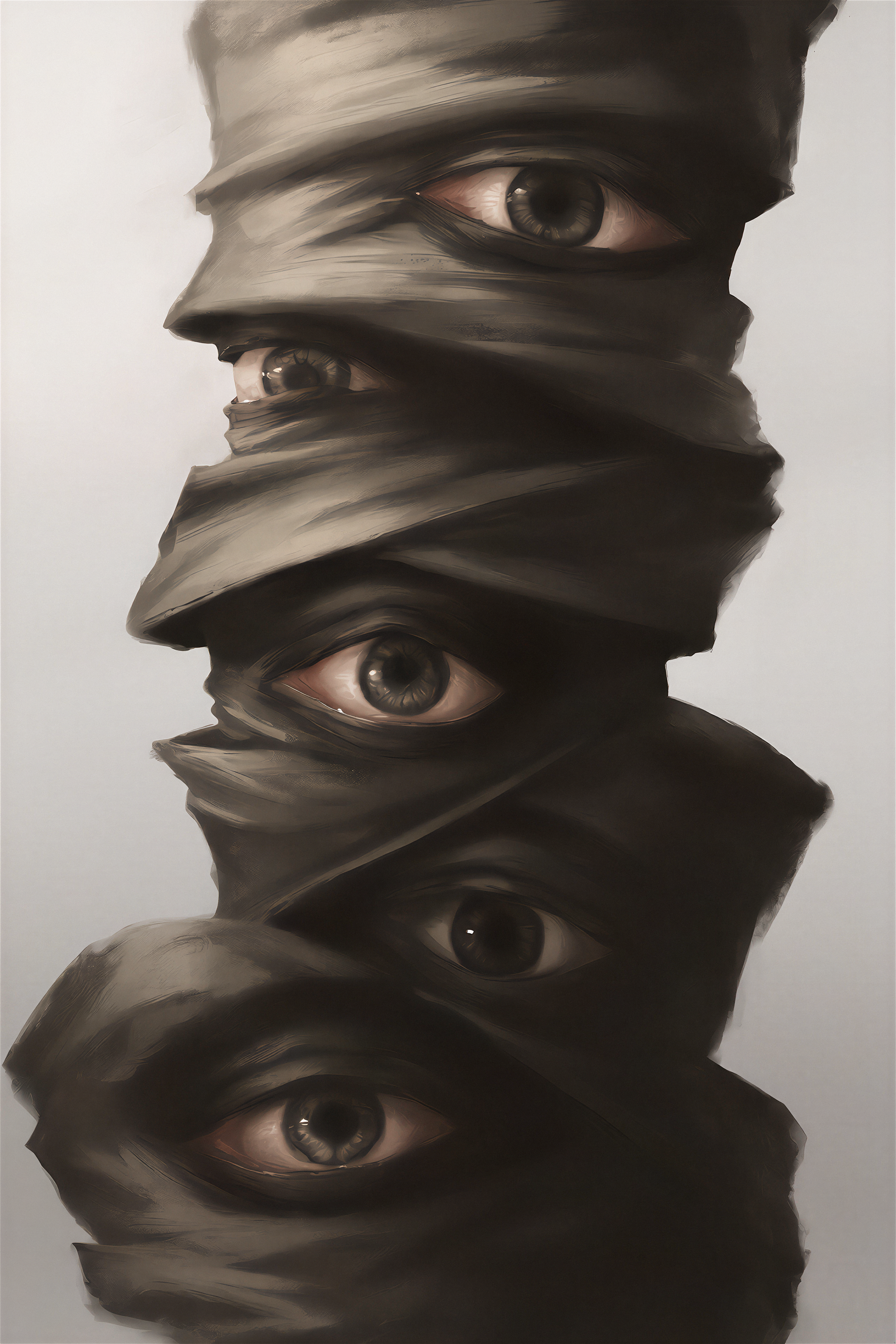 >>330788190 This eerie and atmospheric monochrome illustration depicts a highly surreal scene set within a dark, dense forest. A single female figure is hiding behind a rustic wooden wall or structure on the right side of the frame. She is completely nude, leaning out slightly to peek into the woods, which exposes her bare shoulder, arm, and a glimpse of sideboob. Her entire head is obscured by an oversized, slightly unsettling pigeon mask. The large, comical bird head contrasts sharply with the vulnerability of her bare human body, creating a deeply uncanny feeling. The background is engulfed in heavy shadows and filled with overgrown bushes, leafy branches, and dense foliage. The greyscale palette and deep shading enhance the mysterious, dreamlike, and creepy mood of the artwork.