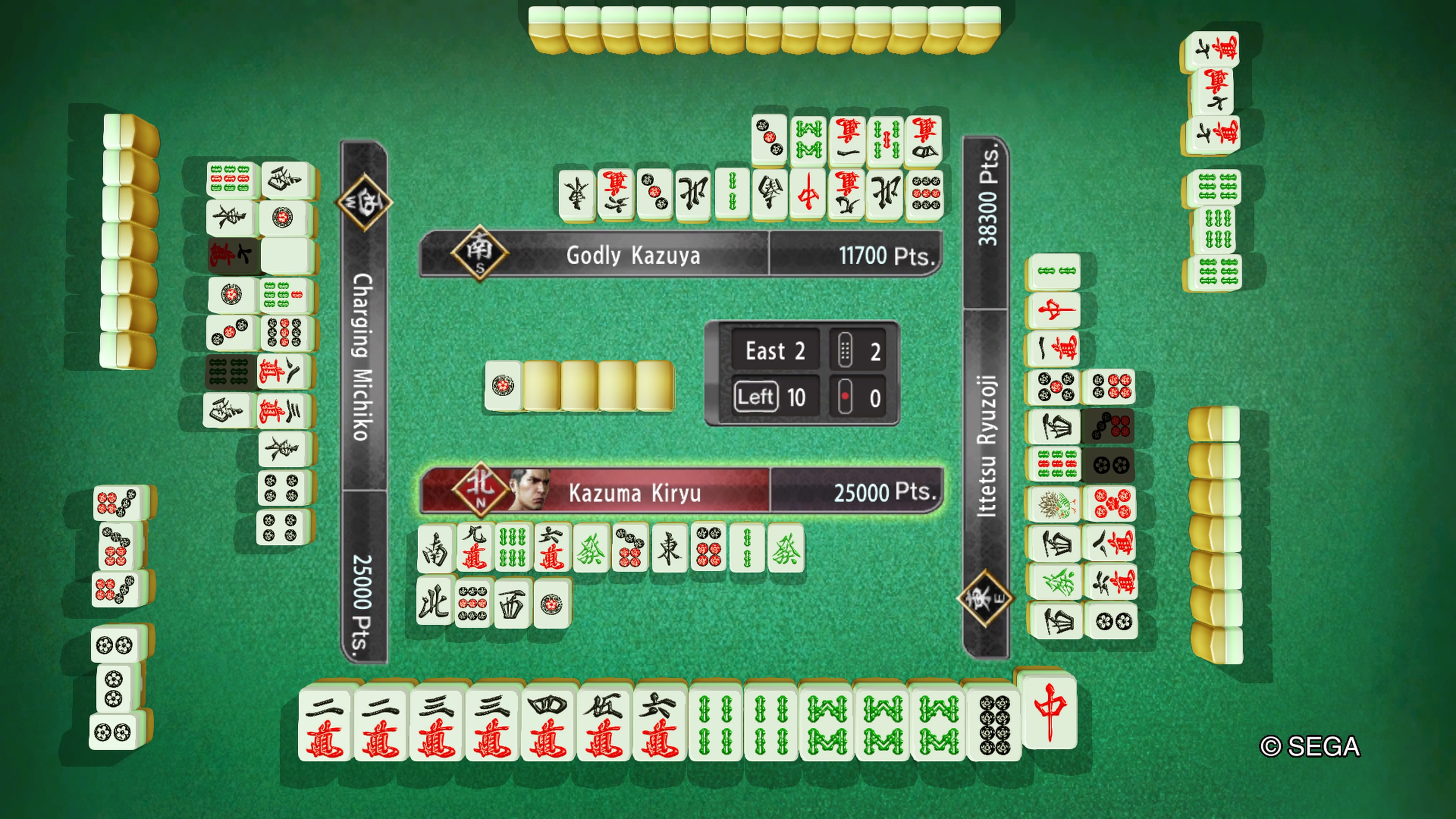 Примерно в 9 из 10 раундов, если я выхожу вообще, то выхожу с каким-нибудь говном, еле-еле набирающим 1-2 хана. То есть это либо голый риичи, либо все простые, либо пинфу, либо пон драконов. Изредка удается собрать семь пар, но не очень часто (рискую только если изначально в руке есть несколько пар + удобно кости со стены приходят под семь пар).