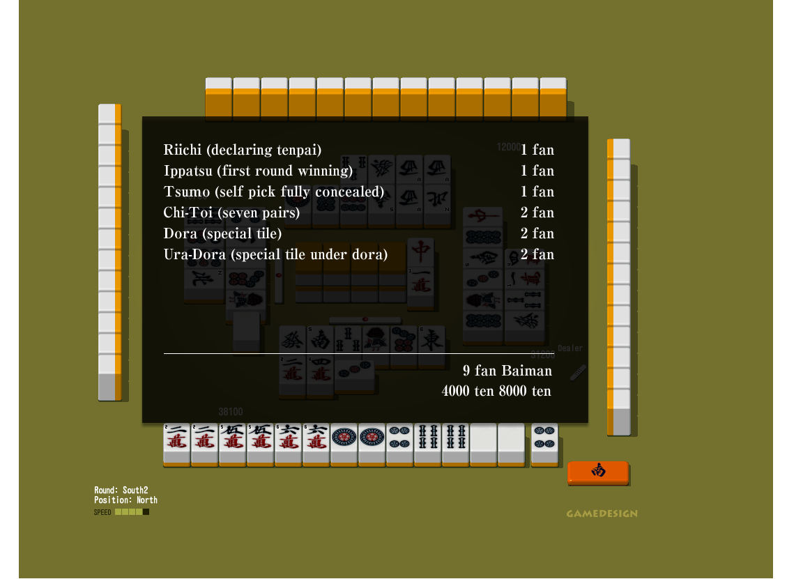 Японского не знаю, исследование гугл на русском/английском заканчивается на ока/ума. С ними всё понятно. Положим, при Ока 20, Ума 10/20 ханчан закончен +30, +5, -10, -25. Что дальше? Как из этого считаются выплаты? Пока я остановился на очевидном: если ты заканчиваешь -5, то платишь 5 денег. +10 — соответственно получаешь 10 денег. Всё правильно? По тому материалу о риичи-маджонге что я читал нельзя это ни подтвердить, ни опровергнуть.