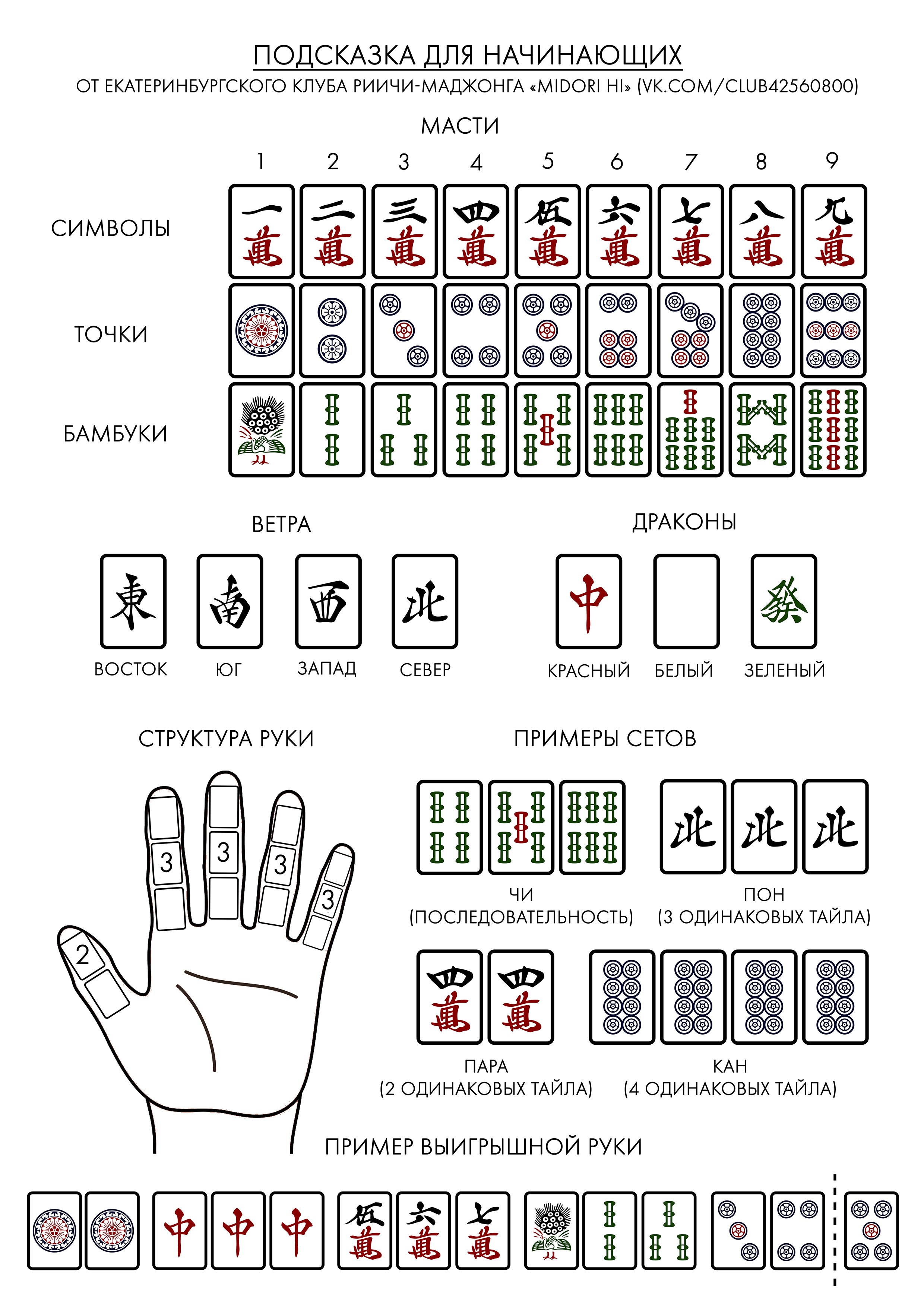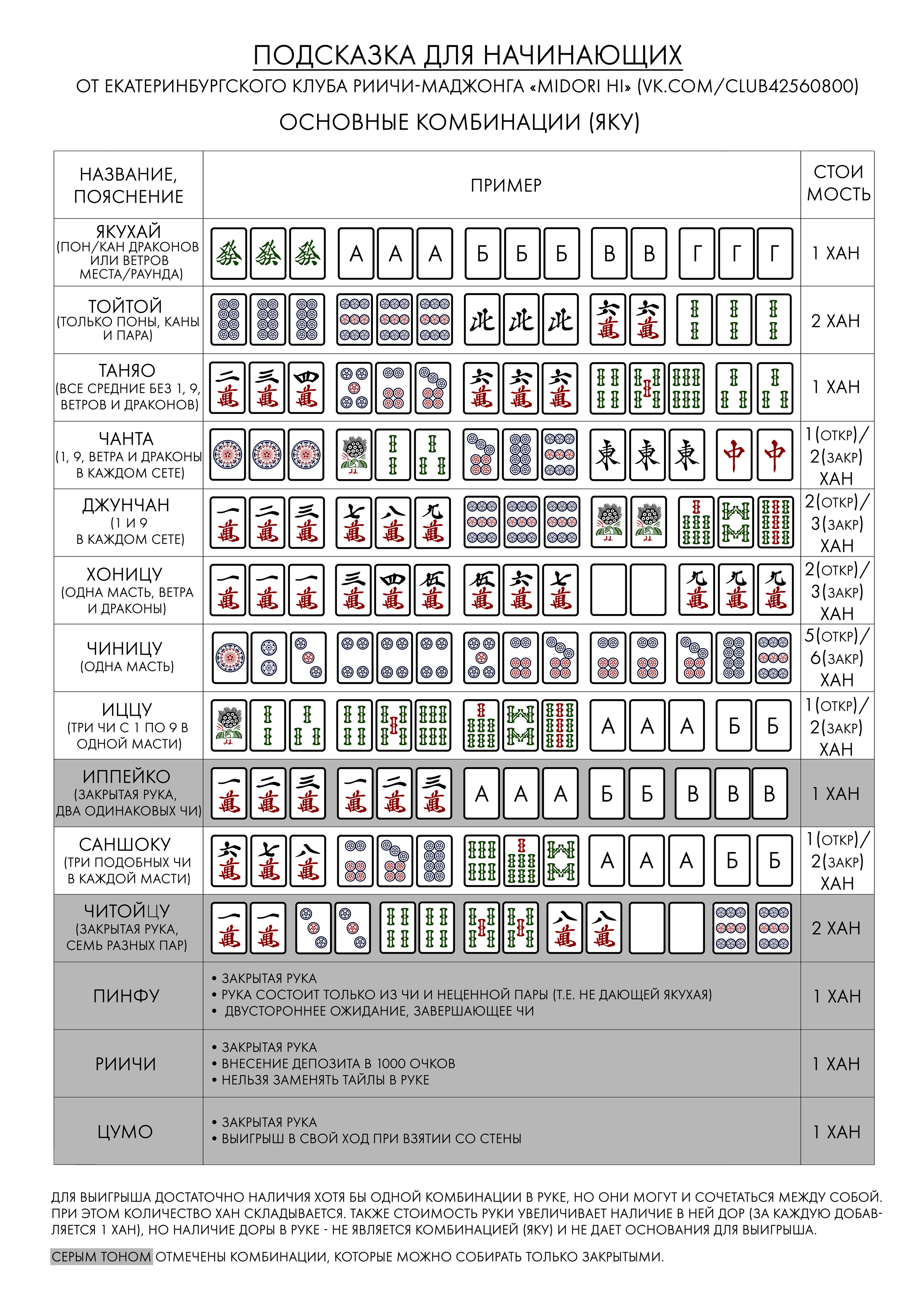 Обрати внимание на пинфу, эта штука хорошо комбуется с тем же таняо. Читани про хоницу - это одна масть с ветрами и драконами. Часто можно собрать читойцу - семь разных пар, или тойтой - рука на понах. Ну и по всему остальному глазами пробегись, чтобы быть в курсе.