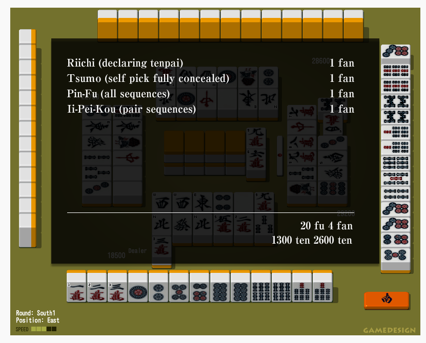 Секретная рука в три яку, легко становящаяся манганом — ментанпин. Когда ты кидаешь ричи, набрав таньяо и пинфу. Таким образом, у тебя уже минимум три яку, плюс могут вскрыться акадоры, а поскольку твоя рука плоская (из последовательностей), то велик шанс, что ты получишь дополнительные яку. И обычно у этой руки хорошее, богатое ожидание в ричи. И можно жадно грести с соседей.