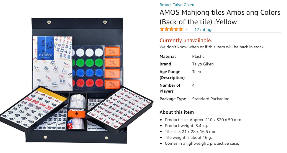 >>1575236 Пару месяцев назад заказывал себе набор маджонга. До этого еще столько же планировал и искал где взять. Основная трудность была в том, что я хотел кости с вполне определенным внешним видом. Как у тебя на пике, в маджонг соуле, в Акаги. Японский набор короче. На алике такие наборы встречаются, но тайлы там крохотные. Большие наборы (с крупным костями т.е.) там только с китайским стилем исполнения. Посмотрел предложения "с рук". На авито и пр., решил не связываться. Там какой-то ад творится. Нужный мне набор нашел на амазоне. Ехал из американского мухосранска в восточное Подмосковье. Цена, с доставкой, и сроки доставки - на пике. Растаможка нужна. Если надо, распишу подробней.