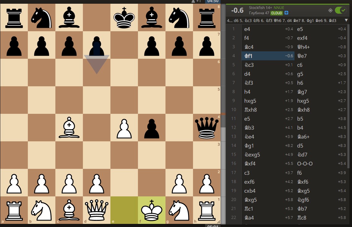 >>1623685 Попробуй такую хуйню поиграть, посмотри линии и позиции после популярных ответов. https://lichess.org/opening/Bishops_Opening_Calabrese_Countergambit/e4_e5_Bc4_f5 Если не разобравшись Фh5+ шленет, то после c3 все статистически неплохо у черных. Больших проблем нету, а темп белые на ход дважды ферзем потратили. Ну и с подготовки скорее всего собъет, если он просто развиваться как-то будет.