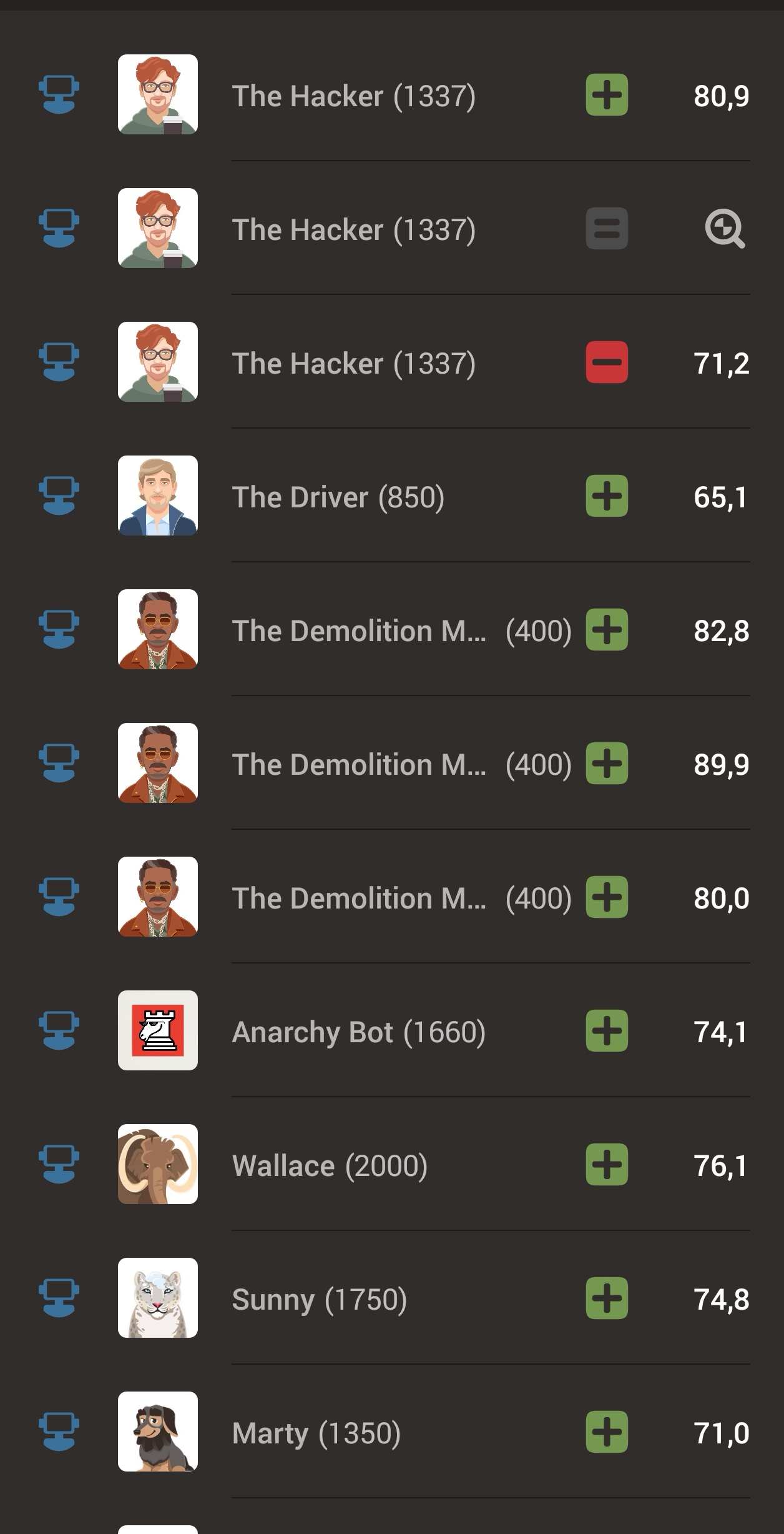 > Каждый раз рад победе над более сильным компом, но я так понял цифры у ботов нихуя не значат. Бывало довольно легко выигрывал комп посильнее, а бывает меня гнет 1300, но я так понял там главное разгадать стиль игры конкретного бота. Бесит что более слабый бот может ебануть какие то ходы безумные ! , когда падла видит что не в его пользу баланс. Боты тоже идут на хуй.